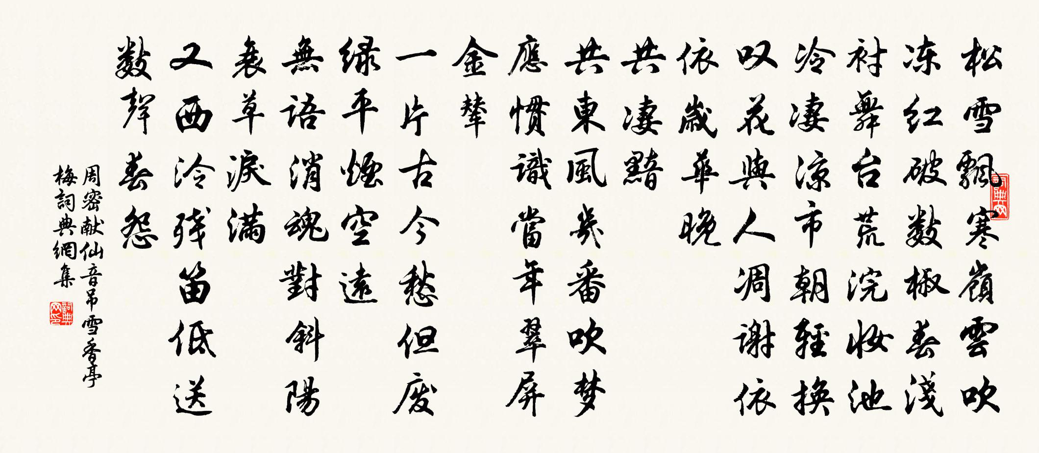 周密是個有氣節的詞人,南宋滅亡後,他堅決不仕元朝。這首詞是宋亡以後所作,通過寫梅花和前朝廢蕪的園林抒發自己對故國的懷念,對新朝的牴觸。根據他寫的《武林舊事》、《齊東野語》的記載:杭州葛嶺有集芳園,原是趙宋王朝的皇家園林,宋理宗時賜給賈似道,賈再修築,勝景不少,雪香亭便是其中之一,亭旁廣植梅花。宋亡之後,園亭荒蕪,周密來游而作此詞。