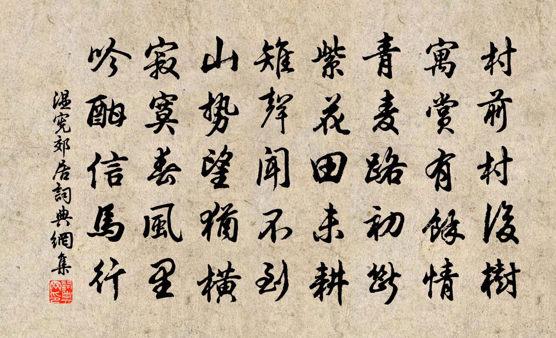 詩詞名句歷史字典書法欣賞書法字典國語詞典說文解字康熙字典古漢語字典標 題 作 者 詩 句 郊居作者:溫憲 朝代:唐代郊居原文村前村後樹,寓賞有餘情。青麥路初斷,紫花田未耕。雉聲聞不到,山勢望猶橫。寂寞春風裡,吟酣信馬行。詩詞問答問:郊居的作者是誰?答:溫憲問:郊居寫於哪個朝代?答:唐代問:郊居是什麼體裁?答:五律溫憲郊居書法欣賞郊居書法作品注釋全唐詩:卷667-41詩詞推薦郭氏山林十六詠閟雲關陸游〔宋代〕白雲如高人,擇友尚傲世。朱門客三千,一點不可致。偶成蕭立之〔宋代〕雨妒遊人故作難,禁持閒了下湖船。城中豈識農耕好,卻恨慳晴放紙鳶。挽劉宣教孝昌廖行之〔宋代〕夙世垂遺訓,書林早策勛。敬誠躋至善,師友富多聞。棠棣兩玉筍,閨門萬石君。九原那可作,惆悵哽飛雲。感夢韋應物〔唐代〕歲月轉蕪漫,形影長寂寥。仿佛覯微夢,感嘆起中宵。綿思靄流月,驚魂颯回飆。誰念茲夕永,坐令顏鬢凋。七夕詠懷梅堯臣〔宋代〕織女無恥羞,年年嫁牽牛。牽牛苦娶婦,娶婦不解留。來往一夕光,奕奕河漢秋。輕傳人世巧,未知何時休。喜鵲閨怨四首趙蕃〔宋代〕紅芳不可待,綠蔭忽已成。妾貌愧花好,郎姿如柳明。白蓮詩白玉蟾〔宋代〕淵明花歸西天,花不作東林花社。不見張昌宗,無人舉此話。誰家栽綠荷,薰風漾碧波。波底水晶空,化出玉姮娥龍門洞陸游〔宋代〕我來香積寺,清晨歷龍門。孤峰撐蒼昊,大壑裂厚坤。古穴吹腥風,峭壁掛爪痕。水浮石楠花,崖絡菖蒲根。橫策忘歸鄧深〔宋代〕端能來作棲霞侶,從他浮世悲今古。翻憐春色滿天台,劉阮掉頭留不住。自用韻再賦海棠舒岳祥〔宋代〕含羞滄海畔,移種蜀江乾。對此花枝重,不應詩語寒。半開須與醉,足睡更來看。說與花神道,當筵莫放殘。逍遙詠宋太宗〔宋代〕逍遙名不易,一法貫真宗。入位誰分別,深玄隱大功。杳冥難測度,象外理皆同。洞府群仙侶,三天順九重。效趙學士體成口號十章獻開府太師司馬光〔宋代〕首夏清和新雨晴,綠莎細軟不妨行。園夫遮道白何事,梔子花開斑筍行。蘇學十題公堂槐朱長文〔唐代〕五紀栽培後,三春長育中。靈根蟠故國,密葉蔭儒宮。患與般斤遠,歌宜魯藻同。先儒垂意遠,期此出三公。觀潮朱翌〔宋代〕海山不見兩螺青,但見橫江展玉城。動地鼓鼙飛屋瓦,刺天鬐鬣斗溟鯨。拍浮未見群兒弄,借拋須令萬楫迎。俄頃羨醉元稹〔唐代〕綺陌高樓競醉眠,共期憔悴不相憐。也應自有尋春日,虛度而今正少年。初入淮河四絕句楊萬里〔宋代〕船離洪澤岸頭沙,入到淮河意不佳。何必桑乾方是遠,中流以北即天涯。羅監廟輓詩魏了翁〔宋代〕春風擢擢秀階庭,歲晚悠然物外身。不把簪纓傷野趣,肯迂劍騎拂天真。種成墳上一枝桂,空老堂前百歲椿。鄉里城南雜詠二十首柳堤張栻〔宋代〕前年種垂柳,已復如許長。長條莫攀折,留待映滄浪。送趙將崇{上執下心}一首劉克莊〔宋代〕邊地猶防哨,中原屢失機。君豪橫槊去,吾老荷鋤歸。昔被毛錐誤,今恁羽扇揮。軍前需露布,陛下久宵衣。連陰欲雪排悶陸游〔宋代〕先生經旬甑生麈,藜羹不污白毛巾。魯連敢謂天下士,摩詰要是山中人。溪從灘瘦愈刻厲,山自木落增嶙峋。雲重名句推薦有田不耕倉廩虛,有書不讀子孫愚。佚名《增廣賢文·上集》 恐是仙家好別離,故教迢遞作佳期。李商隱《辛未七夕》 呼兒將出換美酒,與爾同銷萬古愁。李白《將進酒》 曉月墜,宿雲微,無語枕頻欹。李煜《喜遷鶯·曉月墜》 直須看盡洛城花,始共春風容易別。歐陽修《玉樓春·尊前擬把歸期說》 二客東南名勝,萬卷詩書事業,嘗試與君謀。辛棄疾《水調歌頭·舟次揚州和人韻》 眾里嫣然通一顧,人間顏色如塵土。王國維《蝶戀花·窈窕燕姬年十五》 草螢有耀終非火,荷露雖團豈是珠。白居易《放言五首·其一》 晝成淒黯,雁飛過、垂楊轉青。吳文英《慶 * ·秋感》 相逢意氣為君飲,系馬高樓垂柳邊。王維《少年行四首》