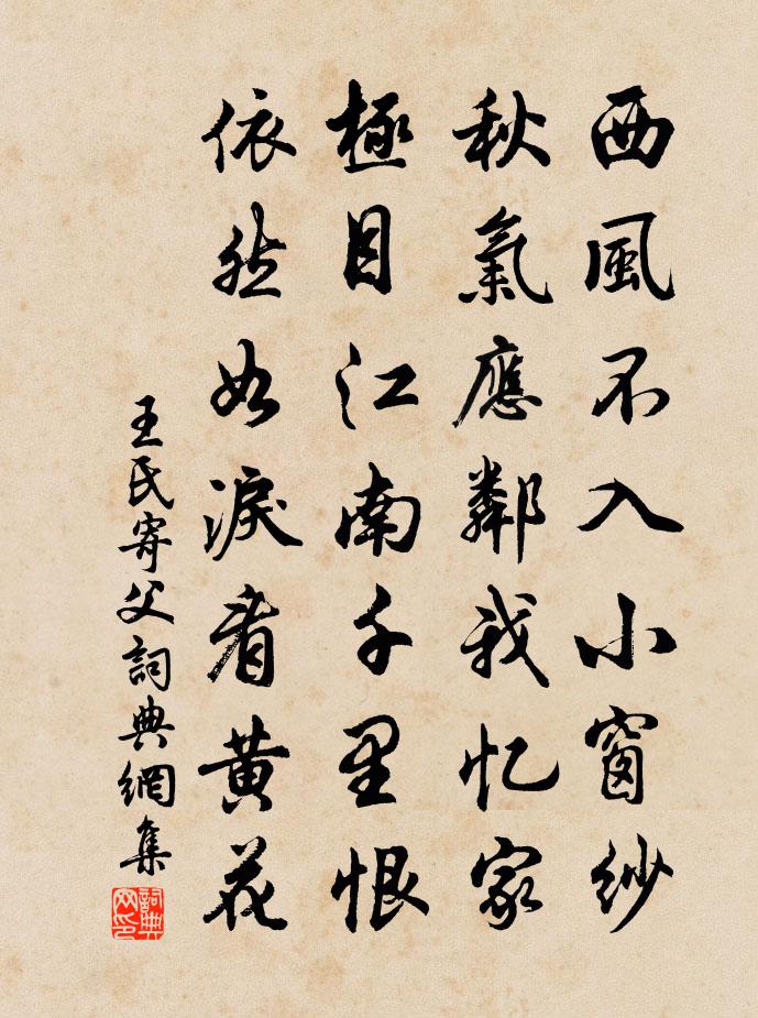 詩詞名句歷史字典書法欣賞書法字典國語詞典說文解字康熙字典古漢語字典標 題 作 者 詩 句 寄父作者:王氏 朝代:宋代寄父原文西風不入小窗紗,秋氣應鄰我憶家。極目江南千里恨,依然如淚看黃花。詩詞問答問:寄父的作者是誰?答:王氏問:寄父寫於哪個朝代?答:宋代王氏寄父書法欣賞寄父書法作品詩詞推薦席上勸客酒陳師道〔宋代〕稍開襟抱使心寬,大放酒腸須盞乾。珠簾十里城南道,肯作當年小杜看。粉蝶兒姬翼〔元代〕嚼蠟塵情,誰知淡然無味。販何樓、一場兒戲。看成空,渾不懂,夢中身世。謾橫陳,使機關、到頭何濟。省後俱懷洞庭齊己〔唐代〕憶過巴陵歲,無人問去留。中宵滿湖月,獨自在僧樓。漁父真閒唱,靈均是謾愁。今來欲長往,誰借木蘭舟。月照梨花(閨思)陸游〔宋代〕霽景風軟,煙江春漲。小闔無人,繡簾半上。花外姊妹相呼。約樗蒲。修蛾忘了章台樣。細思一餉。感事添惆悵。和邵不疑校理蒲州十詩芙蕖軒司馬光〔宋代〕荷花爛熳紅,不見方塘水。岧嶢結飛閣,苒惹清香里。露重忽欹側,翩然翠禽起。謁龍門無畏師塔祈雨作宋庠〔宋代〕梵聖遺靈骨,洪緣福故都。慈深雲不斷,法遍雨常俱。使節開真槨,天香奉供爐。拳拳依帝力,餘潤冀昭蘇。涉漢至隆中有感項安世〔宋代〕曉渡漢水陽,平川去如掌。春深風日老,雨後桑麻長。麥田渺無際,竹墅清可賞。家家傍林落,往往成族黨。溪頭飛仙道中李新〔宋代〕鳥銜桃李墮高卑,陵谷逢春花作衣。猶憶去年攜小筥,上山獨自采春薇。澗流到海住家處,今我無家何更歸。修途題資州東岩鄭鋼〔宋代〕逕轉得幽谷,雲岩屹相向。谽谺偃重檐,彎環依疊嶂。緬想融結初,鐫鑱自天匠。了無斧鑿跡,但覺盤根壯。深可懷翁宏王元〔唐代〕獨夜思君切,無人知此情。滄州歸未得,華發別來生。孤館木初落,高空月正明。遠書多隔歲,獨念沒前程。西江月姬翼〔元代〕挾策亡羊莫問,覆蕉失鹿休窮。大家都在夢魂中。夢裡重重作夢。具足元亨貞利,圓明微妙玄通。眨眉目擊莫形容寄送梁子輔赴召李流謙〔宋代〕山嶽自高百穀下,向來無物使之者。驊騮合奉鸞和車,豈與黔蹄同一駕。英奇絕代難小了,泥滓投之輒悲咤。一朝武擔西台和師文作孫應時〔宋代〕西台在保許,秋劃暮雲間。十畝有餘竹,一窗無數山。望遠足離思,憂時多苦顏。相看終惜醉,更挈酒瓶還。四賢一不肖詩右余安道蔡襄〔宋代〕南方之強君子居,卓然安首襟韻孤。詞科判等屢得雋,呀然鼓焰天地罏。三年待詔處京邑,斗粟不足榮妻孥。耳聞卜運算元郭應祥〔宋代〕客以賞之,仍呼侑尊者六輩,酒半,人簪其一,恰恰無欠余。因賦誰把洛陽花,翦送河陽縣。魏紫姚黃此地無,隨戲呈趙舜臣覓酒二首姜特立〔宋代〕畢君瓮下心成縛,屈子江邊又獨醒。賴有東陽賢府主,不嫌馳騎送寒廳。見兒侄唱酬次韻五首蘇轍〔宋代〕兒病要須閒,閒極自成趣。空虛雖近道,懶拙初非悟。偶將今生腳,還著古人屨。大小適相同,本來無別處。建炎庚戌中秋夜與同官相期於月下既為頑雲障馮時行〔宋代〕玉皇敕諸天,茲夕盡群見。驅雲收月光,反照玉京宴。老龍翻海窟,沓靄郁萬變。天公有嚴令,遺隙無一紅。蕭蕭明發陳公徑過摩舍那灘石峰下十首楊萬里〔宋代〕後顧江已遠,前睨山若寒。棹進岸自回,天水未有極。簾欣入絕巘,舟愕觸潛石。東暾澹未熹,北吹寒更寂。岸草過杜北山老友舊居顧逢〔宋代〕曲院猶存破屋斜,北山老子舊詩家。往來多少人惆悵,只見山茶一樹花。名句推薦軍中宜劍舞,塞上重笳音。張說《幽州夜飲》 女兒年幾十五六,窈窕無雙顏如玉。蕭衍《東飛伯勞歌》 同居長乾里,兩小無嫌猜。李白《長干行二首》 客子光陰詩卷里,杏花訊息雨聲中。陳與義《懷天經智老因訪之》 亂世用能,平則去患。來俊臣《羅織經·控權卷第四》 善御性者,不違金水之質;善為器者,不易方圓之用。姚察、姚思廉《梁書·列傳·卷二十一》 恩宜自淡而濃,先濃後淡者人忘其惠洪應明《菜根譚·概論》 相識滿天下,知心能幾人?佚名《增廣賢文·上集》 黃鳥翩翩楊柳垂,春風送客使人悲。高適《東平別前衛縣李寀少府 / 送前衛縣李宷少府》 當時相候赤欄橋,今日獨尋黃葉路。周邦彥《玉樓春·桃溪不作從容住》