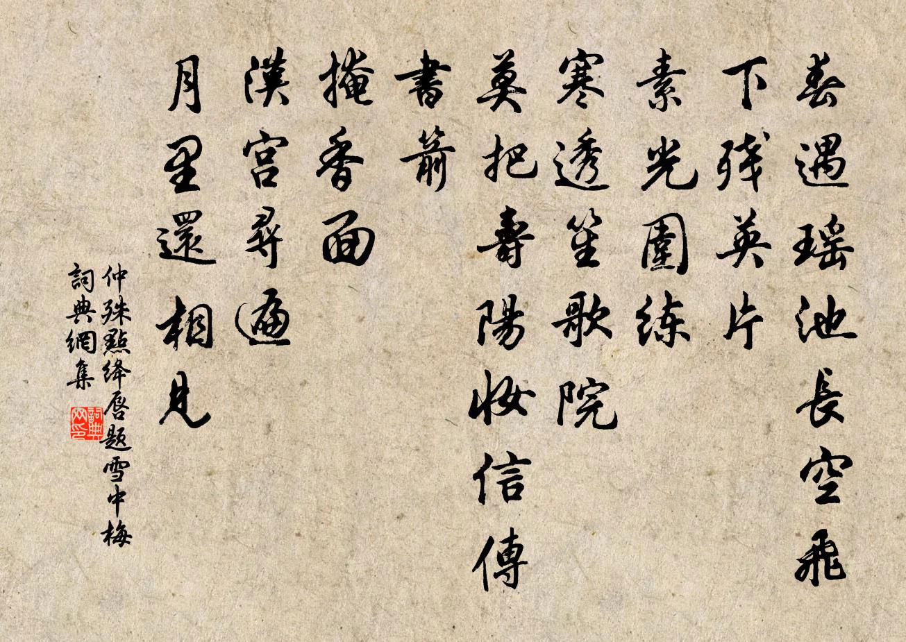 詩詞名句歷史字典書法欣賞書法字典國語詞典說文解字康熙字典古漢語字典標 題 作 者 詩 句 點絳唇(題雪中梅)作者:仲殊 朝代:宋代點絳唇(題雪中梅)原文春遇瑤池,長空飛下殘英片。素光圍練。寒透笙歌院。莫把壽陽,妝信傳書箭。掩香面。漢宮尋遍。月里還相見。詩詞問答問:點絳唇(題雪中梅)的作者是誰?答:仲殊問:點絳唇(題雪中梅)寫於哪個朝代?答:宋代問:點絳唇(題雪中梅)是什麼體裁?答:詞仲殊點絳唇(題雪中梅)書法欣賞點絳唇(題雪中梅)書法作品詩詞推薦次韻何符山人二首陳造〔宋代〕門下軒裳不轉頭,何 * 底著陽秋。獨煩客子沖泥屐,屢到衰翁聽雨樓。從昔詩聲追正始,即今賓友驗宣州。清篇鷹羅隱〔唐代〕越海霜天暮,辭韜野草乾。俊通司隸職,嚴奉武夫官。眼惡藏蜂在,心粗逐物殫。近來脂膩足,驅遣不妨難。偈傾一百六十九首釋智朋〔宋代〕坐底坐殺,立底立殺。不知誰是赤鬚鬍,轉身句子活鱍鱍。以人生五馬貴莫受侵為韻送胡獻叔守邵陽方岳〔宋代〕燈寒嶽麓雪,帆飽湘江胡。過家誰起予,豈無獨醒人。有待強至〔宋代〕來時簾卷晝,坐久竹移陰。有待無訊息,南窗睡興深。下第東南行孟郊〔唐代〕越風東南清,楚日瀟湘明。試逐伯鸞去,還作靈均行。江蘺伴我泣,海月投人驚。失意容貌改,畏途性命輕。時聞慶長春(壽戴一軒)佚名〔宋代〕有酒如澠,便開懷痛飲,我歌君拍。世事輪雲都莫問,只要顏紅鬢黑。鸝燕風清,鴛鴦水暖,打當生申節。薰風來雪中憶昔五首方回〔宋代〕憶昔凌晨泛雪湖,明天淨地一塵無。略聞倩盼歌金縷,盡聳清揚倒玉壺。屢造廟朝終擯逐,偶登名第自囚拘。即今挽翟親杜范〔宋代〕時運遭逢亦偶然,著鞭莫訝祖生先。閉門終負三冬用,脂篋徒夸十部賢。玉樹幸能光舊德,爵羅寧復嘆當年。生平鷓鴣天 宿趙州元好問〔金代〕宿酒消來睡思清。夢中身世可憐生。綠衿紅燭櫻桃宴,畫角黃雲細柳營。秋歷□,月朧明。步檐倚杖候晨星。無窮重贈劉原父歐陽修〔宋代〕憶昨君當使北時,我往別君飲君家。愛君小鬟初買得,如手未觸新開花。醉中上馬不知夜,但見九陌燈火人諠嘩。放翁陸游〔宋代〕拜賜頭銜號放翁,家傳不墬散人風。問年已過從心後,遇境但行無事中。馬老豈堪空冀北,鶴飛猶得返遼東。道傍新植紅茶花偶出被人移去以詩索之盧肇〔唐代〕嚴恨柴門一樹花,便隨香遠逐香車。花如解語還應道,欺我郎君不在家。趙東麓歸自房陵周弼〔宋代〕一年辛苦後,收聚若為豐。攝職全無吏,攜家僅有童。乳舂花下管,漆溜葉間筒。自此嬉遊地,應須且浙中。大松王令〔宋代〕十尋瘦乾三冬綠,一畝濃陰六月清。莫謂世材難見用,須知天意不徒生。長蛟老蜃空中影,驟雨驚雷半夜聲。卻笑偈傾一百三十三首釋法薰〔宋代〕四月十五同結,此土西天不別。殺盡安居,只得一橛,楊花不是天邊雪。題妙庭觀玉泉池趙鎮〔宋代〕一脈冷冷絕點埃,方池幽洞自瀠洄。源從白石雲邊出,流向青蓮座下回。禹穴鱗游殘雪噴,祗園花墮暗香來。可人哀蜀人為南蠻俘虜五章。入蠻界不許有悲泣之聲雍陶〔唐代〕雲南路出陷河西,毒草長青瘴色低。漸近蠻城誰敢哭,一時收淚羨猿啼。生查子·長恨涉江遙晏幾道〔宋代〕長恨涉江遙,移近溪頭住。閒蕩木蘭舟,誤入雙鴛浦。無端輕薄雲,暗作廉纖雨。翠袖不勝寒,欲向荷花語。西池清暉亭許抗〔宋代〕亭號清暉闞碧漣,半連村落半神仙。青山剩得雲間日,明月饒分水底天。名句推薦百囀無人能解,因風飛過薔薇。黃庭堅《清平樂·春歸何處》 時靸雙鴛響,廊葉秋聲。吳文英《八聲甘州·靈岩陪庾幕諸公游》 明朝又是孤舟別,愁見河橋酒幔青。竇叔向《夏夜宿表兄話舊》 人有悲歡離合,月有陰晴圓缺,此事古難全。蘇軾《水調歌頭·丙辰中秋》 直道相思了無益,未妨惆悵是清狂。李商隱《無題·重幃深下莫愁堂》 東風隨春歸,發我枝上花。李白《落日憶山中》 大鵬飛兮振八裔,中天摧兮力不濟。李白《臨路歌》 角聲吹徹小梅花。夜長人憶家。趙長卿《阮郎歸·客中見梅》 知足之心,可用之以處境,不可用之以讀書。王永彬《圍爐夜話·第一五九則》 人生無根蒂,飄如陌上塵。陶淵明《雜詩》