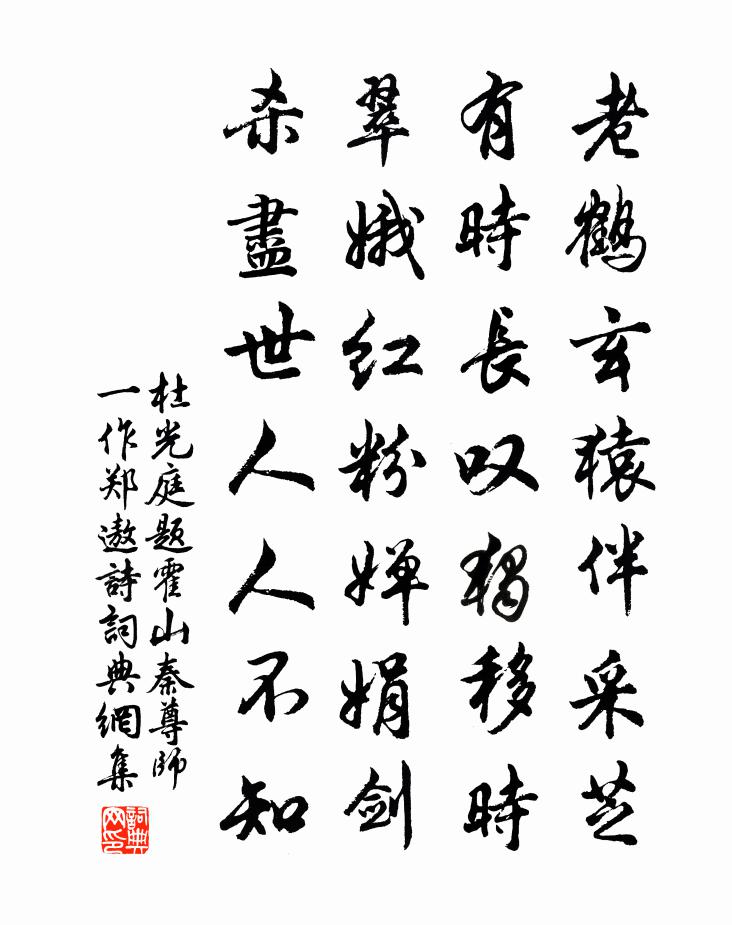 詩詞名句歷史字典書法欣賞書法字典國語詞典說文解字康熙字典古漢語字典標 題 作 者 詩 句 題霍山秦尊師(一作鄭遨詩)作者:杜光庭 朝代:唐代原文老鶴玄猿伴采芝,有時長嘆獨移時。翠娥紅粉嬋娟劍,殺盡世人人不知。詩詞問答問:《題霍山秦尊師(一作鄭遨詩)》的作者是誰?答:杜光庭問:該詩寫於哪個朝代?答:唐代書法欣賞題霍山秦尊師(一作鄭遨詩)書法作品注釋全唐詩:卷854-21詩詞推薦挽張元乾國錄詞二首韓元吉〔宋代〕左學馳聲舊,中朝得錄初。寵材知底用,壯志亦成虛。歸旐三千遠,新年八十餘。蒼天誰與問,行路亦欷噓。暇日同孫畢二同舍游李氏園亭張耒〔宋代〕蕩蕩東風散客心,出門驅馬問園林。花房待暖徐徐放,柳色隨春旋旋深。城郭遠來無俗客,松篁深處有幽禽。王公滿庭芳 詠俞紹庵九芝堂沈禧〔元代〕節義名門,簪纓華胄,聖朝旌表昭彰。聲譽籍甚,青史注遺芳。積善偏鍾餘慶,天地報、芝產中堂。人希見,九莖頌古十八首釋寶印〔宋代〕不疑不徹不失,片片春風狼籍。至今江北江南,遊子徒勞外覓。休外覓,明如杲日黑如漆。偶作曹彥約〔宋代〕此天然處不亦妙,費盡思量卻不到。有時父召急趨前,不覺不知造淵奧。此時合勒承認狀,從古痴頑可不曉。菊圖唐寅〔明代〕錦里先生日晏眠,客來高論坐無氈。酒資盡在東籬下,散貯黃金萬斛錢。贈志空上人許棠〔唐代〕了了在心中,南宗與北宗。行高無外染,骨瘦是真容。飯野盂埋雪,禪雲杖倚松。常修不住性,必擬老何峰。頌古四十四首釋法泰〔宋代〕堂堂妙相絕錙銖,善惡都忘見也無。萬里雲收天界淨,海心無浪月輪孤。穀城主簿王崇者少得養生禪寂之道中年棄官入宋庠〔宋代〕余本丘壑人,失計蹈塵網。軒冕忽韁鎖,風波若流蕩。高羽顛宏羅。奔驂僨歸鞅。眾偽緣境滋,千憂共身長。進乏行飯至新塘夜歸陸游〔宋代〕門前徙倚尚餘霞,湖上歸來月滿沙。雲濕一聲新到雁,林昏數點後棲鴉。淒迷籬落開寒菊,鄭重比鄰設夜茶。早議木香花張舜民〔宋代〕廣寒宮闕月樓台,露里移根月里栽。品格雖同香氣俗,如何卻共牡丹開。句歐陽鈇〔宋代〕愛山如愛酒,畏暑如畏虎。出門尋舊遊,缺月四更吐。和石湖居士范至能與周子充夜遊石湖松江詩韻楊萬里〔宋代〕石湖醉眼小太空,烏紗白紵雙鬢蓬。翰林來從昭回上,滿袖天香山水中。青山半邊日欲沒,珠宮湧出初圜月。兩仙贈奇松頭歌釋文準〔宋代〕種松道者道情孤,往個茅庵事事無。屋內鋤頭三兩柄,煙燻一隻醋葫蘆。問渠禪,回首指山前。問渠道,戴個篛笠素梅 四九王冕〔元代〕月明海底夜無煙,恰似西湖雪後天。清氣逼人禁不得,玉簫吹上大樓船。偈頌七首釋師一〔宋代〕破暑黃梅雨,清神白乳茶。萬緣俱不到,物外野僧家。重遊草堂次韻三首王安石〔宋代〕野寺真蘭若,山僧老病多。疏鍾挾谷響,悲梵入樵歌。水映茅篁竹,雲埋蔦女蘿。拂塵書所見,因得擬陰何。偈頌二十九首釋雲〔宋代〕今朝五月五,擊動禾山鼓。鬱壘與神荼,歡呼齊起舞。送李倍秀才薛能〔唐代〕南朝才子尚途窮,畢竟應須問葉公。書劍伴身離泗上,雪風吹面立船中。家園棗熟歸圭竇,會府槐疏試射弓。相顧送月蓬道人南遊寄呈陽岩侍讀直院侍郎六言三劉克莊〔宋代〕□□士之淵藪,陽岩學者山斗。三麻九制□□,要渠一馬來否。名句推薦今宵酒醒何處?楊柳岸,曉風殘月。柳永《雨霖鈴·寒蟬淒切》 長驅入,歌台舞榭,風卷落花愁徐君寶妻《滿庭芳·漢上繁華》 雨後雙禽來占竹,秋深一蝶下尋花。文同《北齋雨後》 蜀江水碧蜀山青,聖主朝朝暮暮情。白居易《長恨歌》 長太息以掩涕兮,哀民生之多艱。屈原《離騷》 但信己,不信人,此取敗之由也。王永彬《圍爐夜話·第八五則》 守真志滿,逐物意移。周興嗣《千字文·全文》 冰雪林中著此身,不同桃李混芳塵;王冕《白梅》 年年雪裡。常插梅花醉。李清照《清平樂·年年雪裡》 紛紛暮雪下轅門,風掣紅旗凍不翻。岑參《白雪歌送武判官歸京》