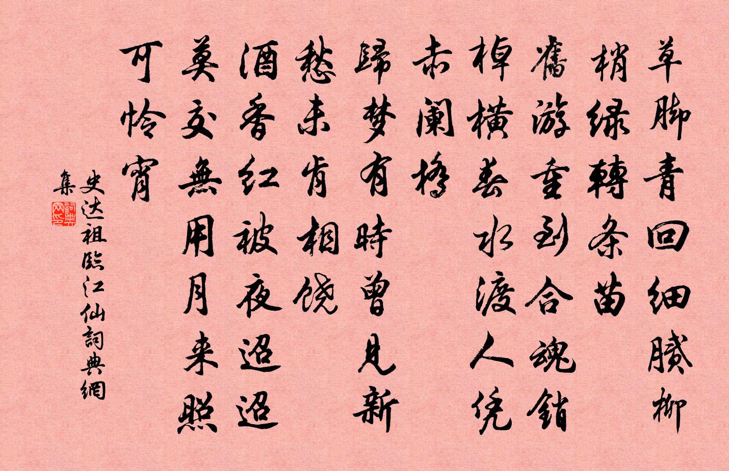 詩詞名句歷史字典書法欣賞書法字典國語詞典說文解字康熙字典古漢語字典標 題 作 者 詩 句 臨江仙作者:史達祖 朝代:宋代臨江仙原文草腳青回細膩,柳梢綠轉條苗。舊遊重到合魂銷。棹橫春水渡,人憑赤闌橋。歸夢有時曾見,新愁未肯相饒。酒香紅被夜迢迢。莫交無用月,來照可憐宵。詩詞問答問:臨江仙的作者是誰?答:史達祖問:臨江仙寫於哪個朝代?答:宋代問:臨江仙是什麼體裁?答:詞問:史達祖的名句有哪些?答:史達祖名句大全史達祖臨江仙書法欣賞臨江仙書法作品詩詞推薦臨江仙 次韻山村先生賦柳張翥〔元代〕搖盪春光湖上路,多情偏識倡條。畫船系在赤闌橋。花飛人別處,綠暗雨休朝。惱亂東風扶不起,空憐燕奼鶯嬌。括摸魚兒林正大〔宋代〕醉之鄉、其去中國,不知其幾千里。其土平曠無涯際。其氣和平一揆。無寒暑,無聚落居城,無怒而無喜。昔黃帝安溪黃明府得子次徐常丞韻一首劉克莊〔宋代〕宰公心印佛慈,吉兆前知抱送期。喜溢親闈占鸑鷟,來從帝所下騎麒。芝蘭庭戶芽初茁,荼堇原田味變飴。加我數德章法曹再用銅字韻作詩為報復用韻奉答趙蕃〔宋代〕人窮往往咎文窮,歷數前賢半此風。春去林園乃啼鴂,秋來牆壁自鳴蟲。世悲工瑟如齊客,我嘆好龍多葉公。苦節宮詞宋白〔宋代〕珠為雙佩玉為簫,御女長眉稱細腰。詔賜公卿縱游賞,春來頻放紫宸朝。濟翁弟贈白團扇子一面,作百竹圖有詩和以謝楊萬里〔宋代〕月波初上涌寒金,桂樹風來細有音。特地此君偏作惱,為儂隔卻半輪陰。論語絕句一百首張九成〔宋代〕子云文不在茲乎,豈與常人論有無。興喪亦皆天意爾,匡人於此莫如予。擬魏太子鄴中集詩 平原侯植謝靈運〔南北朝〕公子不及世事,但美遨遊,然頗有憂生之嗟。朝游登鳳閣,日暮集華沼。傾柯引弱枝,攀條摘蕙草。徙倚窮騁望,合浦還珠亭陶弼〔宋代〕合浦還珠舊有亭,使君方似古人清。沙中蚌蛤胎滿,潭底蛟龍睡不驚。洋州三十景野人廬鮮于侁〔宋代〕深深惟使君,草草學田舍。持此歸與心,隨時自瀟灑。次韻陳叔易三首李處權〔宋代〕東鄰有艷婦,傾城室家索。西鄰有貞妻,空閨守葵藿。良人萬里去,豈為鉛華落。君心諒不移,妾命由來薄。天地上嚴廉訪十首熊禾〔宋代〕因思傳記學,本欲釋經義。春秋列三家,儀禮亦存二。荊舒彼何人,繁碎妄譏毀。煌煌姬孔書,坐此竟廢棄。獨坐司空圖〔唐代〕幽逕入桑麻,塢西逢一家。編籬薪帶繭,補屋草和花。送判官赴京薛能〔唐代〕闕下情偏已絕稀,天涯身遠復相依。庭花每對從容落,夜燭多同笑語歸。君子是行應柏署,鄙人何望即柴扉。青雲聖心張載〔宋代〕聖心難用淺心求,聖學須專禮法修。千五百年無孔子,盡因通變老優遊。攝相石介〔宋代〕惜無百里地封君,攝相區區道屢伸。少正將身膏斧刃,侏儒流血汙車輪。方令魯國知王法,自此齊侯畏聖人。昔放戲友不識硯戴泰〔宋代〕古今天下多奇石,甲品從來只數端。千丈割雲潭影濕,一泓貯水月光寒。青瞳要辨生鴝眼,紫色須求死馬肝。鼠璞菩薩蠻蔡伸〔宋代〕朝來一陣狂風雨。春光已作堂堂去。茂綠滿繁枝。青梅結子時。攀枝驚晼晚。樂事孤心眼。正是惜春歸。那堪怨別贈蔡道人王之道〔宋代〕寶蓋山前蔡道人,十年學佛頗安貧。似聞親覓天衣老,為改令名作惠新。于飛樂歐陽修〔宋代〕寶奩開,美鑒靜,一掬清蟾。新妝臉,旋學花添。蜀紅衫,雙繡蝶、裙縷鶼鶼。尋思前事,小屏風、仍畫江南。怎名句推薦少小雖非投筆吏,論功還欲請長纓。祖詠《望薊門》 今年對花最匆匆,相逢似有恨,依依愁悴。周邦彥《花犯·小石梅花》 綠樹村邊合,青山郭外斜。孟浩然《過故人莊》 淡黃楊柳暗棲鴉。玉人和月摘梅花。賀鑄《減字浣溪沙·樓角初銷一縷霞》 日上,正赤如丹,下有紅光,動搖承之。姚鼐《登泰山記》 阿婆還似初笄女,頭未梳成不許看。袁枚《遣興》 天長地久。天地所以能長且久者,以其不自生,故能長生。是以聖人後其身而身先,外其身而身存。非以其無私邪老子《老子·道經·第七章》 宜有詞仙,擁素雲黃鶴,與君遊戲。姜夔《翠樓吟·淳熙丙午冬》 調角斷清秋,征人倚戍樓。張喬《書邊事》 火樹銀花合,星橋鐵鎖開。蘇味道《正月十五夜》