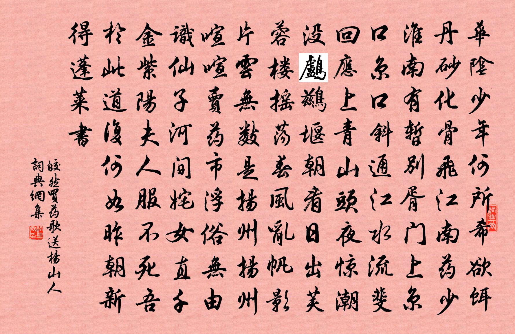 詩詞名句歷史字典書法欣賞書法字典國語詞典說文解字康熙字典古漢語字典標 題 作 者 詩 句 買藥歌送楊山人作者:皎然 朝代:唐代買藥歌送楊山人原文華陰少年何所希,欲餌丹砂化骨飛。江南藥少淮南有,暫別胥門上京口。京口斜通江水流,斐回應上青山頭。夜驚潮沒鸕鶿堰,朝看日出芙蓉樓。搖盪春風亂帆影,片雲無數是揚州。揚州喧喧賣藥市,浮俗無由識仙子。河間奼女直千金,紫陽夫人服不死。吾於此道復何如,昨朝新得蓬萊書。詩詞問答問:買藥歌送楊山人的作者是誰?答:皎然問:買藥歌送楊山人寫於哪個朝代?答:唐代皎然買藥歌送楊山人書法欣賞買藥歌送楊山人書法作品詩詞推薦依韻走筆和答徐無畏見招強至〔宋代〕憶初識面越庠時,餘教嘗蒙覺後知。早念兒童能刻賦,晚逢夫子許言詩。從容江介心方壯,蹭蹬京華鬢已衰。道舊蒙知府寵示秋日郡圃佳制遂侍杖屨逍遙林水間陳與義〔宋代〕鳥語知公樂,晴山及我游。盡排物外事,拚作酒中浮。菊蕊離雙鬢,林聲隱四愁。騷人例喜賦,政自不關秋。破釜邵雍〔宋代〕有一破釜多故舊,掉向空房不照顧。上面{左土右孛}土塵埃生。兩璺到耳連底透。叫得將來錮露人,拈得與他交棲霞宮山齋高似孫〔宋代〕山棲極造理,其北恰嵐壁。下吞泉數斗,中有蒲數脊。岩留未化雪,竹迸將崩石。不為世所薰,直入玄之寂。道人榴皮題壁孫唐卿〔宋代〕碧眼仙人曾著句,玉堂學士繼其餘。只今雖說西鄰富,爭是東庵有異書。平郴蠻楊冠卿〔宋代〕孽狐鬼嘯篁竹,紅綃帕首郴江曲。萬牛臠炙瓮行酒,黨伍穰穰萃林藪。牙璋夜半起兵符,雲旗驛騎爭馳驅。搜原剔老農嘆裘萬頃〔宋代〕霜耕冰在趾,雨種泥沒膝。旱魃忽為虐,耕種謾勞力。去年幸一稔,今歲免艱食。細聽老農語,令我三嘆息。但願次韻何陸二別駕同游靈山閣三首徐元傑〔宋代〕彼美前修亦偉哉,巋然風雨不能摧。人新人古懷斯閣,春去春來付一杯。遊興漫隨流水去,衰眸長對好山開。銷凝頌古二十五首釋崇岳〔宋代〕夫子不識字,達磨不會禪。大唐天子國,依舊化三千。夏日陸游〔宋代〕燕子生雛梅子黃,斷雲殘雨過林塘。孤舟正作笭箵夢,九陌難隨褦襶忙。團扇興來閒弄筆,寒泉漱罷獨焚香。太平有感二首許月卿六〔宋代〕晴明佳思吟難盡,雨雪愁寒撥不開。天地中間許多事,不應暑往不寒來。問淵明菊杜范〔宋代〕世心淵明名爾菊,卻來紫陌換青銅。東籬采采知何處,豈不包羞負此翁。七月十四日韓持國直廬同觀山海經曾鞏〔宋代〕高閣在清禁,長軒憑廣虛。御幄閟圖象,依然臨幸余。翠甓布天路,黃簾分直廬。一雨清景早,稍涼秋興初。解帶魯城北郭曲腰桑下送張子還嵩陽李白〔唐代〕送別枯桑下,凋葉落半空。我行懵道遠,爾獨知天風。誰念張仲蔚,還依蒿與蓬。何時一杯酒,更與李膺同。郊行徐元傑〔宋代〕百花只被一晴催,一出郊行花盡開。攜杖奚奴趁先去,路迷青草卻回來。上潘舍人陳宓〔宋代〕淛水人如大雅詩,唯君出句最能奇。騰聲直欲驂鸞鶴,赤子猶思縛虎羆。覽卷幾年如舊識,忘年今日辱新知。漳濱次韻二首劉克莊〔宋代〕阮生未老各情親,誰道先生不覿鄰。莫管彈丸驚鴨者,豈無沽酒與魚人。何曾膝上推文度,亦許車中載小陳。賜第老境陸游〔宋代〕一生倖免踐危機,老境還山飽蕨薇。智士固知窮有命,達人元謂死為歸。臨窗蜀紙謄詩草,出戶郿絛系褐衣。堪笑題劉後村所跋楊朴移居圖許月卿六〔宋代〕曾對君王已放還,何須當道把漁竿。使軺將宿人將避,拗折漁竿趕入山。和曾令綽韓維〔宋代〕臥病河橋與死濱,還家重喜見芳春。輔藩行釋綏安重,仁城欣聞締構新。危堞遍臨雙遠岫,平湖不受一微塵。知君名句推薦小姑織白紵,未解將人語。李白《湖邊採蓮婦》 疑人勿使,使人勿疑脫脫《金史·本紀·卷四》 齊有倜儻生,魯連特高妙。李白《古風·齊有倜儻生》 生生死死,非物非我,皆命也,智之所無柰何。列子及其弟子《列子·力命》 春風得意馬蹄疾,一日看盡長安花。孟郊《登科後》 泉聲咽危石,日色冷青松。王維《過香積寺》 垂柳依依惹暮煙,素魄娟娟當繡軒。王元鼎《憑欄人·閨怨》 私行勝,則少公功。韓非及後人《韓非子·外儲說左下》 枝枝相糾結,葉葉競飄揚。李白《古意》 古者春夏二氣,不決重罪。姚思廉《陳書·本紀·卷三》