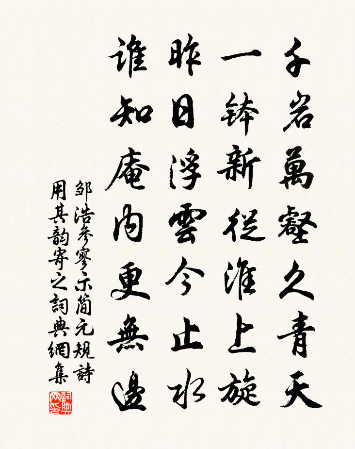 詩詞名句歷史字典書法欣賞書法字典國語詞典說文解字康熙字典古漢語字典標 題 作 者 詩 句 參寥示簡元規詩用其韻寄之作者:鄒浩 朝代:宋代參寥示簡元規詩用其韻寄之原文千岩萬壑久青天,一缽新從淮上旋。昨日浮雲今止水,誰知庵內更無邊。詩詞問答問:參寥示簡元規詩用其韻寄之的作者是誰?答:鄒浩問:參寥示簡元規詩用其韻寄之寫於哪個朝代?答:宋代鄒浩參寥示簡元規詩用其韻寄之書法欣賞參寥示簡元規詩用其韻寄之書法作品詩詞推薦香菱詠月·其一曹雪芹〔清代〕月掛中天夜色寒,清光皎皎影團團。詩人助興常思玩,野客添愁不忍觀。翡翠樓邊懸玉鏡,珍珠簾 * 冰盤。良宵喜雨虞儔〔宋代〕雨腳初鳴屋,風頭忽轉廊。餘涼生簟枕,好夢到池塘。黃妳真三窟,青奴得兩忘。功名休恨晚,身世一藤床。送族弟凝至晏堌(單父三十里)李白〔唐代〕雪滿原野白,戎裝出盤游。揮鞭布獵騎,四顧登高丘。兔起馬足間,蒼鷹下平疇。喧呼相馳逐,取樂銷人憂。舍此憲使魏青崖惠拄杖堅多節而色尚黃惟額用白立陳杰〔宋代〕三尺青蛇冷劍鋩,百跗委蛻像生黃。分來上界金神節,堅起平生鐵脊樑。千步已穿蘿逕月,一棱猶帶柏台霜。小煩和史司直韻五首吳潛〔宋代〕南方一佛放圓光,散作閻浮檐蔔香。便把此花為贊祝,更將何物獻休祥。建中聖主平平盪,錫福明王簡簡穰。共喜飲孤山六一泉有感亭以太湖石為柱樑方回〔宋代〕解後猶存石柱樑,周家九鼎尚淪亡。此泉只是尋常水,為有歐蘇姓字香。落梅風周文質〔元代〕樓台小,風味佳,動新愁雨初風乍。知不知對春思念他,倚欄桿海棠花下?乾道七年恭上太上皇帝太上皇后尊號十一首佚名〔宋代〕禮神頌祗,福祿來下。不有榮名,孰緝伊嘏。千乘萬騎,魚魚雅雅。皇扉洞開,鞠躬如也。寄永興窣兄万俟紹之〔宋代〕憶昔京華聚首時,大兄常念阿連痴。別來相望天涯遠,長誦對床風雨詩。新梧潘良貴〔宋代〕殘春始抽芽,首夏已敷綠。空枝變繁陰,造物信神速。童童覆短牆,密密連深竹。扶疏團爽氣,秀整厭群木。鳴琴西江月薛式〔宋代〕天上三清真境,三皇五帝規模。瞿曇老氏仲尼徒。經史深藏妙素。間有真人出世,來明赤子玄珠。蟾光終日耀昏衢機簡堂自隱靜歸為萬年主人訪余林下相與道舊吳芾〔宋代〕知心獨有師,相視笑莫逆。每思共談玄,傾倒此胸臆。江浙遙相望,恨不生羽翼。昨朝忽惠然,得得訪泉石。東村陸游〔宋代〕雨霽山爭出,泥乾路漸通。稍從牛屋後,卻過鸛巢東。決決沙溝水,翻翻麥野風。欲歸還小立,為愛夕陽紅。題汝州從事廳鄭谷〔唐代〕詩人公署如山舍,只向階前便採薇。驚燕拂簾閒睡覺,落花沾硯會餐歸。壁看舊記官多達,榜掛明文吏莫違。自說瑞鶴仙佚名〔宋代〕百年琴如夢蝶。琴嘆古往今來,多少豪傑。圖王霸業。謾得漁樵,一場閒說。秦琴漢闕。今只有狐蹤兔穴。想榮華寄懷畏知二首趙蕃〔宋代〕憶昨題詩歲且更,路長誰與附書行。登樓見說同王粲,為賦懸知似賈生。杜老性非真傲誕,元龍氣自舊崢嶸。天寒瑞香盛開,呈益國公二首楊萬里〔宋代〕近看丁香萬粒攢,遠看卻與紫球般。誰將玉膽薔薇水,新濯瓊膚錦秀禪。淨界薰修爾芬馥,無人翦剔自團欒。下元送大理金少卿赴闕以老成耆德重於典刑為韻兼仲並〔宋代〕全璧公之歸,有識為嗟咨。外祠三拜命,歷歲艾且耆。乘流與遇坎,道在他何知。汪汪波萬頃,未許兒輩窺。舟宿莫城孫應時〔宋代〕澤國寒初重,霜天晚自溫。孤舟一杯酒,斜月數家村。美睡聊相補,勞生得列論。燭湖疑在眼,燈火閉柴門。悉怛謀降唐金朋說〔宋代〕祖宗疆哉陷西戎,得復來歸悉怛謀。不受生降唯守信,死年褒贈復何憂。名句推薦明月皎皎照我床,星漢西流夜未央。曹丕《燕歌行二首·其一》 分手脫相贈,平生一片心。孟浩然《送朱大入秦》 見可而進,知難而退,軍之善政也。兼弱攻昧,武之善經也。左丘明《左傳·宣公·宣公十二年》 閒坐悲君亦自悲,百年多是幾多時。元稹《遣悲懷三首·其三》 霜草蒼蒼蟲切切,村南村北行人絕。白居易《村夜》 嚴妝欲罷囀黃鸝,飛上萬年枝。和凝《喜遷鶯·曉月墜》 鳳皇舟上楚女,妙舞,雷喧波上鼓孫光憲《河傳·柳拖金縷》 夭紅過眼隨榮謝,菊秀蘭香自占春。王汝舟《詠歸堂隱鱗洞》 長江千里,煙淡水雲闊。李綱《六么令·次韻和賀方回金陵懷古鄱陽席上作》 大家漸及消亡,難期其復振,勢成於因循也。王永彬《圍爐夜話·第三七則》