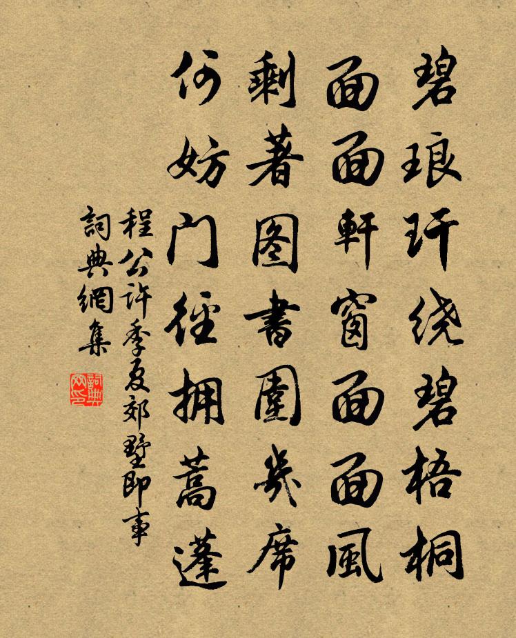 詩詞名句歷史字典書法欣賞書法字典國語詞典說文解字康熙字典古漢語字典標 題 作 者 詩 句 季夏郊墅即事作者:程公許 朝代:宋代季夏郊墅即事原文碧琅玕繞碧梧桐,面面軒窗面面風。剩著圖書圍幾席,何妨門徑擁蒿蓬。詩詞問答問:季夏郊墅即事的作者是誰?答:程公許問:季夏郊墅即事寫於哪個朝代?答:宋代程公許季夏郊墅即事書法欣賞季夏郊墅即事書法作品詩詞推薦失調名黃庭堅〔宋代〕舊家楊柳依依綠,長鎖春來庭院。三瑞堂黃公度〔宋代〕機雲二子才孤標,妙齡馳聲典午朝。今見遠孫來海嶠,儒雅雍容飾漢條。德化醇醲春有腳,天姿粹美玉不彫。無復別顏慥下第蔡襄〔宋代〕四上不登第,漂流二十年。依依去國恨,杯酒春風前。香潭八首許月卿〔宋代〕老師當日啟靈篇,親手傳承豈偶然。殘月曉風空夜夜,垂楊芳草自年年。報恩男子那無地,未喪斯文決有天。月在答仲章別後見寄韓維〔宋代〕會合非素期,追歡得同好。旅情忘郁約,春事入吟嘯。子行反崤鞏,我去旁嵩少。悵望洛陽花,金樽不同倒。夢中作陸游〔宋代〕路平沙軟淨無泥,香草丰茸沒馬蹄。搗紙聲中春日晚,怳然重到浣花溪。觀村中禱雨三首戴表元〔宋代〕十里不同雲,五里不同雨。天台白茫茫,乃爾多肺腑。人言蛟友神,象類可以取。蛇蟲當此時,行路誰敢侮。飛騰又送赴關李中〔唐代〕心似白雲歸帝鄉,暫停良畫別龔黃。煙波乍曉浮蘭棹,魂夢先飛近御香。一路伴吟汀草綠,幾程清思水風涼。想應野渡用前韻陸游〔宋代〕十里平沙到渡頭,溪山合向畫圖收。老僧赴供袈黎古,醉叟行歌罷亞秋。斷岸煙迷耕處草,孤村雨送釣時舟。龍泉鄂州節推陳榮緒惠示沿檄崇陽道中六詩老懶不黃庭堅〔宋代〕鹹寧走蘆子,終日喬木陰。太丘心灑落,古松韻清深。聊持不俗耳,靜聽無弦琴。非今胡部律,而獨可人心。信步趙汝鐩〔宋代〕午窗方睡起,信步過東畦。穴徙蟻知雨,巢穿燕補泥。路坍連草沒,果重壓枝低。村婦抱兒子,籠邊教喚雞。閒居和雲屋道士文天祥〔宋代〕一樽聊共此時心,文字追隨落醉吟。仙子樓台修竹外,行人冠蓋畫橋陰。一年芳草東風老,五月空江夜雨深。且作謁中齋楊左丞王義山〔宋代〕向來曾拜紫宸衙,親見先班奉日霞。帝室館甥貴公子,王姬下嫁舊儒家。執中默契心傳妙,勤有無窮學問加。帶取代壽安宣相程公許〔宋代〕帝佑炎圖保中光,風雲嘉會契千齡。石田旱嘆須膏澤,蟄戶隊凝聳震霆。審象岩間同說命,絕韋聖處見義經。立談用厚後弟強甫韻劉克莊〔宋代〕辭大叢林卓小庵,豈知捷徑在終南。狂歌不曉花十八,餓死休貪芧四三。漢有子云尤苦思,晉惟逸少不清談。君看謝薦醫劉宰〔宋代〕容貌天黥二十年,刳腸一洗帳無緣。祗今縱使逢醫緩,卻顧霜毛已颯然。和朱主簿四首劉克莊〔宋代〕玉座懷賢遠,黃扉取友端。吾方觀治象,渠忍鎩祥鸞。家學應難改,賢名已不刊。三年無一字,懷舊忽汍瀾。孟子自暴自棄陳普〔宋代〕所性自來非不善,居參豚犬豈人情。昭昭日月明如鏡,瞑目甘心冒昧行。新林小憩見花二首陳造〔宋代〕略得花邊一欠伸,羅衫歸去滿緇塵。鳴鳩乳燕空多思,苦雨淒風不貸春。詠春雪寄族人治書思澄詩何遜〔南北朝〕可憐江上雪。迴風起復滅。本欲映梅花。翻悲似玉屑。朝鶯日弄響。暮條行可結。鹹言不適時。安知非矯節。名句推薦意輕千金贈,顧向平原笑。李白《古風·齊有倜儻生》 相去日已遠,衣帶日已緩佚名《行行重行行》 香臉半開嬌旖旎。當庭際。玉人浴出新妝洗。李清照《漁家傲·雪裡已知春信至》 真積力久則入。荀子《荀子·勸學》 多欲則貪,尚私則枉,其罪遂生。來俊臣《羅織經·閱人卷第一》 輕衫未攬,猶將淚點偷藏史達祖《夜合花·柳鎖鶯魂》 故人何處。帶我離愁江外去。呂本中《減字木蘭花·去年今夜》 世情看冷暖,人面逐高低。施耐庵《水滸傳·第三十七回》 猶憐慣去國,疑是夢還家。盧僎《歲晚還京台望城闕成口號先贈交親》 綠葉陰濃,遍池亭水閣,偏趁涼多。元好問《驟雨打新荷》