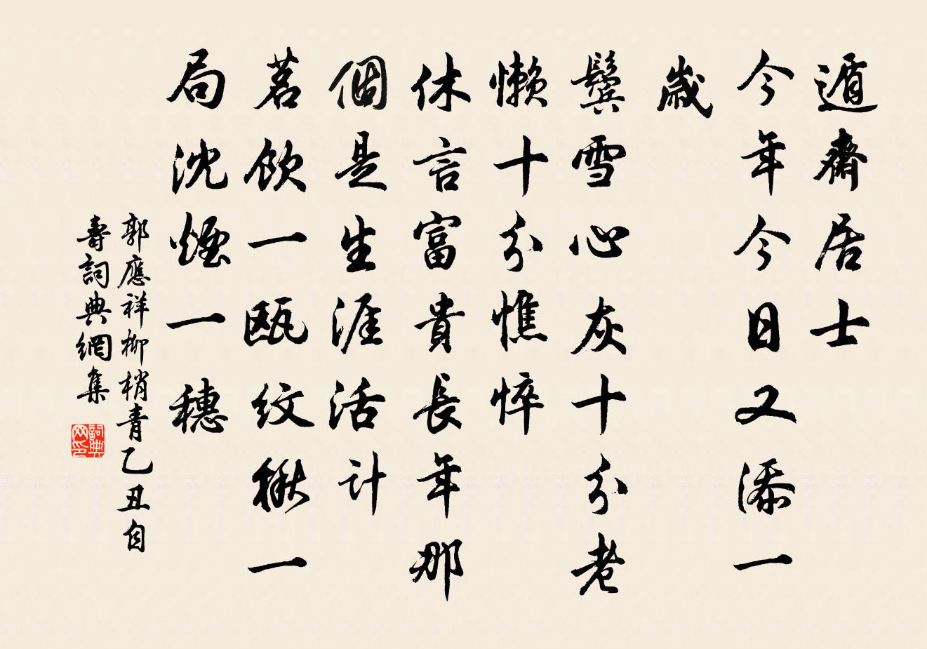 詩詞名句歷史字典書法欣賞書法字典國語詞典說文解字康熙字典古漢語字典標 題 作 者 詩 句 柳梢青(乙丑自壽)作者:郭應祥 朝代:宋代柳梢青(乙丑自壽)原文遁齋居士。今年今日,又添一歲。鬢雪心灰,十分老懶,十分憔悴。休言富貴長年,那個是、生涯活計。茗飲一甌,紋楸一局,沈煙一穗。詩詞問答問:柳梢青(乙丑自壽)的作者是誰?答:郭應祥問:柳梢青(乙丑自壽)寫於哪個朝代?答:宋代問:柳梢青(乙丑自壽)是什麼體裁?答:詞郭應祥柳梢青(乙丑自壽)書法欣賞柳梢青(乙丑自壽)書法作品詩詞推薦頌古一百二十一首釋宗杲〔宋代〕五月五日午時書,赤口毒舌盡消除。更饒急急如律令,不須門上畫蜘蛛。謝關景仁送紅梅栽二首蘇軾〔宋代〕年年芳信負紅梅,江畔垂垂又欲開。珍重多情關令尹,直和根撥送春來。蘇君廳觀韓乾馬障歌顧雲〔唐代〕杜甫歌詩吟不足,可憐曹霸丹青曲。直言弟子韓乾馬,畫馬無骨但有肉。今日披圖見筆跡,始知甫也真凡目。秦王和應之永日張耒〔宋代〕多病倦煩暑,幸茲山水幽。惜芳悲鷤{右封去寸左鳥},占雨聽鳴鳩。池影澄當戶,山陰暮轉樓。黃昏螢點點,秋四道吟邵雍〔宋代〕天道有消長,地道有險夷。人道有興廢,物道有盛衰。興廢不同世,盛衰不同時。奈何人當之,許多喜與悲。菩薩蠻張孝祥〔宋代〕縹緲飛來雙彩鳳。雨疏雲淡撩清夢。蘭薄未禁秋。月華如水流。采香溪上路。愁滿參差樹。獨倚晚樓風。斷霞縈素丁教授家貓狗皆相乳二首項安世〔宋代〕血人於牙犬政猛,殺鼠如邱貓事獰。鄰子忽如親子愛,人情何似物情平。再三仁者須存勇,萬一天資與習成。恐被贈金仁山唐良驥〔宋代〕公已蒼頭我黑頭,兩情常得守清幽。紛紛世事浮雲變,汩汩人生逝水流。行止何期南又北,交情又見夏還秋。可堪滿江紅(壽太守·四月三十)梁大年〔宋代〕九十炎光,又過了、三分之一。記當年光際,誕生良弼。崧岳降神鍾秀氣,孕成間世真英傑。妙文章、拾芥立功名游定林寺即荊公讀書處四首楊萬里〔宋代〕半破僧庵半補籬,舊題無複壁間詩。秪余手植雙桐在,此外仍兼洗硯池。柳枝文同〔宋代〕牆宇周回院落深,日光風色淨陰陰。柔條一似孫荊玉,貼地反腰銜寶簪。泉大道贊釋紹曇〔宋代〕赤身跳入毒龍潭,血戰積壓他死幾番。掙撰出來噇缽酒,郴州六月火雲寒。月湖山谷勸耕次韻鄧深〔宋代〕皂蓋朱幡游近郭,野桃山杏炫紅旂。看看新燕銜泥候,恰恰鳴鳩喚雨時。未用經丘思靖節,何妨學稼許樊遲。老農生朝有感吳芾〔宋代〕姑溪來幾日,兩度見生朝。親舊三年隔,鄉關千里遙。梅還開舊樹,柳更長新條。只有雙蓬鬢,天公不見饒。衡守劉子澄以詩來和韻奉酬陳傅良〔宋代〕曳裾朝路不同時,謀食衡湘亦把麾。一見相忘光可鑑,十年何在惄如飢。力堪扶世將誰可,語不驚人或自危。夜雪讀種先生丁密諫詩林逋〔宋代〕舊草閒看即自卑,聖朝空道苦於詩。高才眩望如明逸,新句無因似謂之。淮甸月華欹枕靜,秣陵春色按鞭遲。邯鄲詩三首孫何〔宋代〕貝闕琳宮紫霧深,鳳凰仙樂尚愔愔。鼎湖往事三千載,石筍青春一萬尋。挺立不教凡草長,削成應免俗塵侵。霓旌題吳參議達觀齋袁燮〔宋代〕朱公胸次清絕塵,吳公當日心相親。風流蘊藉接前輩,寥寥斯世能幾人。達觀名齋深有意,欲把前修相警厲。只今送從弟濛赴饒州張籍〔唐代〕京城南去鄱陽遠,風月悠悠別思勞。三領郡符新寄重,再登科第舊名高。去程江上多看堠,迎吏船中亦帶刀。到日中夜起釋惠崇〔宋代〕初月不到曉,夜色何冥冥。獨立秋江上,風波卷寒星。名句推薦常記溪亭日暮,沉醉不知歸路。李清照《如夢令·常記溪亭日暮》 不怕官,只怕管。施耐庵《水滸傳·第二回》 閨中少婦不知愁,春日凝妝上翠樓。王昌齡《閨怨》 激氣已能驅粉黛,舉杯便可吞吳越。史達祖《滿江紅·中秋夜潮》 多私者不義,揚言者寡信。戴聖《大戴禮記·文王官人第七十二》 天闕象緯逼,雲臥衣裳冷杜甫《游龍門奉先寺》 別離在今晨,見爾當何秋。韋應物《送楊氏女》 河水洋洋,北流活活詩經《碩人》 山河風景元無異,城郭人民半已非。文天祥《金陵驛二首·其一》 清娥畫扇中,春樹鬱金紅。溫庭筠《清明日》