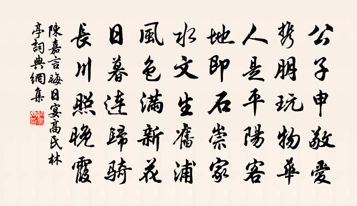 詩詞名句歷史字典書法欣賞書法字典國語詞典說文解字康熙字典古漢語字典標 題 作 者 詩 句 晦日宴高氏林亭作者:陳嘉言 朝代:唐代晦日宴高氏林亭原文公子申敬愛,攜朋玩物華。人是平陽客,地即石崇家。水文生舊浦,風色滿新花。日暮連歸騎,長川照晚霞。詩詞問答問:晦日宴高氏林亭的作者是誰?答:陳嘉言問:晦日宴高氏林亭寫於哪個朝代?答:唐代問:晦日宴高氏林亭是什麼體裁?答:五律陳嘉言晦日宴高氏林亭書法欣賞晦日宴高氏林亭書法作品注釋全唐詩:卷72_26詩詞推薦釣台題壁佚名〔宋代〕生涯千頃水雲寬,舒捲乾坤一釣竿。夢裡偶然伸雙腳,渠知天子是何官。勸陸三飲酒戴叔倫〔唐代〕寒郊好天氣,勸酒莫辭頻。擾擾鍾陵市,無窮不醉人。夏日南園邵雍〔宋代〕夏木無重數,森陰翠樾低。相呼百禽語,太半是黃鸝。立春內中帖子詞夫人閣王珪〔唐代〕月殘鳷鵲雪離離,禁里春風自有期。曉憶梅花誰為折,從來不許下瑤墀。朱坡林寬〔唐代〕朱坡坡上望,不似在秦京。漸覺溪山秀,更高魚鳥情。夜吟禪子室,曉爨獵人鐺。恃此偷佳賞,九衢蜩未鳴。宿船家小舟中凡三日夜作此李流謙〔宋代〕自昔說離亂,經時足嘆吁。何為來曠野,端是辱泥塗。相國跛男子,封侯裸丈夫。未須多感慨,事業出艱虞。無俗念王吉昌〔元代〕一呼宮一吸,昧宮穀神、玄宮牝綿綿踵至。聚散忙忙乖造化,根蒂懸懸遠離。上下無歸,往來失御,不向三宮施。挽陳復齋高翥〔宋代〕憂世心勞鬢易斑,笑顰還與世相關。秋霜烈日君臣際,和氣春風母子閒。學道期傳千載統,獻言先辦一生閒。堂堂次韻成父舟中趙蕃〔宋代〕久客日復日,窮冬冰復冰。知還憐倦鳥,側翅恥飢鷹。搔發傷今老,沿塘記昔曾。舒憂足行卷,教諂謝書縢。簡鮑欽止吳則禮〔宋代〕翛然策羸馬,偶造釋子居。欣與遁世士,共閱瞿曇書。脫屣弄清泚,曲肱翳扶疏。鳥起短筇外,鐘鳴幽夢余。高論次韻劉景文贈傅義秀才蘇軾〔宋代〕幼眇文章宜和寡,崢嶸肝肺亦交難。未能飛瓦彈清角,肯便投泥戲潑寒。忽見秋風吹洛水,遙知霜葉滿長安。詩成薄晚絕句二首楊萬里〔宋代〕春氣吹人不作醒,病身感物底心情。斜陽也不 * 老,偏照霜髭一兩莖。黃樓陳師道〔宋代〕樓上噹噹徹夜聲,與人何事有枯榮。已傳紙貴鹹陽市,更恐書留後世名。上巳瓊林苑宴二府同游池上即事口占晏殊〔宋代〕曲榭迴廊手伎喧,彩樓朱舫鼓聲繁。遊人已著濃春去,不待歌長舞袖翻。彥執賞予詩張九成〔宋代〕年來百念灰,求友良未已。一昨竄逐來,萬事風過耳。忽得故人書,驚喜或不寐。人生等行客,斯姑小憩。吟詩本清平樂·紅箋小字晏殊〔宋代〕紅箋小字。說盡平生意。鴻雁在雲魚在水。惆悵此情難寄。斜陽獨倚西樓。遙山恰對簾鉤。人面不知何處,綠波依元夕雨中偶成四絕奉寄東齋陳起〔宋代〕車駕行將享孟春,月收梅影可愁人。雨師不管閒舞舞,預向天街灑暗塵。將至筠先寄遲適遠三猶子蘇軾〔宋代〕露宿風餐六百里,明朝飲馬南江水。未見豐盈犀角兒,先逢玉雪王郎子。(時道逢王郎於建昌,方北行也。)對床和錢穆父送別並求頓遞酒(次韻)蘇軾〔宋代〕聯鑣接武兩長身,鵷鷺行中語笑親。九子羨君門戶壯,八州憐我往來頻。佇聞東府開賓閣,便乞西湖洗塞塵。更向柳梢青張孝祥〔宋代〕碧雲風月無多。莫被名韁利鎖。白玉為車,黃金作印,不戀休呵。爭如對酒當歌。人是人非恁麽。年少甘羅,老成名句推薦願借天風吹得遠,家家門巷盡成春。李方膺《題畫梅》 稚子金盆脫曉冰,彩絲穿取當銀錚。楊萬里《稚子弄冰》 顧謂戚夫人,彼翁羽翼成。李白《山人勸酒》 不聞不若聞之,聞之不若見之,見之不若知之,知之不若行之。學至於行之而止矣。荀子《荀子·儒效》 物是人非事事休,欲語淚先流。李清照《武陵春·春晚》 與死人同病者,不可生也;與亡國同事者,不可存也。韓非及後人《韓非子·孤憤》 河水洋洋,北流活活詩經《碩人》 雪裡溫柔,水邊明秀,不借春工力。辛棄疾《念奴嬌·梅》 兒童強不睡,相守夜歡嘩。蘇軾《守歲》 堂上謀臣尊俎,邊頭將士干戈辛棄疾《西江月其六》