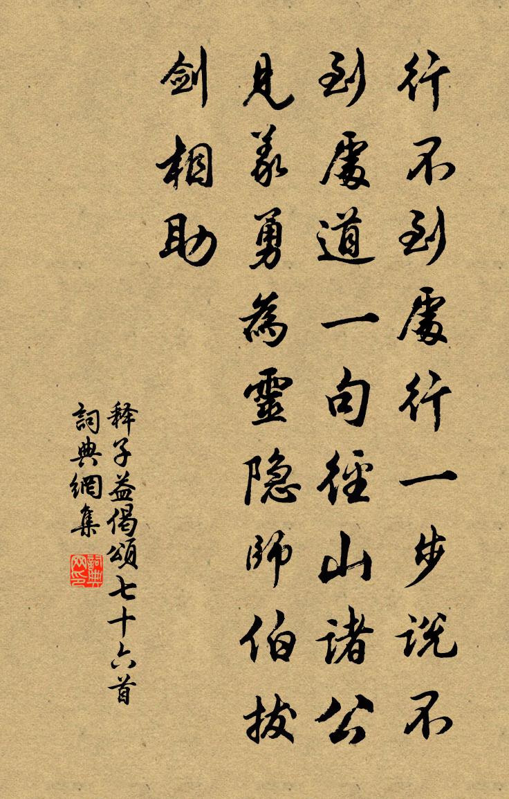 詩詞名句歷史字典書法欣賞書法字典國語詞典說文解字康熙字典古漢語字典標 題 作 者 詩 句 偈頌七十六首作者:釋子益 朝代:宋代偈頌七十六首原文行不到處行一步,說不到處道一句。徑山諸公見義勇為,靈隱師伯拔劍相助。詩詞問答問:偈頌七十六首的作者是誰?答:釋子益問:偈頌七十六首寫於哪個朝代?答:宋代釋子益偈頌七十六首書法欣賞偈頌七十六首書法作品詩詞推薦謝賜珍珠江采萍〔唐代〕柳葉雙眉久不描,殘妝和淚污紅綃。長門盡日無梳洗,何必珍珠慰寂寥。周侯祠釋印〔宋代〕將軍手持三尺劍,奮身直入蛟龍穴。至今魚鱉不敢游,溪流上下皆腥血。千年廟食未足酬,問之父老何其憂。害人四疊劉克莊〔宋代〕不曾解佩獻明璫,莫比徐妃與壽陽。五出至今污宋史,半妝當日怨蕭郎。避寇遷居郭內風雨悽然鄭顧道餉酒曾幾〔宋代〕煙雨昏昏一月梅,全家避賊寄城隈。欲尋碧落侍郎去,遽沐青州從事來。令我妻孥爭洗盞,想公伯仲政傳杯。安能右軍留女帖贊岳珂〔宋代〕或真或摹,斯焉取諸,是出於偃月儲。垂胄同仇,於門之魚,予將比乎邾。送魏德源倅永康李流謙〔宋代〕晚歲從誰覓賞音,浪將孤興托瑤琴。聊為風月平分客,莫起山林獨往心。碧草但能供別恨,黃花卻解勸清斟。我猶覽印無在語釋慧空〔宋代〕老胡遺下一則語,匝地普天無不舉。傾湫倒岳是家常,物義不傷多莽鹵。螗螂莫笑夏蜩痴,甘草酷似黃連苦。黃連菩薩蠻(歌妓)蘇軾〔宋代〕繡簾高卷傾城出。燈前瀲灩橫波溢。皓齒髮清歌。春愁入翠蛾。淒音休怨亂。我已先腸斷。遺響下清虛。累累一串移官巴陵行有日矣書呈唐德輿程士和梁和仲於趙蕃〔宋代〕有集能行世,初疑是古人。 * 皆洶湧,小石亦嶙峋。時譽歸讎校,微官尚徼巡。竹塘春水滿,雙鶒會飛馴。浣溪沙(寶林山間見蘭)向子諲〔宋代〕綠玉叢中紫玉條。幽花疏淡更香饒。不將朱粉污高標。空谷佳人宜結伴,貴游公子不能招。小窗相對誦離騷。台城路/齊天樂張炎〔宋代〕翠屏缺處添奇觀,修眉遠浮孤碧。天影微茫,煙痕黯淡,不與千峰同色。憑高望極。向簾幕中間,冷光流入。料得和潘德久喜徐文淵趙紫芝還里徐照〔宋代〕故交南北去,誰復念幽人。夕別驚初見,相知樂似新。竹聲當暑淨,茶味得泉珍。貧與詩相涉,詩清不怨貧。再次韻小雪餘言別陳造〔宋代〕舞霙飛霰鬧中庭,已辦持杯聽渭城。漢水襄山驟漂忽,早梅晚菊自枯榮。雪神作意凌風伯,客子歸途待日兄。蹀躞偈七首釋允韶〔宋代〕秋光清淺時,白鷺和煙島。良哉觀世音,全身入荒草。江神子蘇軾〔宋代〕曲,余嘗作數絕以紀其事矣。玉人家在鳳凰山。水雲間。掩門關。門外行人,立馬看弓彎。十里春風誰指似,斜日過嶺寄子由蘇軾〔宋代〕投章獻策謾多談,能雪冤忠死亦甘。一片丹心天日下,數行清淚嶺雲南。光榮歸佩呈佳瑞,瘴癘幽居弄晚嵐。從此晚望貫休〔唐代〕曠望危橋上,微吟落照前。煙霞濃浸海,川岳闊連天。白鳥格不俗,孤雲態可憐。終期將爾輩,歸去舊江邊。次韻宋履中題李侯檀欒亭秦觀〔宋代〕陰陰數畝籜龍稠,亭外危通一徑幽。頗似竹林當日集,酒狂莫笑阮陳留。讀張氏義莊畫一寄持甫輅院劉宰〔宋代〕叔世誰憐族派同,高情真有古人風。宗分大小稽周典,惠匝親疏比范公。二頃開端能不吝,一編垂訓可無窮。欲書試院唱酬十一首 次前韻三首蘇轍〔宋代〕老去在家同出家,《楞伽》四卷即生涯。粗詩怪我心猶壯,細字憐君眼未花。霜落初驚衾簟冷,酒酣猶喜笑言嘩。名句推薦人皆可以為堯舜。孟子《孟子·告子章句下·第二節》 榮所眾羨,亦引眾怨。來俊臣《羅織經·固榮卷第六》 鷫鸘換美酒,舞衣罷雕龍。李白《怨歌行》 總是愁媒,欲訴誰消遣蘇軾《蝶戀花·蝶懶鶯慵春過半》 智者畏禍,愚者懼刑;言以誅人,刑之極也。來俊臣《羅織經·刑罰卷第十一》 巴山重疊相逢處。燕子占巢花脫樹。張先《漁家傲·和程公辟贈》 遊說萬乘苦不早,著鞭跨馬涉遠道。李白《南陵別兒童入京》 古人今人若流水,共看明月皆如此。李白《把酒問月·故人賈淳令予問之》 秋晚佳晨重物華,高台復帳駐鳴笳。宋祁《九日置酒》 少婦今春意,良人昨夜情。沈佺期《雜詩三首·其三》