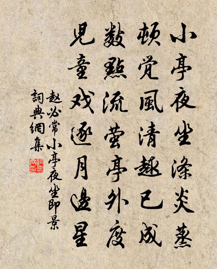 詩詞名句歷史字典書法欣賞書法字典國語詞典說文解字康熙字典古漢語字典標 題 作 者 詩 句 小亭夜坐即景作者:趙必常 朝代:宋代小亭夜坐即景原文小亭夜坐滌炎蒸,頓覺風清趣已成。數點流螢亭外度,兒童戲逐月邊星。詩詞問答問:小亭夜坐即景的作者是誰?答:趙必常問:小亭夜坐即景寫於哪個朝代?答:宋代趙必常小亭夜坐即景書法欣賞小亭夜坐即景書法作品詩詞推薦八月十五夜殷文圭〔唐代〕萬里無雲鏡九州,最團圓夜是中秋。滿衣冰彩拂不落,遍地水光凝欲流。華岳影寒清露掌,海門風急白潮頭。因君望夫石武元衡〔唐代〕佳名望夫處,苔蘚封孤石。萬里水連天,巴江暮雲碧。湘妃泣下竹成斑,子規夜啼江樹白。金剛隨機無盡頌離相寂滅分第十四釋印肅〔宋代〕慧命聞深義,五體如山禮。學海一時乾,心空方及第。冬至雪二首蘇轍〔宋代〕一氣潛萌九地中,雪花微落四無風。初陽便有回天力,宿瘴徐看捲地空。家釀再投猶恨薄,官酤多取定無功。時人偈公六十五首釋鹹傑〔宋代〕滿目紛紛呈瑞雪,填溝塞壑誰辨別。文殊無處頓渾身,普賢失卻真妙訣。烏鴉變作白頭鴉,鐵樹翻成銀線結。報諸題湘中館楊萬里〔宋代〕清境故應好,新寒殊不勝。征衣愁著盡,憑檻喜猶能。亂眼船離岸,關心山見棱。箇中有句在,下語更誰曾。奔避鄭谷〔唐代〕奔避投人遠,漂離易感恩。愁髯霜颯颯,病眼淚昏昏。孤館秋聲樹,寒江落照村。更聞歸路絕,新寨截荊門。游龍門邵雍〔宋代〕江天無少異,幽鳥下清沙。路去山形斷,川回渡口斜。龕岩千萬穴,店舍兩三家。清影四時好,都城況不賒。偈八首釋慧遠〔宋代〕拗折秤錘,掀翻露布。突相機先,鴉飛不度。自述陸游〔宋代〕屏跡歸休後,頤生寂寞中。忍貧辭半俸,學古得全功。西埭村醅釅,東陂小彴通。經行有佳趣,稚子也能同。如夢令譚處端〔元代〕鏡藥收來守拙。不遇知音難說。古鑒要予磨,點處便交光徹。歡悅。歡悅。袞出一輪明月。觀海潮王義山〔宋代〕憑誰撼得海門開,疑是神兵著力推。霎地起來銀一線,駕山捲起雪千堆。列江畫舫浮天去,幾片紅旗逐浪回。畢竟對月分韻得清字張繼先〔宋代〕碧霄澄徹素芒清,一片多情四海明。花院空庭冷香里,羽人心膽欲寒生。樂官山曾極〔宋代〕城破轅門宴賞頻,伶倫執樂淚橫巾。駢頭就戮緣家國,愧死南歸結綬人。為昆石蒲苗刪去焦葉戲成舒岳祥〔宋代〕細雨幽窗曉露垂。雁苗昆石兩相宜。老翁拔白知無用,且為昌蒲鑷退髭。觀鹽井二首袁說友〔宋代〕桔槔汲水三千丈,頃轉輪餘一日回。蓑笠傍城埋井底,皮囊契出滷泉來。呈公擇二首趙蕃〔宋代〕此地無此客,若人吾故人。論文皆意到,出語見情真。未議作輕別,且當留浹旬。畦蔬飽春雨,小摘未妨頻。和許寺丞泊釣龍台見寄蔡襄〔宋代〕釣龍台下艤行橈,獵獵船旗待晚潮。萬里征人應悵望,一川秋色正蕭條。雨雲來去山明滅,風浪高低日動搖。有志句王之望〔宋代〕雪班遠岫明蒼鬢,春秀奇峰擁翠鬟。為溫僕射嘲竹裴略〔唐代〕竹,風吹青肅肅。凌冬葉不凋,經春子不熟。虛心未得待國士,皮上何鬚生節目。名句推薦婚姻勿貪勢家。顏之推《顏氏家訓·止足篇》 無限河山淚,誰言天地寬夏完淳《別雲間》 麋鹿成群,虎豹避之;飛鳥成列,鷹鷲不擊劉向《說苑·雜言》 民之無良,相怨一方,受爵不讓,至於己斯亡。荀子《荀子·儒效》 江山如有待,花柳自無私。杜甫《後游》 一顧傾人城,再顧傾人國。李延年《李延年歌》 至誠之道可以前知。國家將興,必有禎祥;國家將亡,必有妖孽。子思《中庸·第二十四章》 旅館寒燈獨不眠,客心何事轉悽然。高適《除夜作》 舞低楊柳樓心月,歌盡桃花扇底風。晏幾道《鷓鴣天·彩袖殷勤捧玉鍾》 天門中斷楚江開,碧水東流至此回。李白《望天門山》