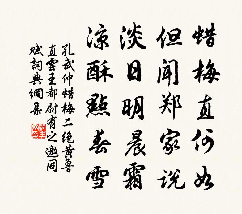 詩詞名句歷史字典書法欣賞書法字典國語詞典說文解字康熙字典古漢語字典標 題 作 者 詩 句 蠟梅二絕黃魯直雲王都尉有之邀同賦作者:孔武仲 朝代:宋代原文蠟梅直何如,但聞鄭家說。淡日明晨霜,涼酥點春雪。詩詞問答問:《蠟梅二絕黃魯直雲王都尉有之邀同賦》的作者是誰?答:孔武仲問:該詩寫於哪個朝代?答:宋代書法欣賞蠟梅二絕黃魯直雲王都尉有之邀同賦書法作品詩詞推薦河傳韋莊〔唐代〕何處,煙雨,隋堤春暮。柳色蔥蘢,畫橈金縷,翠旗高颭香風,水光融。青娥殿腳春妝媚,輕雲里,綽約司花妓。安康中秋書懷劉學箕〔宋代〕去年中秋吾廬成,月華逾晝風露清。今年中秋來安康,風涼雨冷天無光。去年把酒諸子輿,月落尊空未歸去。今年示汪居士釋宗杲〔宋代〕一毛頭上無邊剎,決定識情難測量。直下不生邪險見,壺中日月自然長。過真州沈德潛〔清代〕揚州西去真州路,萬樹垂楊繞岸栽。野店酒香帆盡落,寒塘漁散鷺初回。曉風殘月屯田墓,零露浮雲魏帝台。此夕上閩帥范石湖五首敖陶孫〔宋代〕丁年口伐真奇事,一代詩鳴不救貧。大手欲推浯水頌,群酋曾折石湖巾。乃今謝傳還初志,其奈王陽是故人。獨有舟上感興董嗣杲〔宋代〕飯時發雷江,倏已泊東流。南北兩岸雪,盪此無根舟。遠山失翠眉,近山生白頭。凍極方徯晴,雲冱含雨羞。塵境偈頌四十二首釋祖先〔宋代〕十五日已前明似鏡,十五日已後黑如漆。正當十五日,鶯遷喬木頻頻語,蝶戀芳叢對對飛。牡丹任希夷〔宋代〕沉香亭北露華春,曾識霓裳第一人。千載不歸羅襪夢,綠枝紅艷只如新。題醴泉驛二首李曾伯〔宋代〕過錯役三才,憂端萬有斯。君恩知欲報,子難痛何追。我馬方瘏矣,秋陽更暴之。原言行役者,當暑戒驅馳。雜詠陸游〔宋代〕家圃菜肥忘肉食,村場酒美勝官壼。終年醉飽無憂責,莫怪愚公老不枯。留題雲門草堂陸游〔宋代〕小住初為旬月期,二年留滯未應非。尋碑野寺雲生屨,送客溪橋雪滿衣。親滌硯池餘墨漬,臥看爐面散煙霏。他年夜二首杜甫〔唐代〕白夜月休弦,燈花半委眠。號山無定鹿,落樹有驚蟬。暫憶江東鱠,兼懷雪下船。蠻歌犯星起,空覺在天邊。城郭送益州同理張殿丞夏竦〔宋代〕遠指三川路,初辭六尚班。占星度危棧,叱馭下靈關。職亞銅符重,兵銷玉帳間。漢台誰視草,應待長卿還。喜聲伯謫還區仕衡〔宋代〕生還今日寸心明,客淚初收恨亦平。豈有安危關一疏,不知流逐到諸生。錢塘江上船猶待,玉枕山前屋未成。畎畎憶秦娥(正月初六日夜月)朱淑真〔宋代〕彎彎曲。新年新月鉤寒玉。鉤寒玉。鳳鞋兒小,翠眉兒蹙。鬧蛾雪柳添妝束。燭龍火樹爭馳逐。爭馳逐。元宵三五和正仲君子泉舒岳祥〔宋代〕脈來層嶂遠,影到片天清。洗硯雲根起,歸瓢乳味盈。岩花蒙潤澤,水草見分明。已遂投簪志,何須起濯纓。贈別王侍御赴任陝州司馬(一作贈王司馬赴陝州)張籍〔唐代〕京城在處閒人少,唯共君行並馬蹄。更和詩篇名最出,時傾杯酒戶常齊。同趨闕下聽鐘漏,獨向軍前聞鼓鼙。今日晚興陸游〔宋代〕身如病鶴謝樊籠,白盡衰髯臉尚紅。蒲葦陂塘新漲後,梧楸門巷夕陽中。遺名要耐千年看,快飲方夸百榼空。造物次韻朱兵部上已錫宴陳襄〔宋代〕禊飲開天苑,英游綴士林。鹿苹常長養,魚藻遂浮沈。和氣春台暖,恩波曲水深。追隨方外樂,歌吹夢中音。忽起戲答野人陸游〔宋代〕木葉凋疏天欲霜,老懷多感易淒涼。得君數語開人意,徑就湖橋醉夕陽。名句推薦聽風聽雨過清明。愁草瘞花銘。吳文英《風入松·聽風聽雨過清明》 唯見鴻雁飛,令人傷懷抱。高適《登百丈峰二首》 澗影見松竹,潭香聞芰荷。孟浩然《夏日浮舟過陳大水亭 / 浮舟過滕逸人別業》 外游者,求備於物;內觀者,取足於身。列子及其弟子《列子·仲尼》 兄弟者,分形連氣之人也。顏之推《顏氏家訓·兄弟篇》 紫陌紅塵拂面來,無人不道看花回。劉禹錫《元和十年自朗州至京戲贈看花諸君子 / 玄都觀桃花》 這次第,算人間沒個並刀,剪斷心上愁痕。黃孝邁《湘春夜月·近清明》 昭君拂玉鞍,上馬啼紅頰。李白《王昭君二首》 此中有真意,欲辨已忘言。陶淵明《飲酒·其五》 凌波不過橫塘路,但目送、芳塵去。賀鑄《青玉案·凌波不過橫塘路》