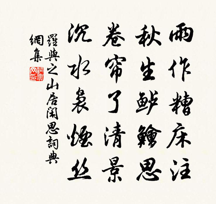 詩詞名句歷史字典書法欣賞書法字典國語詞典說文解字康熙字典古漢語字典標 題 作 者 詩 句 山居閒思作者:羅與之 朝代:宋代山居閒思原文雨作糟床注,秋生鱸鱠思。捲簾了清景,沉水裊菸絲。詩詞問答問:山居閒思的作者是誰?答:羅與之問:山居閒思寫於哪個朝代?答:宋代羅與之山居閒思書法欣賞山居閒思書法作品詩詞推薦木蘭花/玉樓春佚名〔宋代〕東風昨夜吹春晝。陡覺去年梅蕊舊。誰人能解把長繩,系得烏飛並兔走。清香瀲灩杯中酒。新眼苗條江上柳。尊前納涼羅公升〔宋代〕氣至暑固當,境寂涼自生。天河自如水,夜久山更明。古樹有莊色,新泉入幽聽。逃空空快事,喪虎不可停。飛螢早夏集公會亭餞金華道卿內翰守澶淵得符字宋祁〔宋代〕早夏乘休沐,離襟屬餞壺。欣同佩荷橐,恨及唱驪駒。感戀陪雲築,翻飛別帝梧。騰裝照魚服,行帳繞犀株。慚去春日山居好十首舒岳祥〔宋代〕春日山居好,柴門愛客過。連朝恣泥飲,隨意有山歌。句小從人學,才衰覺氣和。情懷依分足,好景不須多。寧宗郊祀二十九首學士院〔宋代〕崇台穹窿,高靈下墮。慶陰彷佛,從坐肉峨。宵升於丘,時通槿火。維天之命,百祿是荷。代悲哉行鮑照〔南北朝〕羇人感淑節。緣感欲回轍。我行詎幾時。華實驟舒結。覩實情有悲。瞻華意無悅。覽物懷同志。如何復乖別。翩翩感春三首張耒〔宋代〕冰消水面波光動,日暖樹梢花意歸。世上繁華隨日好,卻應春淺勝芳菲。行香子黃孝邁〔宋代〕一春花下,幽恨重重。又愁晴,又愁雨,又愁風。守歲應制沈佺期〔唐代〕南渡輕冰解渭橋,東方樹色起招搖。天子迎春取今夜,王公獻壽用明朝。殿上燈人爭烈火,宮中侲子亂驅妖。宜將丁宇田家有贈王維〔唐代〕〔英華作田家贈丁禹。注云。集作丁宇。誤也。〕君心尚棲隱。久欲傍歸路。在朝每為言。解印果成趣。晨雞鳴鄰山居舒岳祥〔宋代〕雀飲梅凡雪,魚吞水面雲。山居差有味,世事不堪聞。野燒窮豬穴,晴霄轉雁群。溪寒春未著,閏月壓余分。大衍易吟四十首方回〔宋代〕訟吉觀西伯,師中驗太公。得人師不戰,反已訟無終。皆春胡仲弓〔宋代〕黃鐘一萌動,物物皆陽春。天地妙囊簽,滿腔都是仁。代人上師垣生辰仲並〔宋代〕不用天河洗甲兵,只憑直道致昇平。三王事業賢臣主,一代師儒難弟兄。屢薄賦徭民鼓舞,盡除氛翳國清明。休將宜春書事汪應辰〔宋代〕饑寒驅出故山來,俗事如麻撥不開。問我此行何所得,未嘗識面有澹臺。漱玉軒為邑之佳處頃春祝寺僧少葺之重來則眼李石〔宋代〕知是禪師琢玉工,玉聲猶作水玲瓏。琢成大士笑無語,只在聲聞一悟中。初入蜀州閣道作宋祁〔宋代〕緣雲棧腳轉嵯峨,使者重來叱馭過。杜宇有冤啼夜月,女蘿憑鬼護山阿。岩深樹氣埋蒼霧,峽窄江形束素波。自問寄潘子善上舍劉宰〔宋代〕少陽一疏折 * ,拂袖歸來日月閒。誤國小人猶法從,叩閽諸子自賢關。是非頗亦通千古,義利那能立兩間。若向朱郎元章以予不得宮觀與諸侄有唱和見寄攬之晁說之〔宋代〕莫笑吹笙便得仙,絕勝祭灶事茫然。白頭吏役徒多犯,黃帽閒居政寡緣。仰愧高僧能五鬣,俯慚垂柳解三眠。詩成觀棋羅公升〔宋代〕秋風動江臯,吹落鷗鷺影。先生江湖心,收作目中景。庭深樹陰好,門掩禽語靜。一聲寂寞中,恍若隔人境。胸中名句推薦夫謀必素見成事焉,而後履之左丘明《國語·吳語·越王勾踐命諸稽郢行成於吳》 鳳凰城闕知何處,寥落星河一雁飛。賀鑄《思越人·紫府東風放夜時》 花無人戴,酒無人勸,醉也無人管。黃公紹《青玉案·年年社日停針線》 紫黯紅愁無緒,日暮春歸甚處?龔自珍《如夢令·紫黯紅愁無緒》 脈脈花疏天淡,雲來去、數枝雪。范成大《霜天曉角·梅》 彩線輕纏紅玉臂,小符斜掛綠雲鬟。佳人相見一千年。蘇軾《浣溪沙·端午》 土花曾染湘娥黛,鉛淚難消。納蘭性德《採桑子·土花曾染湘娥黛》 得天下英才而教育之。孟子《孟子·盡心章句上·第二十節》 魄依鉤樣小,扇逐漢機團。薛濤《月》 夢斷香消四十年,沈園柳老不吹綿。陸游《沈園二首》