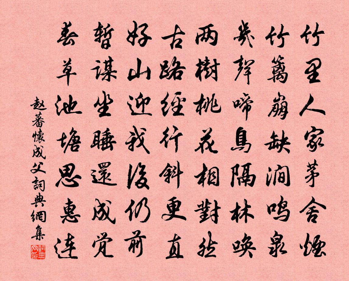 詩詞名句歷史字典書法欣賞書法字典國語詞典說文解字康熙字典古漢語字典標 題 作 者 詩 句 懷成父作者:趙蕃 朝代:宋代懷成父原文竹里人家茅舍煙,竹籬崩缺澗鳴泉。幾聲啼鳥隔林喚,兩樹桃花相對然。古路經行斜更直,好山迎我後仍前。暫謀坐睡還成覺,春草池塘思惠連。詩詞問答問:懷成父的作者是誰?答:趙蕃問:懷成父寫於哪個朝代?答:宋代趙蕃懷成父書法欣賞懷成父書法作品詩詞推薦陪考功王員外城東池亭宴錢起〔唐代〕無雙錦帳郎,絕境有林塘。鶴靜疏群羽,蓬開失眾芳。晴山看不厭,流水趣何長。日晚催歸騎,鐘聲下夕陽。題皇甫荀藍田廳賈島〔唐代〕任官經一年,縣與玉峰連。竹籠拾山果,瓦瓶擔石泉。客歸秋雨後,印鎖暮鍾前。久別丹陽浦,時時夢釣船。呈陸嚴州二首趙蕃〔宋代〕一代詩盟孰主張,試探源委見深長。家聲甫里歸嚴瀨,句法茶山出豫章。千里寸心長炯炯,十年兩鬢漫蒼蒼。扁舟泛湖十絕句陳造〔宋代〕浦漵樓台遠近殊,樽罍隨處小踟躕。高郎頗勝高常侍,解把西湖敵孟諸。鵲橋仙(七夕)謝懋〔宋代〕鉤簾借月,染云為幌,花面玉枝交映。涼生河漢一天秋,問此會、今宵孰勝。銅壺尚滴,燭龍已駕,淚浥西風不盡清江道中橘園甚夥范成大〔宋代〕芳林不斷清江曲,倒影入江江水綠。未論萬戶比封君,瓦屋人家衣食足。暑風泛花蘭芷香,秋日籬落明青黃。客舟公邁何遄曾豐〔宋代〕公之南矣,潭人是懷,洪人是留。議奪朱幡,亟哉還休。御者既靷,錢者既挽。俄馳頃驅,僄其未返。洪人曰{左挽鄭昂叔珪母蔡夫人二首王邁〔宋代〕鍾秀端明裔,來嬪通德家。早甘寒水玉,晚愛白蓮花。樂施陰功厚,回班慶事賒。他年龍鳳麓,曾典有光華。頌古十七首釋道行〔宋代〕門前石塔子,八白與九紫。方道既分明,免被巡官使。文宣王及其弟子贊宋高宗〔宋代〕孰封於蕭,實惟子柳。夙飫格言,克遵善誘。明德斯馨,賢業所就。以侑於儒,傳芳逾茂。秋日遣懷陸游〔宋代〕西來浮濤江,東眺俯鏡湖。其中綿千里,鬱郁桑麻區。禹葬有遺窆,粵亡無故墟。秋風吹短褐,望古空躊躇。送朱郎中壽昌通判河中府蘇頌〔宋代〕邶詩詠凱風,以成孝子志。鄭人復君母,傳稱能錫類。中郎常有懷,生不識所恃。登朝雖厚祿,當食每忘饋。念昔奉送五叔入京兼寄綦毋三李頎〔唐代〕雲陰帶殘日,悵別此何時。欲望黃山道,無由見所思。木筆花董嗣杲〔宋代〕始開已落謾芳菲,暗寫東皇幾夕暉。傍樹誰矜火焰異,對花自感壯年非。紅脂含蒂長枝勁,紫粉粘蕤老葉肥。名占賀新郎(叔母生日用許侍郎奕所和去歲詞韻為謝)魏了翁〔宋代〕誰主誰為客。嘆人生、別離容易,會逢難得。省戶高門十年夢,瞥忽渾如昨夕。風不定、亂雲飛急。本自無心圖富壽延邁叔祖程公許〔宋代〕吾宗譜牒祖通義,蟬聊到公十五世。五派之分同一源,如木有本瓜有蒂。公家門戶最赫奕,簪紱相承真鮮儷。堂堂寄韓仲止主簿趙蕃〔宋代〕海內知名長少公,在今誰復可同風。可憐籍湜今頭白,空復掛名家集中。憶秦娥佚名〔宋代〕嬌滴滴。雙眉斂破春山色。春山色。為君含笑,為君愁蹙。多情別後無訊息。此時更有誰知得。誰知得。夜深無寐浪淘沙(余畫墨水仙並題其上)張炎〔宋代〕回首欲婆娑。淡掃修蛾。盈盈不語奈情何。應恨梅兄礬弟遠,雲隔山阿。弱水夜寒多。帶月曾過。羽衣飛過染餘波永定寺客窗釋行海〔宋代〕千古門前水自流,小春天氣奪清秋。寂寥方丈黃昏月,照見梨花一樹愁。名句推薦鳥飛反鄉,兔走歸窟,狐死首丘,寒將翔水,各哀其所生。劉安及其門客《淮南子·說林訓》 凡事當留餘地,得意不宜再往。朱柏廬《朱子家訓·全文》 擊鼓其鏜,踴躍用兵。佚名《擊鼓》 向露冷風清,無人處,耿耿寒漏咽。周邦彥《浪淘沙慢·曉陰重》 霧冷笙簫,風輕環佩,玉鎖無人掣朱敦儒《念奴嬌·插天翠柳》 三更燈火五更雞,正是男兒讀書時。顏真卿《勸學詩》 內官初賜清明火,上相閒分白打錢。韋莊《長安清明》 倉稟無宿儲,徭役猶未已。韋應物《觀田家》 禁里疏鍾官舍晚,省中啼鳥吏人稀。王維《酬郭給事 / 贈郭給事》 困花壓蕊絲絲雨,不堪只共愁人語。徐燦《菩薩蠻·春閨》