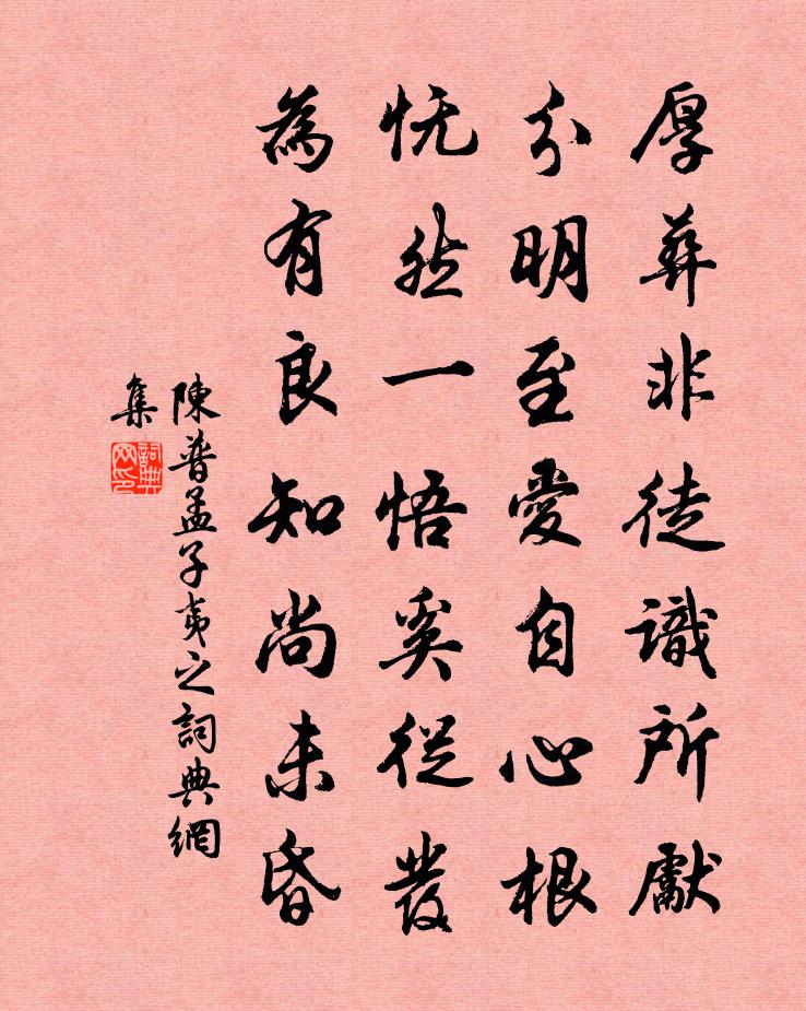 詩詞名句歷史字典書法欣賞書法字典國語詞典說文解字康熙字典古漢語字典標 題 作 者 詩 句 孟子夷之作者:陳普 朝代:宋代孟子夷之原文厚葬非徒識所先,分明至愛自心根。憮然一悟奚從發,為有良知尚未昏。詩詞問答問:孟子夷之的作者是誰?答:陳普問:孟子夷之寫於哪個朝代?答:宋代陳普孟子夷之書法欣賞孟子夷之書法作品詩詞推薦賀喬丞相厲寺正〔宋代〕相公一身兼,爵德齒俱全。劍履登金殿,山川錫土田。龜游蓮葉露,蟻泛菊花天。白鷺洲邊守,重賡綠竹篇。客夜不寐四首陳造〔宋代〕陣鴻轇轕上雲衢,夢欲成時每破除。少睡更堪寒夜永,新來熟遍少時書。寄遠人翁卷〔宋代〕秋氣日淒清,秋衣紉未成。在家猶不樂,行路若為情。幾處好山色,暮天群雁聲。分明相憶夢,夜夜出江城。在伯沅陵俱和前詩複次韻五首趙蕃〔宋代〕二君思飄飄,獨我意落落。博乎猶賢已,謔兮不為虐。是中有關鍵,未易輕啟鑰。至味匪鹽梅,舍古復奚酌。李提刑李參政再和招鶴詩再用韻以謝魏了翁〔宋代〕鬚眉皓白何為者,未出山時舉世忙。若使當時容易致,等閒鶖鶴混魚梁。味道白居易〔唐代〕叩齒晨興秋院靜,焚香冥坐晚窗深。七篇真誥論仙事,一卷檀經說佛心。此日盡知前境妄,多生曾被外塵侵。自嫌送許璋監簿歸泰州梅堯臣〔宋代〕木枯鳥不巢,泉涸魚不游。我非魚鳥情,貧縛路阻修。高陽有令子,嗣世學已優。前日來京城,問恤忍涕流。今失繞佛閣周邦彥〔宋代〕暗塵四斂,樓觀回出,高映孤館。清漏將短,厭聞夜久簽聲動書幔。桂華又滿,閒步露草,偏愛幽遠。花氣清婉。繡鸞鳳花犯·賦水仙周密〔宋代〕楚江湄,湘娥乍見,無言灑清淚。淡然春意。空獨倚東風,芳思誰寄。凌波路冷秋無際。香雲隨步起。謾記得,漢天仙子(別渝州·仙呂調)張先〔宋代〕醉笑相逢能幾度。為報江頭春且住。主人今日是行人,紅袖舞。清歌女。憑仗東風教點取。三月柳枝柔似縷。落絮述懷陳梅莊〔宋代〕一片愁心怯杜鵑,懶妝從任鬢雲偏。怕郎卻起陽關意,常掩琵琶第四弦。失調名佚名〔宋代〕敧枕無眠又無寐。又次王恭叔韻樓鑰〔宋代〕人為天地最靈物,野卉無情猶若此。石間薜荔水昌陽,卷柏生崖並葛藟。是皆草中號長久,未見縣空解葩蘂。柯葉村咱有呼予老朝奉者方回〔宋代〕真公真相自難誣,非相非公亦好諛。誰忽謂予老朝奉,心知不是贗稱呼。大龍湫徐璣〔宋代〕瀑水數千尺,何曾貼石流。還疑眾山坼,故使半空游。霧雨初相亂,波濤忽自由。道場從建後,龍去任人游。歸去來辭陳普〔宋代〕歸去來兮,吾生復何之。故園三徑在,桃李不成蹊。台榭荒涼已無憂,階除寂寞人已希。胡飄飄而不返,將役役以敷淨人求僧贊陸游〔宋代〕光薙頭,淨洗缽,頭頭拈起頭頭活。有時與,有時奪,受用現前活鱍鱍。敷道者,一短褐,欠箇什麽更要惡水潑。寄李都尉釋重顯〔宋代〕水月拈來作者殊,東西南北謾區區。也知金粟李居士,端坐重城笑老盧。送簡棲上人之建州覲使君舅皎然〔唐代〕亂峰江上色,羨爾及秋行。釋氏推真子,郗家許貴甥。氎花新雨淨,帆葉好風輕。千里依元舅,回潮亦有情。三印頌示眾釋正覺〔宋代〕印空印水印泥,無言桃李成蹊。隨分納些稅賦,牧牛溪水東西。名句推薦女為君子儒,無為小人儒。孔子弟子《論語·雍也篇》 江上月明胡雁過,淮南木落楚山多。劉長卿《江州重別薛六柳八二員外》 一樹梨花一溪月,不知今夜屬何人?佚名《雜詩·舊山雖在不關身》 君子敵小人,亦小人也。小人友君子,亦君子也。來俊臣《羅織經·制敵卷第五》 畫棟朝飛南浦雲,珠簾暮卷西山雨。王勃《滕王閣詩》 紅豆生南國,春來發幾枝。王維《相思》 此情可待成追憶?只是當時已惘然。李商隱《錦瑟》 中人以上,可以語上也;中人以下,不可以語上也。孔子弟子《論語·雍也篇》 微雨眾卉新,一雷驚蟄始。韋應物《觀田家》 菊花何太苦,遭此兩重陽?李白《九月十日即事》