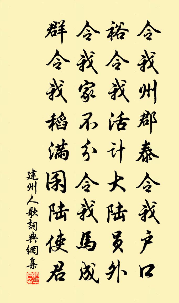 詩詞名句歷史字典書法欣賞書法字典國語詞典說文解字康熙字典古漢語字典標 題 作 者 詩 句 建州人歌作者:佚名 朝代:唐代建州人歌原文令我州郡泰,令我戶口裕,令我活計大,陸員外。令我家不分,令我馬成群,令我稻滿囷,陸使君。詩詞問答問:建州人歌的作者是誰?答:佚名問:建州人歌寫於哪個朝代?答:唐代問:佚名的名句有哪些?答:佚名名句大全佚名建州人歌書法欣賞建州人歌書法作品詩詞推薦薔薇花張祜〔唐代〕曉風抹盡燕支顆,夜雨催成蜀錦機。當晝開時正明媚,故鄉疑是買臣歸。次梅齋嚴韻蘇籀〔宋代〕振條裂石寒颼颼,霰集黃昏天為愁。若蘭政恐遠庭戶,健步斸本移岩幽。斷魂能返神可雪,照夜薰天欲奔月。妖韶龍興客旅效子美寓居同谷七歌李新〔宋代〕隔窗冷吹嘯疏篁,頹雲逼月色無光。南鄰昨歌今日哭,訣另未永相思長。我今與之正同調,無錐能直九迴腸。嗚呼虎丘六絕句致爽閣范成大〔宋代〕碧嶂橫陳似斷鰲,畫闌相對兩雄豪。東軒只有雲千頃,不似西山爽氣高。禮部直舍枯竹嫩叢燕雀飛來欲折以二韻記雲鄭剛中〔宋代〕火邊遺竹但枯枝,瘦筍叢生未及齊。篠嫩不禁風燕立,綠梢煙外起還低。餞王尚書出邊張九齡〔唐代〕漢相推人傑,殷宗伐鬼方。還聞出將重,坐見即戎良。上策應為豫,中權且用光。令申兵氣倍,威憺虜魂亡。樹比櫻桃蘇軾〔宋代〕獨遶櫻桃樹,酒醒喉肺乾。莫除枝上露,從向口中漙。句幸夤遜〔唐代〕片逐銀蟾落醉觥。水調歌頭(小憩袁氏園用前韻)吳潛〔宋代〕老圃無關鎖,放客意中行。頗欣天地開闊,煙釣與雲耕。荷長亭亭翠蓋,竹長森森翠葆,景致鬧裝成。幾樹榴花發攤破浣溪沙·病起蕭蕭兩鬢華李清照〔宋代〕病起蕭蕭兩鬢華,臥看殘月上窗紗。豆蔻連梢煎熟水,莫分茶。枕上詩書閒處好,門前風景雨來佳,終日向人多醞夜夜曲沈約〔南北朝〕河漢縱且橫,北斗橫復直。星漢空如此,寧知心有憶?孤燈暖不明,寒機曉猶織。零淚向誰道,雞鳴徒嘆息。洞仙歌佚名〔宋代〕千崖滴翠。正秋高時候。橙黃橘綠又重九。有蓬壺仙子、赤鯉來游,風雲會,施展經綸妙手。去年稱壽處,北斗天東門送客李端〔唐代〕綠楊新草路,白髮故鄉人。既壯還應老,游梁復滯秦。逢花莫漫折,能有幾多春。百門義呈君俞輒成短章韓維〔宋代〕一微塵上百門成,空里花飛谷里鳴。海印元來君自有,聊將黃葉止啼聲。辭黃山黃道周〔明代〕亦是吾家峰,神物不可譜。頂髻在心眸,一一屈指數。句陸贄〔唐代〕繞階流??,來砌樹陰陰。(任江淮尉題廳,《語林》)散步後園曾豐〔宋代〕簿書不放出公出,飯罷舂容步後園。燕子方歸猶認主,竹君未老已生孫。姚王泣雨淚含怨,望帝啼風聲帶冤。新舊漁父詞(其十五)趙構〔宋代〕清灣幽島任盤紆。一舸橫斜得自如。惟有此,更無居。從教紅袖泣前魚。叢菊宋祁〔宋代〕煙開容花密,霜重放叢斜。插著星星畔,潛郎稱晚花。題陳朝乾山亭二首綠野姜特立〔宋代〕豐草茂林皆綠野,不論韋弁與貂蟬。但能真得箇中趣,何必功名如昔賢。名句推薦榮寵非命,謀之而後善;吉凶擇人,慎之方消愆。來俊臣《羅織經·固榮卷第六》 清明時節出郊原,寂寂山城柳映門。楊徽之《寒食寄鄭起侍郎》 寒泉貯、紺壺漸暖,年事對、青燈驚換了。吳文英《花犯·謝黃復庵除夜寄古梅枝》 今宵酒醒何處?楊柳岸,曉風殘月。柳永《雨霖鈴·寒蟬淒切》 歸師勿遏,古人畏之,死地兵不可輕 也。李大師、李延壽《南史·列傳·卷二十五》 女也不爽,士貳其行。士也罔極,二三其德。佚名《氓》 山有扶蘇,隰有荷華。佚名《山有扶蘇》 鎮日思歸歸未得,孤負殷勤杜宇。王瀾《念奴嬌·避地溢江書於新亭》 江燕話歸成曉別,水花紅減似春休。西風梧井葉先愁。吳文英《浣溪沙·秋情》 萬事到頭都是夢,休休。明日黃花蝶也愁。蘇軾《南鄉子·重九涵輝樓呈徐君猷》