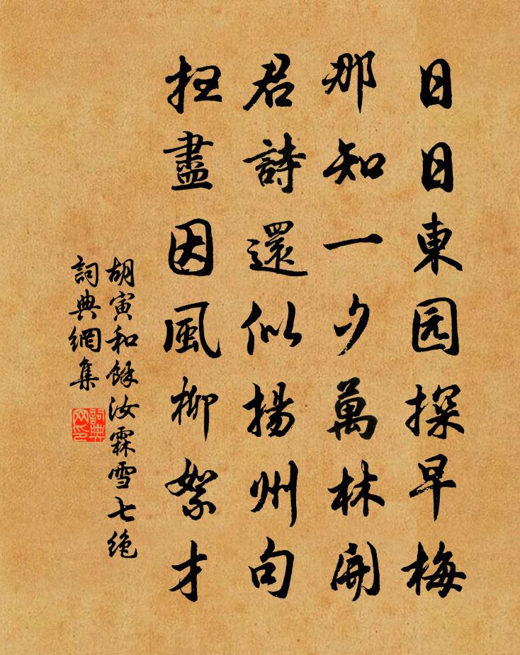 詩詞名句歷史字典書法欣賞書法字典國語詞典說文解字康熙字典古漢語字典標 題 作 者 詩 句 和余汝霖雪七絕作者:胡寅 朝代:宋代和余汝霖雪七絕原文日日東園探早梅,那知一夕萬林開。君詩還似揚州句,掃盡因風柳絮才。詩詞問答問:和余汝霖雪七絕的作者是誰?答:胡寅問:和余汝霖雪七絕寫於哪個朝代?答:宋代胡寅和余汝霖雪七絕書法欣賞和余汝霖雪七絕書法作品詩詞推薦山陂王安石〔宋代〕山陂院落今挼種,城郭樓台已敦燈。白髮逢春唯有睡,睡間啼鳥亦生憎。庵居雜詠九首張繼先〔宋代〕甓瓦完齊土壁堅,籓籬周匝沒疏穿。人來謾笑無華旆,風雨須教安穩眠。同王十三維偶然作十首儲光羲〔唐代〕仲夏日中時,草木看欲燋。田家惜工力,把鋤來東皋。顧望浮雲陰,往往誤傷苗。歸來悲困極,兄嫂共相譊。無錢金陵雜興二百首蘇泂〔宋代〕江鷗野鴨自保社,黑黑白白斗分明。東邊唼唼西邊舞,安得吾身似汝輕。臨江仙(壽老人)盧炳〔宋代〕弱水蓬萊真勝地,祥煙閃爍霓旌。瑤池歡會下雲軿。康寧新喜事,淑善舊家聲。戲采捧觴真樂事,蟠桃獻壽千春。送李評事使蜀王建〔唐代〕勸酒不依巡,明朝萬里人。轉江雲棧細,近驛板橋新。石冷啼猿影,松昏戲鹿塵。少年為客好,況是益州春。蝶戀花陳允平〔宋代〕落盡櫻桃春去後。舞絮飛綿,撲簌穿簾牖。異別情懷愁對酒。翠條折贈勞親手。繡幕深沉寒尚透。雨雨晴晴,妝點徐人歌先秦無名〔先秦〕延陵季子兮不忘故。脫千金之劍帶丘墓。三賢堂張景脩〔宋代〕如是國清寺,宜乎天下聞。水聲常夜雨,山氣即朝雲。今古三賢隱,仙凡兩路分。唐人書畫在,明日更殷勤。秘書省有賀監知章草題詩筆力遒健風尚高遠…因有此作溫庭筠〔唐代〕越溪漁客賀知章,任達憐才愛酒狂。鸂鶒葦花隨釣艇,蛤蜊菰菜夢橫塘。幾年涼月拘華省,一宿秋風憶故鄉。榮路木犀方岳〔宋代〕羽觴和月嚼冰黃,自笑詩腸老更剛。四出雪花些小大,五千書傳一齊香。君從底處移仙籍,日飲無何作醉鄉。風露哭同年羅著作王禹偁〔宋代〕荒涼故宅何人住,寂寞孀妻即日還。一歲嬰兒安健否,巨源雖在謫深山。外甥三郎刪定和予冠字韻詩極可喜再用其韻作晁說之〔宋代〕趙甥詩與雅音合,韋舅宜高進德冠。我到古人良已遠,汝家宗姓莫教難。傳家自喜春秋在,居職應憐翰墨殘。門戶景靈宮殿多植酴醾清香遠聞孔武仲〔宋代〕宮殿沈沈鎖碧雲,仙葩相倚正敷芬。珠簾翠幄知多少,不礙清香處處聞。歲除增寺看寫疏作陳藻〔宋代〕元正祈禱萬各般,縱道聰明聽也難。料得鬼神應喜我,不曾投疏一相干。失調名陸游〔宋代〕飛上錦裀紅皺。山居十二首淳藏王〔宋代〕漁父子歌甘露冷,擬寒山詠法燈詩。深雲莫謂燕無人聽,萬像森羅歷歷知。懷梅水村十絕用張小山韻趙必象〔宋代〕紙衾如水夢難成,抱膝燈前讀北征。懊恨雁來無個字,海雲千里雨溟溟。宋宣獻公輓詞三首歐陽修〔宋代〕望系朝廷重,文推天下工。清名畏楊綰,故事問胡公。物議垂為相,風流頓已窮。仁言博哉利,獻替有遺忠。梅魂黃庚〔宋代〕夢覺羅浮跡已陳,至今想像事如新。相思一樣窗前月,似見三生石上春。的的孤芳冰氣魄,疏疏冷蕊雪精神。料應名句推薦前村深雪裡,昨夜一枝開。齊己《早梅》 天際疏星趁馬,簾晝隙、冰弦三疊。吳文英《暗香·送魏句濱宰吳縣解組分韻得闔字》 伏波惟願裹屍還,定遠何鬚生入關。李益《塞下曲》 笛中聞折柳,春色未曾看。李白《塞下曲六首·其一》 曲則全,枉則直,窪則盈,敝則新,少則得,多則惑。老子《老子·道經·第二十二章》 簫鼓追隨春社近,衣冠簡樸古風存。陸游《游山西村》 後庭花一曲,幽怨不堪聽。劉禹錫《金陵懷古》 我所居兮,青埂之峰。我所游兮,鴻蒙太空。誰與我游?兮,吾誰與從。曹雪芹《紅樓夢·第一百二十回》 橋北橋南千百樹,綠煙金穗映清流。朱栴《官橋柳色》 江暗雨欲來,浪白風初起。何遜《相送》