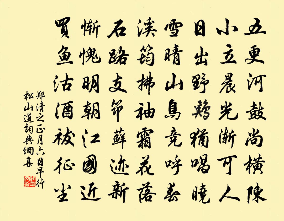詩詞名句歷史字典書法欣賞書法字典國語詞典說文解字康熙字典古漢語字典標 題 作 者 詩 句 正月六日早行松山道作者:鄭清之 朝代:宋代正月六日早行松山道原文五更河鼓尚橫陳,小立晨光漸可人。日出野雞猶唱曉,雪晴山鳥競呼春。溪筠拂袖霜花落,石路支筇蘚跡新。慚愧明朝江國近,買魚沽酒祓征塵。詩詞問答問:正月六日早行松山道的作者是誰?答:鄭清之問:正月六日早行松山道寫於哪個朝代?答:宋代鄭清之正月六日早行松山道書法欣賞正月六日早行松山道書法作品詩詞推薦次韻答趙文卿四首陳造〔宋代〕小燕招邀慰病顏,何曾雨澀與風慳。分明喜鵲先知得,未曉飛鳴鬧屋山。春陰忽霽楊萬里〔宋代〕雲膜辛勤護月華,一重縠子一重紗。玉奩忽透菱花影,淡與油窗描杏花。泛舟陸游〔宋代〕去去泛輕舠,飄然興自豪。葉凋山寺出,溪瘦石橋高。草徑牛羊下,煙村鸛鶴號。還家一杯酒,未畏暮風饕。唐樂府十首輸者謳劉駕〔唐代〕挽粟上高山,高山若平地。力盡心不怨,同我家私事。去者不遑寧,歸者唱歌行。相逢古城下,立語天未明。一身白雲林通〔宋代〕白雲亭構見浮圖,賢尹標名意有餘。閒抱石岩禪客座,影籠墨跡憲台書。玎璫玉溜無停響,瀟灑琅玕不用疏。登賞水龍吟·從商帥國器獵於南陽同仲澤鼎玉賦此元好問〔金代〕從商帥國器獵於南陽,同仲澤、鼎玉賦此。少年射虎名豪,等閒赤羽千夫膳。金鈴錦領,平原千騎,星流電轉。路七夕二首·其一德容〔明代〕玉露金風報素秋,穿針樓上獨含愁。雙星何事今宵會,遺我庭前月一鉤。贈筆工馮應科方回〔宋代〕世言善書不擇筆,此物豈可不精擇。空弓難責養由射,快劍始堪孟賁擊。多錢而賈長袖舞,工良器利貴相得。文房初夏三絕呈遊子明、王仲顯其范成大〔宋代〕送春迎夏未聞雷,日日斜風細雨來。不是故人能裹飯,柴門雖設為誰開?晝錦堂孫惟信〔宋代〕薄袖禁寒。輕妝媚晚,落梅庭院春妍。映戶盈盈,回倩笑整花鈿。柳裁雲剪腰支小,鳳蟠鴉聳髻鬟偏。東風裡,香臘酒梅堯臣〔宋代〕汲井轆轤鳴,寒泉碧瓮盛。欲為三伏美,方俟十旬清。夢憶黃公舍,徒聞韋氏名。熟時梅杏小,獨飲效淵明。少室南原元好問〔金代〕地僻人煙斷,山深鳥語嘩。清溪鳴石齒,暖日長藤芽。綠映高低樹,紅迷遠近花。林間見雞犬,直擬是仙家。次岳尚書韻王諶〔宋代〕細字書橫雙眼明,破窗閱盡幾陰晴。年來乾祿渾夢行,老去吟詩尚有情。謾向紙田耕石硯,斷無金縷侑銀觥。和篇高宗郊祀前廟朝享太廟三十首真宗〔宋代〕盛德豈功,一祖六宗。欽翼燕詒,社享是崇。萬意齊精,假齋惟恭。率禮周旋,福祿來同。策師南遊過三峽見予求施以詩會余憂悲苦惱無馮時行〔宋代〕策骨寒瘦枯梅枝,梅花開時徵我詩。我詩悲瘁作無意,借梅代我陳其詞。梅雲最先得春意,桃花亂攙作佛事。千年奉和御製甘雨應祈夏竦〔宋代〕少臯九秋當季月,成湯六禱動靈心。中宵甘澍均豐浸,盡日層雲結遠陰。銷去驕陽為瑞重,招來嘉應感人深。側身題紙鳶止宋齊丘哭子李家明〔唐代〕安排唐祚革強吳,儘是先生作計謨。一個孩兒拚不得,讓皇百口合何如?【仙呂】村里迓鼓佚名〔元代〕我向這水邊林下,蓋一座竹籬茅舍。閒時節觀山玩水,悶來和漁樵閒話。我將這綠柳栽, * 種,山林如畫。悶來江湖偉觀山亭二首葉茵〔宋代〕結束虛亭近太清,山光水影互逢迎。人心祗覺山多險,幾個人心不樣平。暮熱游荷池上五首楊萬里〔宋代〕也不多時便立秋,寄聲殘暑速拘收。瘦蟬有得許多氣,吟落斜陽未肯休。名句推薦紗窗日落漸黃昏,金屋無人見淚痕。劉方平《春怨》 一霎荷塘過雨,明朝便是秋聲。項鴻祚《清平樂·池上納涼》 意內稱長短,終身荷聖情。杜甫《端午日賜衣》 落梅庭榭香,芳草池塘綠。晏幾道《生查子·落梅庭榭香》 一念慈祥,可以醞釀兩間和氣;寸心潔白,可以昭垂百代清芬。洪應明《菜根譚·概論》 酒亂性,色迷人。施耐庵《水滸傳·第四十五回》 怪人不知理,知理不怪人。佚名《增廣賢文·下集》 思君若汶水,浩蕩寄南征。李白《沙丘城下寄杜甫》 梳洗罷,獨倚望江樓。溫庭筠《望江南·梳洗罷》 青梅如豆柳如眉,日長蝴蝶飛。歐陽修《阮郎歸·南園春半踏青時》