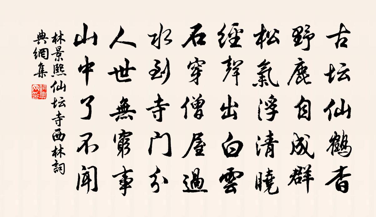 詩詞名句歷史字典書法欣賞書法字典國語詞典說文解字康熙字典古漢語字典標 題 作 者 詩 句 仙壇寺西林作者:林景熙 朝代:宋代仙壇寺西林原文古壇仙鶴杳,野鹿自成群。鬆氣浮清曉,經聲出白雲。石穿僧屋過,水到寺門分。人世無窮事,山中了不聞。詩詞問答問:仙壇寺西林的作者是誰?答:林景熙問:仙壇寺西林寫於哪個朝代?答:宋代林景熙仙壇寺西林書法欣賞仙壇寺西林書法作品詩詞推薦又擊毬司馬光〔宋代〕肅奉承軺命,仍陪戲馬游。朋分初迥出,勢合復相收。顧盼華星激,縈迴紫電流。良因重嘉好,禮接使臣優。劉子華儒吏方回〔宋代〕短檠徹曉一燈寒,椰腹中藏萬卷寬。了事足為良吏易,讀書真作大儒難。隱身雁鶩雖常調,致位貂蟬可顯官。褒鄂古樂府釋斯植〔宋代〕青雲千里心,白鷺一點雪。誰將玉笛吹,吹下關山月。送靈應上人賈島〔唐代〕遍參尊宿遊方久,名岳奇峰問此公。五月半間看瀑布,青城山裏白雲中。句元絳〔宋代〕陳前輿服同桓傅,拜後金珠有魯公。許生南歸梅堯臣〔宋代〕大盤小盤堆明珠,海估眩目迷精麤。斗量入貢由掇拾,未必一一疵纇無。不貢亦自有光價,此等固知魚目殊。許生吏隱宜春郡詩十首祖無擇〔宋代〕吏隱宜春郡,鄉園去路賒。間關成客宦,荏苒度年華。出水魚吞餌,辭山鳳在笯。誰言千里隔,夜夜夢吾家。寄秋懷趙蕃〔宋代〕兩載沅湘役,雖勞何所為。蝦行仍蛭渡,猶豫復狐疑。孰念鋤犁把,殊勝手板持。山南與山北,舒了更從誰。留別張廣文王建〔唐代〕謝恩新入鳳凰城,亂定相逢合眼明。千萬求方好將息,杏花寒食的同行。同永叔子聰游嵩山賦十二題其十二峻極寺梅堯臣〔宋代〕山高路已窮,倏爾逢蘭若。落日老僧閒,支頤古松下。緩步入禪庭,苔蒼但蕭灑。頌釋印肅〔宋代〕一句當天正信希,欲談詞喪懶投機。高峰既遠休尋訪,不惜眉毛為發揮。瀟湘八景詩瀟湘夜雨張經〔宋代〕終夜雨瀟瀟,悶殺孤舟客。滴滴打蓬聲,錯訝靈妃瑟。觀擊食王洋〔宋代〕結習慕金仟,西方省問禪。時分四季社,報積後生緣。念戀期無間,辛勤已有年。會緣如有約,此理自誰傳。同韓郎中閒庭南望秋景韋應物〔唐代〕朝下抱餘素,地高心本閒。如何趨府客,罷秩見秋山。疏樹共寒意,游禽同暮還。因君悟清景,西望一開顏。花門外楊維楨〔元代〕大唐宇宙非金甌,黃頭奚兒蟆作虬。跳河蹙隴翻九土,驚烏夜半呼延秋。朔方健兒袖雙手,戰馬嘶春舞楊柳。當時和趙景賢使君入昌溪即事陽枋〔宋代〕東出峽如筒,北行溪似線。晨發 * ,午炊喜破晛。灘高石嵌崎,浪急珠璣濺。平生憂患心,對此倍克戰。棹夫王樞使生辰喻良能〔宋代〕金華千古赤松宅,中有初平叱羊石。雙溪袞袞瀉蒼波,三洞潭潭接天碧。鍾英孕粹昴星精,文章蚤歲瑞王廷。橫飛游赤石進帆海謝靈運〔魏晉〕首夏猶清和,芳草亦未歇。水宿淹晨暮,陰霞屢興沒。周覽倦瀛壖,況乃陵窮髮。川後時安流,天吳靜不發。揚帆客有駑馬不肯借作詩誚之晃沖之〔宋代〕胡兒少欲立奇功,貴買西宛玉面驄。金躞蹀微鳴躡影,錦連錢不動追風。庭槐洗立清陰下,沙路調行返照中。出郭留別永叔梅堯臣〔宋代〕舊友競留連,我征時已晚。但言會合難,豈道行路遠。行路到有期,別離未即返。明當各相思,念此去且懶。名句推薦他鄉共酌金花酒,萬里同悲鴻雁天。盧照鄰《九月九日玄武山旅眺》 心似已灰之木,身如不系之舟。蘇軾《自題金山畫像》 晚風庭院落梅初。淡雲來往月疏疏。李清照《浣溪沙·髻子傷春慵更梳》 怎不思量,除夢裡、有時曾去趙佶《宴山亭·北行見杏花》 一春魚雁無訊息,則見雙燕斗銜泥。關漢卿《大德歌·春》 且趁閒身未老,盡放我、些子疏狂。蘇軾《滿庭芳·蝸角虛名》 畫地為牢勢不入,削木為吏議不對班固《漢書·傳·司馬遷傳》 雨足高田白,披蓑半夜耕。崔道融《田上》 正不容邪,邪復妒正。曹雪芹《紅樓夢·第二回》 西風吹老洞庭波,一夜湘君白髮多。唐珙《題龍陽縣青草湖》