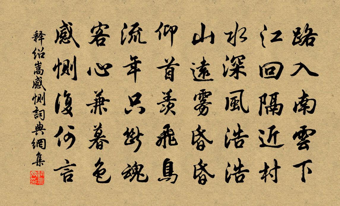詩詞名句歷史字典書法欣賞書法字典國語詞典說文解字康熙字典古漢語字典標 題 作 者 詩 句 感惻作者:釋紹嵩 朝代:宋代感惻原文路入南雲下,江回隔近村。水深風浩浩,山遠霧昏昏。仰首羨飛鳥,流年只斷魂。客心兼暮色,感惻復何言。詩詞問答問:感惻的作者是誰?答:釋紹嵩問:感惻寫於哪個朝代?答:宋代釋紹嵩感惻書法欣賞感惻書法作品詩詞推薦望金陵行闕范成大〔宋代〕新地規模跨六朝,行宮台殿壓金鰲。三山落日青鸞近,雙闕清風紫鳳高。石虎蹲江蹯王氣,玉麟涌地鎮神皋。太平故原戰梅堯臣〔宋代〕落日探兵至,黃塵鈔騎多。邀勛輕赴敵,轉戰背長河。大將中流矢,殘兵空負戈。散亡歸不得,掩抑泣山阿。偈頌二百零五首釋正覺〔宋代〕白雲之賓青山伴,位里借功看互換。無底合盤轉手擎,穿心碗子通身飯。牡丹詩十首宋白〔宋代〕澹黃容止間深檀,妥媠香紅露未乾。和沾似嫌春漸老,向人如說夜來寒。妝成有樣教天媛,禮絕無心下國蘭。針繡月下呈章秀才(八元)劉長卿〔唐代〕自古悲搖落,誰人奈此何。夜蛩偏傍枕,寒鳥數移柯。向老三年謫,當秋百感多。家貧惟好月,空愧子猷過。還族弟卷齊己〔唐代〕豈要私相許,君詩自入神。風騷何句出,瀑布一聯新。□若長如此,名須遠逐身。閒齋舒復卷,留滯忽經旬。送李冠冠善吹中管李建勛〔唐代〕勻如春澗長流水,怨似秋枝欲斷蟬。可惜人間容易聽,清聲不到御樓前。洪休上人少年讀書以多病出家居泐潭為馬祖修蘇轍〔宋代〕早除郎將少年狂,祖塔結緣歸故鄉。習氣未消餘業在,逢人依舊琢詩章。戚氏(此詞始終指意,言周穆王賓於西王母事)蘇軾〔宋代〕 * 山。東皇靈媲統群山。絳闕岧嶢,翠房深迥,倚霏煙。幽閒。志蕭然。金城千里鎖嬋娟。當時穆滿巡狩,翠華洞房燕張祜〔唐代〕清曉洞房開,佳人喜燕來。乍疑釵上動,輕似掌中回。暗語臨窗戶,深窺傍鏡台。新妝正含思,莫拂畫梁埃。贈張嘉甫張耒〔宋代〕浮舟大江里三千,歸握先隴清淮壖。杜門古寺厭岑寂,夢寐清潁如家山。汝陰昔謬稱刺史,自愧何術蘇恫瘝。平生鵲橋仙(鄉守趙丞相生日)劉克莊〔宋代〕去年無麥,今年多稼,儘是君侯心地。向來寺寺總拘樁,今有不拘樁底寺。省倉展日,米場鐫價,萬落千村蒙惠。和平江府倪教授送行項安世〔宋代〕拜辭初下九天來,乞得斑衣學老萊。六月火雲烘去艇,三山風露隔飛埃。多情送我詩盈軸,何意辭君酒一杯。後夜挽高孺人劉克莊〔宋代〕泝源高適譜,作媲鄭虔家。賢子搴丹桂,高才補白華。病猶觀冕輅,沒不待笄珈。阡表堪傳遠,何須挽誄加。觀月藏書樓曹勛〔宋代〕月出西南氣便清,看來看到滿輪明。莫嗔夜夜東樓賞,卻恐中秋未必晴。玉虹洞二首康與之〔宋代〕睡起疏簾一半開,更無人跡過青苔。須臾蒼狗風前變,雷雨驅潮出海來。玲瓏四犯劉之才〔宋代〕幾疊雲山,隔不斷闌乾,天外凝眺。秋與愁並,梧逕雨痕先表。嬌夢半握芙蓉,奈曲曲、翠屏深窈。問愁根,當年棲賢山訪戴叔倫隱處魏良臣〔宋代〕峰列洪都秀,名賢隱此間。亂煙橫古木,啼鳥戀深山。我亦尋詩到,人誰訪戴還。高吟今不見,流水自潺潺。山居午睡起弄花三首楊萬里〔宋代〕浸得荷花水一盆,將來洗面漱牙根。涼生須鬢香生頰,沉麝龍涎卻是村。一翦梅(臘前梅)韓淲〔宋代〕一朵梅花百和香。淺色春風,別樣宮妝。西湖衣缽更難忘。雪意江天,渾斷人腸。清夜橫斜竹影窗。贏得相思,魂名句推薦神閒氣靜,智深勇沉,此八字是幹大事的本領。王永彬《圍爐夜話·第一七六則》 白馬金羈遼海東,羅帷繡被臥春風。李白《春怨》 江山如畫,一時多少豪傑蘇軾《念奴嬌·赤壁懷古》 人誰無過?過而能改,善莫大焉。左丘明《左傳·宣公·宣公二年》 歸來報名主,恢復舊神州。岳飛《送紫岩張先生北伐》 兩水夾明鏡,雙橋落彩虹。李白《秋登宣城謝朓北樓》 君子以思患而豫防之。佚名《易傳·象傳下·既濟》 朱顏空自改,向年年、芳意長新。韓縝《鳳簫吟·鎖離愁》 才道莫傷神,青衫濕一痕。納蘭性德《菩薩蠻·新寒中酒敲窗雨》 秋風別蘇武,寒水送荊軻。庾信《擬詠懷二十七首·其二十六》