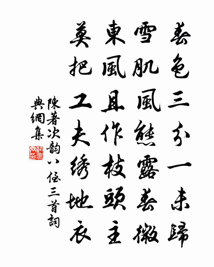 詩詞名句歷史字典書法欣賞書法字典國語詞典說文解字康熙字典古漢語字典標 題 作 者 詩 句 次韻八侄三首作者:陳著 朝代:宋代次韻八侄三首原文春色三分一未歸,雪肌風態露春微。東風且作枝頭主,莫把工夫繡地衣。詩詞問答問:次韻八侄三首的作者是誰?答:陳著問:次韻八侄三首寫於哪個朝代?答:宋代陳著次韻八侄三首書法欣賞次韻八侄三首書法作品詩詞推薦過臨平二首方回〔宋代〕行在名存一夢惺,西湖路近六長亭。陳橋驛與臨平鎮,興廢何人了汗青。頌古三十一首釋安永〔宋代〕臭口未開經萬劫,絲毫才犯鐵輪隨。雨散雲收明月夜,反動江波說向誰。務中晚作張耒〔宋代〕官事一酒瓮,寢齋低竹檐。朝昏睡過半,老病醉相兼。樓晚雙旗裊,城昏疊鼓嚴。隔江吹笛處,空碧帖新蟾。又海眼光贊釋了惠〔宋代〕玉腕指尖新,力能提萬鈞。上他籃子裹,未必是金鱗。賞春強至〔宋代〕到老能逢幾度春,直須飲量強增分。吟情無際共芳草,游思難收如亂雲。還見春風與桃笑,卻教人意嘆芝焚。妖紅偈頌七十八首釋正覺〔宋代〕麟龍不為瑞,珠璧不為貴。衲僧眼豁開,徹見生死蔕。生死蔕,第一義。諸佛心,祖師鼻。少林傳燈,靈山授記。金丹詩四十八首張繼先〔宋代〕鼎中大藥世難知,日月雙投姤不迷。未秘妙光方火棗,始思玄理號交梨。溶溶朱粉飛雲遠,湛湛神輝滿室齊。一紀述夢寄趙紫芝徐璣〔宋代〕江水何滔滔,渡江相別離。揖子客舍前,對子衣披披。問子何所為,旅客未得歸。執手一悲喚,驚覺妻與兒。起坐長思仙譚處端〔元代〕朝思仙。暮思仙。思憶真師四五年。惟愁功未圓。功須圓。行須圓。功行雙全作大仙。攜雲歸洞天。偈頌二百零五首釋正覺〔宋代〕生滅去來,本如來藏。清淨妙明,虛融通暢。六門我絕,攀緣三界。渠無身相,無生路上。底人識取,萬迥和尚。和陶淵明飲酒詩滕岑〔宋代〕拿舟漾明月,把酒對青山。月影涵山扉,妙處端難言。回觴勸鷗鷺,吾與爾忘年。適意只自知,詎可他人傳。九日拜大兄墳汪晫〔宋代〕攜家松底酹蝦蟆,椒荔豚肩薦菊芽。吾父洲中無橘樹,與兄庭下有荊花。和羹莫遂箋邊讓,破帽無能落孟嘉。衰老傚東坡從歐陽公詠雪體不用鹽玉鶴鷺絮蝶飛舞袁說友〔宋代〕樓頭一夜寒聲促,但怪重衾慣藏六。小窗起聽枯葉鳴,更覺凝寒透肌粟。乃知龍公修故事,幻作輕細巧翻覆。摶空題李磐庵西潛圖釋寶曇〔宋代〕何人意行山水重,草木驚笑來天風。茅檐雞飛犬升屋,屐聲疾奏鄰家翁。逢迎初非乃翁事,盆盎淨潔求無同。一犁西湖曲朱敦儒〔宋代〕今冬寒早風光好。休怪攙先欹絮帽。蟹肥一個可稱斤,酒美三杯真合道。年年閒夢垂垂了。且喜風松吹不倒。平分上陽宮王建〔唐代〕上陽花木不曾秋,洛水穿宮處處流。畫閣紅樓宮女笑,玉簫金管路人愁。幔城入澗橙花發,玉輦登山桂葉稠。曾讀平甫如通州寄之王安石〔宋代〕北山搖落水崢嶸,想見揚帆出廣陵。平世自無憂國事,求田應不忤陳登。除夕古體三十韻趙蕃〔宋代〕疾風鏖夜灘,古木撼石壁。漁火暗復張,隔江哭聲接。哀哀或到明,語細雜鳴唈。我舟若孤鳧,欲去意轉縶。終宵讀江總傳鄭文寶〔宋代〕行人慵過景陽宮,宮畔離離禾黍風。庭玉有花空怨白,井蓮無步莫愁紅。吟詩功業才雖大,亡國君臣道最同。爭忍賦得慎罰虞世南〔唐代〕帝圖光往冊,上德表鴻名。道冠二儀始,風高三代英。樂和知化洽,訟息表刑清。罰輕猶在念,勿喜尚留情。明慎名句推薦木蘭舟上珠簾卷,歌聲遠,椰子酒傾鸚鵡盞。李珣《南鄉子·山果熟》 天與秋光,轉轉情傷,探金英知近重陽。李清照《行香子·天與秋光》 賭勝馬蹄下,由來輕七尺。李頎《古意》 背燈和月就花陰,已是十年蹤跡十年心。納蘭性德《虞美人·銀床淅瀝青梧老》 人生在世不稱意,明朝散發弄扁舟。李白《宣州謝朓樓餞別校書叔雲》 務本節用財無極。荀子《荀子·成相》 天時、地利、人和,三者不得,雖勝有殃。孫臏《孫臏兵法·月戰》 布衣之怒,亦免冠徒跣,以頭搶地爾。劉向《戰國策·魏四·秦王使人謂安陵君》 公生明,偏生暗荀子《荀子·不苟》 霜殞蘆花淚濕衣,白頭無復倚柴扉。與恭《思母》