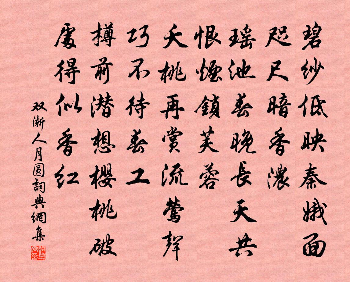 詩詞名句歷史字典書法欣賞書法字典國語詞典說文解字康熙字典古漢語字典標 題 作 者 詩 句 人月圓作者:雙漸 朝代:宋代人月圓原文碧紗低映秦娥面,咫尺暗香濃。瑤池春晚,長天共恨,煙鎖芙蓉。夭桃再賞,流鶯聲巧,不待春工。樽前潛想,櫻桃破1*1處,得似香紅。詩詞問答問:人月圓的作者是誰?答:雙漸問:人月圓寫於哪個朝代?答:宋代問:人月圓是什麼體裁?答:詞雙漸人月圓書法欣賞人月圓書法作品詩詞推薦卜運算元(景泰山次韻東坡三首)葛長庚〔宋代〕雲散雨初晴,蟬噪林逾靜。古寺敲鐘暮掩門,燈映琉璃影。浩氣鎮長存,昨夢還重省。獨倚闌乾嘯一聲,毛髮蕭蕭沁園春 壽節秋谷平章十一月朔程文海〔元代〕河漢無雲,淡月疏星,玉宇初澄。漸金仙掌上,露華高潔,西風陣里,霜氣崚嶒。浪蕊浮花,狂茨怪蔓,此日紛紛韓持國從富并州辟王安石〔宋代〕韓侯冰玉人,不可塵土雜。官雖眾俊後,名字久訇磕。并州天下望,撫士威愛愜。千金棄不惜,賓客常滿合。遙聞東園黃庭堅〔宋代〕岑寂東園可散愁,膠膠擾擾夢神州。萬竿苦竹旌旗卷,一部鳴蛙鼓吹收。雨後月前天欲冷,身閒心遠地偏幽。杜門贈蘇宣甫強至〔宋代〕謫宦多因眾口讒,猶君戰衄困羈銜。鷹拿群雀翻遭網,舟駕長風忽斷帆。曾擁貔貅交 * ,肯同兒女泣青衫。有才幽居漫成周弼〔宋代〕便入空山住,休慵漢省書。薄雲翻藥畚,斜日送柴車,遠業松花膩,生涯薤葉疏。抱琴誰共聽,一尾石間魚。黃致政輓詩二首王炎〔宋代〕祿養更迎侍,消搖介壽康。壯圖雖偃屈,潛德竟輝光。可惜今埋玉,無由自奠觴。他年觀上冢,千騎擁龍岡。挽吏部石似之虞儔〔宋代〕期公簪橐侍甘泉,底是上天不假年。才大難為當世用,文高猶有後人傳。魂銷閩檄千山路,淚挽銀河七月天。會葬病酒吟邵雍〔宋代〕年年當此際,酒病掩柴扉。早是人多感,那堪春又歸。花殘蝴蝶亂,晝永子規啼。安得如前日,和風初扇微。重陽吟五首方回〔宋代〕此身生死國興亡,搖落年年本是常。無奈潘郎解悽怨,滿城風雨近重陽。送了禪人釋慧遠〔宋代〕未明定觀三千界,且看江西十八灘。照出芙蓉城下月,金波影裹麥秋寒。壽陽僧房見橘詩陳舜俞〔宋代〕地過長淮種橘難,僧房今見鎖朱欄。秋來賴有黃金實,幾被行人作枳看。避地毗陵上王慥使君(時黃賊陷東陽公避地於浙右)貫休〔唐代〕至理至昭昭,心通即不遙。聖威無遠近,吾道太孤標。辛苦蘇氓俗,端貞答盛朝。氣高吞海岳,貧甚似漁樵。庾亮梁教授次柘枝詩韻再和陳造〔宋代〕洞裡鶯花別有天,為渠蘸甲上金船。舞姝貪看塵生襪,飲興渾忘雪滿顛。弄影競垂三昧手,倚風疑裊五枝蓮。廣寒天台福聖觀張無夢〔宋代〕天台瀑布落青天,觀在天台瀑布邊。道士只今燒藥處,仙翁曾是種芝田。龍居古洞遺殘雨,鶴出高巢點破煙。暫別又即事四首劉克莊〔宋代〕鷹已離韛馬釋驂,弇州西畔大槐南。酢梅難比奉宸杏,病橘本非供御柑。怕向道旁逢醉尉,底須帳里著髯參。細聽千手眼大悲偈宗澤〔宋代〕千手一手用,千眼一眼觀。用觀無差殊,何必許多般。龍游石壁釋本粹〔宋代〕巉岩古徑幽,疏林閣秋雨。小立蘚花寒,江清魚可數。全州劉克莊〔宋代〕寂寞全州路,家家荻竹扉。異僧留塔在,過客入城稀。傳舍臨清泚,官亭占翠微。沙頭泊船者,多自嶺南歸。頌古三十六首釋惟一〔宋代〕發機外機,遣句中句。明眼衲僧,不知落處。名句推薦光景不勝閨閣恨,行行坐坐黛眉攢。閻選《八拍蠻·雲鎖嫩黃煙柳細》 今人嗤點流傳賦,不覺前賢畏後生。杜甫《戲為六絕句》 步轉迴廊,半落梅花婉娩香。蘇軾《減字木蘭花·春月》 謹身節用,以養父母孔子及其弟子《孝經·庶人》 俯瞰黃河小,高懸白雪清。胡秉正《詠賀蘭山》 寧為蘭摧玉折,不作蕭敷艾榮。劉義慶《世說新語·言語》 百囀無人能解,因風飛過薔薇。黃庭堅《清平樂·春歸何處》 狎興生疏,酒徒蕭索,不似少年時。柳永《少年游·長安古道馬遲遲》 盛而不驕,勞而不矜其功。左丘明《國語·越語·范蠡進諫勾踐持盈定傾節事》 遠路應悲春晼晚,殘霄猶得夢依稀。李商隱《春雨》