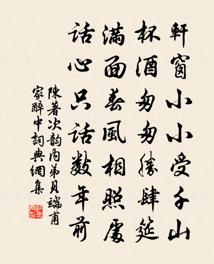 詩詞名句歷史字典書法欣賞書法字典國語詞典說文解字康熙字典古漢語字典標 題 作 者 詩 句 次韻內弟貝端甫家醉中作者:陳著 朝代:宋代次韻內弟貝端甫家醉中原文軒窗小小受千山,杯酒匆匆勝肆筵。滿面春風相照處,話心只話數年前。詩詞問答問:次韻內弟貝端甫家醉中的作者是誰?答:陳著問:次韻內弟貝端甫家醉中寫於哪個朝代?答:宋代陳著次韻內弟貝端甫家醉中書法欣賞次韻內弟貝端甫家醉中書法作品詩詞推薦煉丹井董嗣杲〔宋代〕稚川曾此倒靈瓢,闌上銀床壓甃腰。丹氣騰空知幾轉,神光射屋起中宵。有茶可品春煎細,何疾能治曉汲遙。萬古望鍾山王安石〔宋代〕佇立望鍾山,陽春更蕭瑟。暮尋北郭歸,故繞東岡出。秋夕詩鮑照〔南北朝〕慮涕擁心用。夜默發思機。幽閨溢涼吹。閒庭滿清暉。紫蘭花已歇。青梧葉方稀。江上淒海戾。漢曲驚朔霏。發斑晉門再吟周曇〔唐代〕貪泉何處是泉源,只在靈台一點間。必也心源元自有,此泉何必在江山。鷹爪花王侃〔宋代〕宿蔓盤根悉剪夷,只留庭下雪霜枝。史君第一憎貪攫,豈是蒼鷹露爪時。白牡丹王鎡〔宋代〕翠雲低護玉樓台,露洗香苞逐漸開。昨夜賞花人酒醉,月中錯認水晶杯。送沈保叔國諭試藝右庠蒲壽宬〔宋代〕讀書讀心不讀跡,以言易言竟何益。射弓射志不射箭,以力假力何足羨。因蹄得兔蹄安用,以虎視石虎則中。設科酬王伯虎王安石〔宋代〕吾聞人之初,好惡尚無朕。帝與鑿耳目,賢愚遂殊品。爾來百千年,轉化薄愈甚。父翁相販賣,浮詐誰能審。睢盱寄朱錫珪賈島〔唐代〕遠泊與誰同,來從古木中。長江人釣月,曠野火燒風。夢澤吞楚大,閩山厄海叢。此時檣底水,濤起屈原通。張冠卿以前詩懷哉各努力人物古來少句為十詩陳傅良〔宋代〕秦人弊申韓,亡梁以崇佛。六經獨何罪,莽亦竊大物。堪嗟二百年,吾道功第一。熙豐餘論在,河洛諸賢沒。再用前韻李彌遜〔宋代〕長檠當晝知無用,團扇經秋嘆已陳。我獨不才端有似,五年澤國又逢春。霅城重會修蘋州釋文珦〔宋代〕江湖身不定,十載別年兄。忽爾重逢面,翻疑是隔生。濕雲行有路,細雨落無聲。惆悵還分手,扁舟出郡城。宮詞宋白〔宋代〕後苑秋晴校獵歸,淡妝宮女盡戎衣。數中供奉誰精熟,斜勒驕聰掠草飛。隆興甲申歲閏月游焦山韓元吉〔宋代〕荒村日晴雪猶積,系纜焦公山下石。江翻斷崖石破碎,瘞鶴千年有遺蹟。瘦藤百級躋上方,浮玉南北法中央。檣午述夢寄趙紫芝徐璣〔宋代〕江水何滔滔,渡江相別離。揖子客舍前,對子衣披披。問子何所為,旅客未得歸。執手一悲喚,驚覺妻與兒。起坐點絳唇 梅劉秉忠〔元代〕策杖尋芳,小溪深雪前村路。暗香時度。更在清幽處。一見冰容,便有西湖趣。題新句。句成梅許。折得南枝去。早梅二首何澹〔宋代〕姑射仙肌不受塵,舊妝重傅恰如新。東君少試回天手,已占人間幾許春。祗役駱口,因與王質夫同游秋山,偶題三韻白居易〔唐代〕石擁百泉合,雲破千峰開。平生煙霞侶,此地重徘徊。今日勤王意,一半為山來。思越人張泌〔唐代〕燕雙飛,鶯百轉,越波堤下長橋。斗鈿花筐金匣恰,舞衣羅薄纖腰。東風澹蕩慵無力,黛眉愁聚春碧。滿地落花無漢宮春·會稽蓬萊閣懷古辛棄疾〔宋代〕秦望山頭,看亂雲急雨,倒立江湖。不如雲者為雨,雨者云乎。長空萬里,被西風、變滅須臾。回首聽,月明天籟名句推薦橋成漢渚星波外,人在鸞歌鳳舞前。晏幾道《鷓鴣天·當日佳期鵲誤傳》 擊鼓其鏜,踴躍用兵。佚名《擊鼓》 報導先生歸也,杏花春雨江南。虞集《風入松·寄柯敬仲》 當關不報侵晨客,新得佳人字莫愁。李商隱《富平少侯》 但恨處非位,愴悢使心傷。阮籍《詠懷八十二首·其七十九》 城頭一片西山月,多少征人馬上看。李攀龍《塞上曲送元美》 文人之筆,勸善懲惡也。王充《論衡·卷二十·佚文篇》 樹木何蕭瑟,北風聲正悲。曹操《苦寒行》 今夜送歸燈火冷,河塘,墮淚羊公卻姓楊。蘇軾《南鄉子·和楊元素時移守密州》 身勞而心安,為之;利少而義多,為之荀子《荀子·修身》