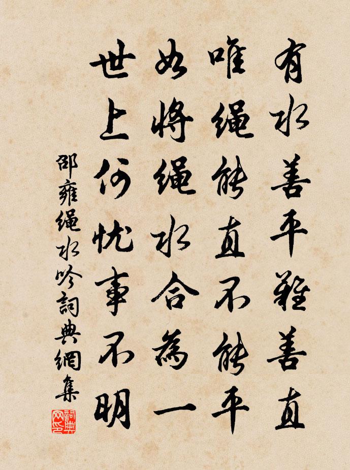 詩詞名句歷史字典書法欣賞書法字典國語詞典說文解字康熙字典古漢語字典標 題 作 者 詩 句 繩水吟作者:邵雍 朝代:宋代繩水吟原文有水善平難善直,唯繩能直不能平。如將繩水合為一,世上何憂事不明。詩詞問答問:繩水吟的作者是誰?答:邵雍問:繩水吟寫於哪個朝代?答:宋代邵雍繩水吟書法欣賞繩水吟書法作品詩詞推薦句葉適〔宋代〕花傳春色枝枝到,雨遞秋聲點點分。送從弟戴玄往蘇州張籍〔唐代〕楊柳閶門路,悠悠水岸斜。乘舟向山寺,著屐到漁家。夜月紅柑樹,秋風白藕花。江天詩景好,回日莫令賒。和周子充侍郎見寄樂府戲贈之作范成大〔宋代〕釣海風水急,登樓塵霧高。不如岸綸巾,春船攜小橋。芳草含奇薰,光景上東壁。桂林那辦此,辦作安昌客。玉照堂觀梅二十首張鎡〔宋代〕縱橫遙襯碧雲端,林下鋪氈坐臥看。不但歸家因桂好,為梅亦合早休官。廬山瀑布范仲淹〔宋代〕靈源何太高,北斗想可挹。凌日五光直,逗雲千仞急。白虹下澗飲,寒劍倚天立。闊電不得瞬,長雷無敢蟄。萬丈聶侍郎領客觀園林之勝飲中出示名賢書畫戴復古〔宋代〕烈士家風從橐尊,時容野客上朱門。如登東觀圖書府,又似西岩水竹村。自以一閒銷日月,誰知萬慮滿乾坤。諸公王漕小燕玻璃分韻得路字陳造〔宋代〕去年客京華,酷暑不可度。時為冷泉登,稅駕脫巾屨。風外雜佩鳴,松根一竇注。可聞不可挹,已足盪袢暑。朅來清湘驛送王柳州南歸二絕范成大〔宋代〕我已兼程無腳力,君猶追路有襟期。從今月下共花下,誰復醉吟先和詩?題城南書院三十四詠張栻〔宋代〕野艇新成尋丈許,柳堤詳觀總不偏。飛絮滿空春不盡,新荷帖水已田田。柳梢青(適和軒)佚名〔宋代〕一望清溪。兩堤翠蔭,半紙新詩。涼滿衣裳,香生筆硯,風動窗扉。月明撐過船兒。載龍玉、雙娥對吹。竹外山亭皇雅十首《庶工》三章尹洙〔宋代〕帝咨庶工,疇其輔予。俊乂以登,厥勞乃圖。匪忘舊勛,非賢勿俞。巍巍袞台,盛德以居。秋風張鎡〔宋代〕策策驚飈戰素秋,夢回衾幔亦颼飀。不傳鴻雁秦關信,可柰蘋蘅楚客愁。作賦未須悲落木,掛帆方喜助歸舟。保須李修伯山居真山民〔宋代〕俗子自不到,幽扉何必扃。苔衣和月臥,山雨雜泉聽。有發徒斑白,無名入汗青。未應閒此事,尚可掃玄經。醴陵道中趙汝鐩〔宋代〕入得湖南界,皆嫌堠子長。煙岩松葉暗,風陌稻花香。橋斷人迂路,車鳴水卷塘。宿程雖不遠,木杪已斜陽。二風詩治風詩五篇至正元結〔唐代〕為君之道,何以為明?功不濫賞,罪不濫刑;讜言則聽,諂言不聽;王至是然,可為明焉。訪丹霞鄧肅〔宋代〕煙雲著天無寸空,寒窗瑟瑟夜號風。浩歌出門何所詣,故人飛錫梵王宮。扣門兀坐寂無語,衲破蒙頭面如土。逢場秋思陸游〔宋代〕疏泉洗石夸身健,試墨燒香破日長。若得三山安樂法,不須更覓玉函方。三疊仇遠〔宋代〕飽吃芹宮飯,饑寒未迫身。公侯方重老,妻子莫憂仇。蹤跡新豐客,心期畫邑人。皇荂歌一曲,聊以和陽春。歸自城中承介卿寵顧惠詩次韻蔡沈〔宋代〕幽雅從君志,驅馳愧我人。無忘歲時舊,因得笑言親。心賞知非故,詩成語自新。一川風景會,樽酒且頻頻。思古堂陳世卿〔宋代〕思古堂前酒一樽,共談時事出孤村。 臨期上馬無他囑,多買詩書教子孫。名句推薦雨過橫塘水滿堤,亂山高下路東西。曾鞏《城南·雨過橫塘水滿堤》 佳節清明桃李笑,野田荒冢只生愁。黃庭堅《清明》 東風隨春歸,發我枝上花。李白《落日憶山中》 樸實渾厚,初無甚奇,然培子孫之元氣者,必此人也。王永彬《圍爐夜話·第十九則》 到頭來,依舊是風塵骯髒違心愿。曹雪芹《紅樓夢·第五回》 後庭花一曲,幽怨不堪聽。劉禹錫《金陵懷古》 春宵苦短日高起,從此君王不早朝。白居易《長恨歌》 言不中,行不謹,辱也。王通《中說·卷一·王道篇》 一壺酒,一竿身,快活如儂有幾人。李煜《漁父·浪花有意千里雪》 酒亂性,色迷人。施耐庵《水滸傳·第四十五回》