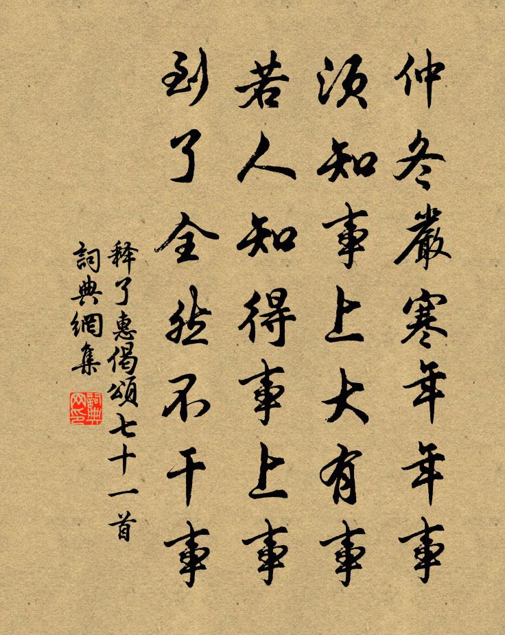 詩詞名句歷史字典書法欣賞書法字典國語詞典說文解字康熙字典古漢語字典標 題 作 者 詩 句 偈頌七十一首作者:釋了惠 朝代:宋代偈頌七十一首原文仲冬嚴寒年年事,須知事上大有事。若人知得事上事,到了全然不幹事。詩詞問答問:偈頌七十一首的作者是誰?答:釋了惠問:偈頌七十一首寫於哪個朝代?答:宋代釋了惠偈頌七十一首書法欣賞偈頌七十一首書法作品詩詞推薦徒弟普山請贊釋慧開〔宋代〕頭髮篷松,耳輪卓朔。踞坐當軒,權衡在握。任你德山臨濟棒喝交馳,到他面前一點用不著。張說徐鈞〔宋代〕東宮侍讀讀何經,相位當知要竭誠。諛說卻陳封禪頌,非心未格侈心生。再拜閬風帥乾寶謨郎中朱繼芳〔宋代〕家世蜀青城,摶扶幾萬程。神遊應八表,骨煉已三生。舉酒呼麟脯,吹笙答鳳鳴。欲將余馬紲,蜷局不堪行。臨江仙山主〔元代〕四願弘深垂教綱,心懷喜舍慈悲。愛河苦海度群迷。水離生滅,彼岸訂菩提。值難逢應稱聖號,他心慧眼痴知。焚進船泛洛水應制(一作薛昚惑詩)孫逖〔唐代〕禁園紆睿覽,仙棹葉時游。洛北風花樹,江南彩畫舟。芳生蘭蕙草,春入鳳凰樓。興盡離宮暮,煙光起夕流。神秀樓落成趙汝愚〔宋代〕魯侯作南門,春秋書不時。嗟予春暮來,復遣秋暮歸。岩岩龍固山,迢迢括蒼溪。孤城煨燼餘,棟宇煙塵飛。悠悠晚次崞縣朱彝尊〔清代〕百戰樓煩地,三春尚朔風。雪飛寒食後,城閉夕陽中。行役身將老,艱難歲不同。流移嗟雁戶,生計各西東。鼓腹無所思朝起暮歸眠湫明詩也以詩定韻為十滕岑〔宋代〕我讀淵明詩,或至忘食眠。人物葛天民,度越羲黃前。胸中抱真淳,筆下雜言詮。妄譏閒情賦,詎識其超然。望月懷遠 / 望月懷古張九齡〔唐代〕海上生明月,天涯共此時。情人怨遙夜,竟夕起相思。滅燭憐光滿,披衣覺露滋。不堪盈手贈,還寢夢佳期。送人出使吳芾〔宋代〕天心軫念國西陲,妙選廷臣下赤墀。要布寬仁慰雕瘵,用資根本濟艱危。九重眷遇風雲會,萬里威名草木知。此去洞溪絕句三首韓元吉〔宋代〕杏花無數連村落,也有人家掛酒旗。春色撩人只供醉,卻怕風吹易醒時。偈頌二百零五首釋正覺〔宋代〕作麽生行,履得十成,去功業力爭英雄。劉項時,將太平。坐亨朴懋,羲軒世人。游洞霄米仲昌〔宋代〕公餘陪侍九鎖行,花已凋殘鶯已老。舞蛟亭下泉如奔,伏虎岩前景尤好。四圍翠巘悉可躋,一點紅塵渾不到。坐中宣妙樓方鴻飛〔宋代〕雲觀煙樓是梵家,竹圍如洗逼寒沙。因風綠浪搖晴麥,遇雨紅香落潤花。人鎖晝房聽鳥語,僧歸晚塢放蜂衙。不須贈別徐永叔趙蕃〔宋代〕憶曾看竹過焦山,重記同舟駭浪間。邂逅真成肺肝熱,別離空益鬢毛斑。芻青飯白吾能設,車殆馬煩君莫還。此去春雨後孟郊〔唐代〕昨夜一霎雨,天意蘇群物。何物最先知,虛庭草爭出。朝陽岩趙不息〔宋代〕朝陽山水佳,毫端意無極。發潛十七奇,幻出不盈尺。因續漫浪銘,更寫浯溪宅。俱作畫圖看,靜對天齊石。和堯夫安樂窩中好打乖吟任逵〔宋代〕安樂先生醉便歌,莊篇徒爾說焚和。有名有守同應少,無事無求得最多。勝處林泉供放適,清時風月助吟喔。能拋科舉王柏〔宋代〕紛紛衿佩止時文,競巧趨新做日程。一試賓士天下士,三年冷暖世間情。清朝不許人心壞,舉子安知天爵榮。所用即事吟邵雍〔宋代〕事到患來頻,何由得任真。就新須果敢,從善莫因循。盜亦自有道,人而或不仁。義緣無定體,安處是行身。名句推薦夜深風竹敲秋韻,萬葉千聲皆是恨。歐陽修《玉樓春·別後不知君遠近》 燕支長寒雪作花,蛾眉憔悴沒胡沙。李白《王昭君二首》 食必常飽,然後求美;衣必常暖,然後求麗劉向《說苑·反質》 城雪初消薺菜生,角門深巷少人行。楊載《到京師》 紫黯紅愁無緒,日暮春歸甚處?龔自珍《如夢令·紫黯紅愁無緒》 回首天涯歸夢,幾魂飛西浦,淚灑東州。周密《一萼紅·登蓬萊閣有感》 將在外,君命有所不受畢沅《續資治通鑑·元紀·元紀三十》 曲屏先暖鴛衾慣,夜寒深、都是思量。吳文英《風入松·為友人放琴客賦》 愛多者則法不立,威寡者則下侵上。韓非及後人《韓非子·內儲說上七術》 惡之者眾則危。荀子《荀子·正論》