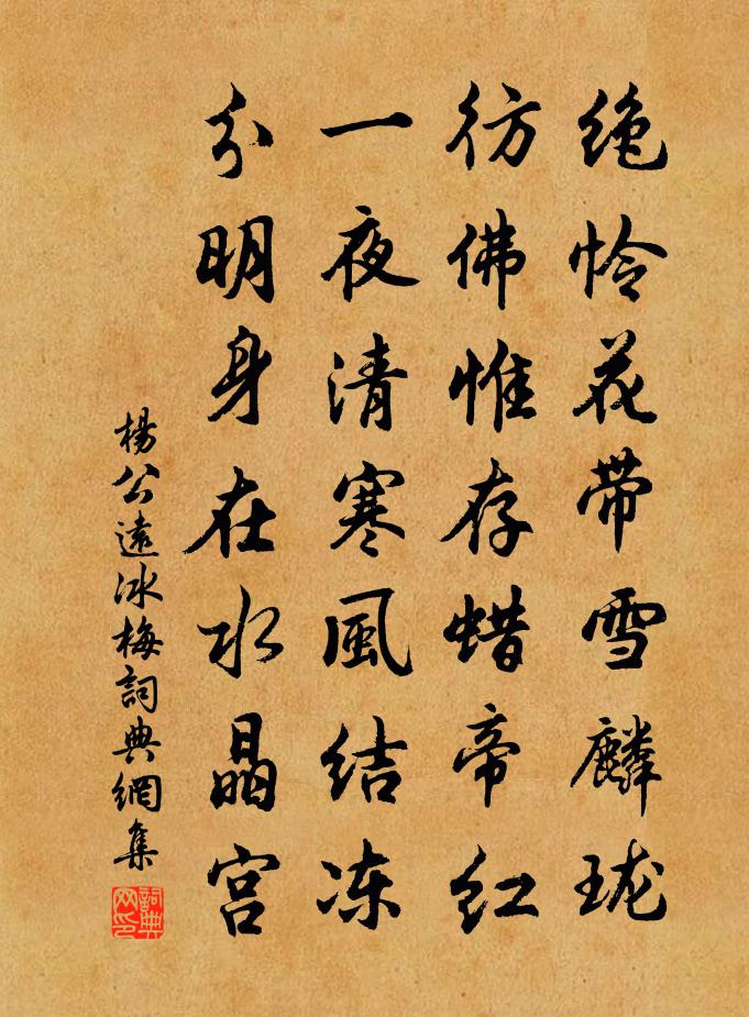 詩詞名句歷史字典書法欣賞書法字典國語詞典說文解字康熙字典古漢語字典標 題 作 者 詩 句 冰梅作者:楊公遠 朝代:宋代冰梅原文絕憐花帶雪麟瓏,彷佛惟存蠟帝紅。一夜清寒風結凍,分明身在水晶宮。詩詞問答問:冰梅的作者是誰?答:楊公遠問:冰梅寫於哪個朝代?答:宋代楊公遠冰梅書法欣賞冰梅書法作品詩詞推薦贈趙步師陳造〔宋代〕出處升沉轉首非,無端顛倒念分違。瘦羊博士尚骨立,白馬將軍今肉飛。共仰鉤陳明帝極,少須尺箠下金微。為公印秀才至舒州見尋,別後寄詩依韻和徐鉉〔唐代〕羈游白社身雖屈,高步辭場道不卑。投分共為知我者,相尋多愧謫居時。離懷耿耿年來夢,厚意勤勤別後詩。今日寄喬侍郎賈島〔唐代〕大寧猶未到,曾渡北浮橋。曉出爬船寺,手擎紫栗條。差池不相見,悵望至今朝。近日營家計,繩懸一小瓢。宮詞張公庠〔宋代〕後苑宸游炎日長,宮中疆半坐迴廊。鵁鶄鸂鶒銀塘靜,楊柳梧桐水殿香。莊泉伯檢察為先安撫請升堂偈釋宗杲〔宋代〕近來學佛人,少見不顛倒。唯務資談柄,棄大而就小。昧卻直截事,外邊打這繞。畢竟那一著,何曾得分曉。得有湖亭別友釋文珦〔宋代〕與君俱是客,重別意如何。斜日孤帆去,寒江風浪多。遠懷隨雁影,新詠雜漁歌。知此遨遊地,何時復共過。古金城謠周霆震〔元代〕崑崙烈風撼坤軸,日車斂轡鹹池浴。六龍飲渴呼不聞,赤蟻玄蜂厭人肉。荊襄弗支廬壽孤,江東掃地如摧枯。忠臣即事孫應時〔宋代〕凝雲淡淡山蒼蒼,在影下照生湖光。漁舟散入綠苹去,劃破琉璃三四行。庚申度夏自適姜特立〔宋代〕透脫逍遙遊外,遠離煩惱濁中。夜夜滿懷明月,時時入夢清風。禪人寫師真請贊釋慧遠〔宋代〕早依圜悟,晚住林泉。無門雪屈,遍界聲冤。對天子廓摩醯首羅眼,提楊岐金圈栗棘蓬禪。神仙秘訣,父子不傳。浣溪沙蔡伸〔宋代〕且斗尊前見在身。昔游如夢可銷魂。玉容依約舊精神。千里重來人事改,一杯相屬意還新。韶華不減洞中春。過三塔崔敦禮〔宋代〕妙墨人間寶,千金紙上鷖。頻來湖上寺,三復柱間題。鶴化辭遼海,鴻飛印雪泥。人豪今不見,凝佇夕陽西。寄喬益公岳珂〔宋代〕峨峨傑閣凌西清,高排雲漢垂日星。千年福地開殊庭,絳節中一朝百靈。屬車小儒風埃底,歲一周星陪豹尾。有眼【南呂】金字經_春懷瘦影孤張可久〔元代〕春懷瘦影孤鸞鑑,怨聲阿鵲鹽,病起離人愁轉添。嫌,燕歸雙入簾。朱門掩,夜香不喜拈。梅邊雪冷松邊路,月寒謁金門蔡伸〔宋代〕相思切。觸目只供愁絕。好夢驚回清漏咽。燭殘香穗結。長恨南樓明月。只解照人離缺。同倚朱欄飛大白。今宵風頌古三十三首釋師觀〔宋代〕分明與麽無無無,釋迦彌勒是他奴。茫茫宇宙人無數,幾個男兒是丈夫。閒遊陸游〔宋代〕剡縣有佳處,吾行無定期。橫塘供晚釣,孤店具晨炊。約客同看竹,留僧與對棋。人生得自在,更老未為遲。沈憲敏公輓詞樓鑰〔宋代〕天使魁鄉薦,上令卿改官。蚤峩烏府豸,終著侍臣冠。掛節威行惠,專城猛濟寬。紹熙多舊學,胡不相宮端。和施彥執懷姚進道葉先覺韻張九成〔宋代〕西湖十里山,春風一杯酒。茲興良不淺,何日落吾手。我讀君和詩,襟期一何厚。同生上下宇,共閱古今宇。死生海上道人傳以神守氣訣蘇軾〔宋代〕但向起時作,還於作處收。蛟龍莫放睡,雷雨直須休。要會無窮火,嘗觀未盡油。夜深人散後,惟有一燈留。名句推薦遷客此時徒極目,長洲孤月向誰明。李白《鸚鵡洲》 若到江南趕上春,千萬和春住。王觀《卜運算元·送鮑浩然之浙東》 夫妻反目,不能正室也。佚名《易傳·象傳上·小畜》 萬樹寒無色,南枝獨有花。道源《早梅》 豪華盡成春夢,留下古今愁。康與之《訴衷情令·長安懷古》 黃蘆岸白蘋渡口,綠柳堤紅蓼灘頭白樸《沉醉東風·漁夫》 春日宴,綠酒一杯歌一遍。馮延巳《長命女·春日宴》 貴名不可以比周爭也,不可以誇誕有也,不可以勢重脅也荀子《荀子·儒效》 憑高遠望,見家鄉、只在白雲深處。王瀾《念奴嬌·避地溢江書於新亭》 怨別自驚千里外,論交卻憶十年時。高適《東平別前衛縣李寀少府 / 送前衛縣李宷少府》