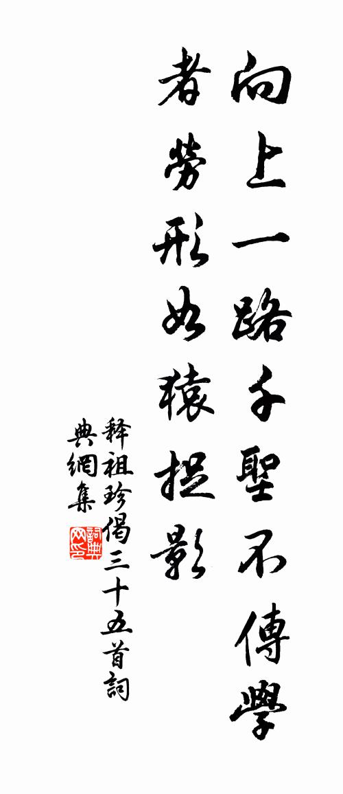詩詞名句歷史字典書法欣賞書法字典國語詞典說文解字康熙字典古漢語字典標 題 作 者 詩 句 偈三十五首作者:釋祖珍 朝代:宋代偈三十五首原文向上一路,千聖不傳。學者勞形,如猿捉影。詩詞問答問:偈三十五首的作者是誰?答:釋祖珍問:偈三十五首寫於哪個朝代?答:宋代釋祖珍偈三十五首書法欣賞偈三十五首書法作品詩詞推薦喜客泉次韻馮去非〔宋代〕白雲在空山,丹光照崖水。仙人跡如埽,客至泉輒喜。世路多不平,箇中太清生。政以靜自怡,亦與凡將迎。風波偶思桓景登高故事宋祁〔宋代〕桓景全家遂得仙,佩萸吹菊對陶然。汝南雞犬緣何事,不似淮王許上天。吳齊之二首趙蕃〔宋代〕夜聞袁宏誦詩聲,空山寂寞魚龍驚。丈夫有才不貧賤,倦遊何乃困長卿。平生讀書得力處,公卿褐夫安重輕。鴻秸阮郎歸蔡伸〔宋代〕煙籠寒水暝禽棲。滿庭紅葉飛。蘭堂寂寂畫簾垂。霜濃更漏遲。鴛被冷,麝香微。強敧單枕時。西窗看盡月痕移。沁園春馮取洽〔宋代〕問訊帶柳溪,溪帶上柳容,帶胡為帶埃。帶嘆陽春陡變,孰為披拂,賞音難遇,誰與徘徊。好在湖山,吾容不辱,念奴嬌陳三聘〔宋代〕浮雲吹盡,卷長空、千頃都凝寒碧。兔杵無聲風露冷,天也應憐人寂。故遣姮娥,駕蟾飛上,玉宇元同色。天津何山中方岳〔宋代〕草草庵居絕似僧,不同劣有發鬅鬙。空山一夜雷驅雨,老屋四圍雲擁燈。詩骨瘦來人似鶴,書幐懶去字如蠅。開門三星行韓愈〔唐代〕我生之辰,月宿南斗。牛奮其角,箕張其口。牛不見服箱,斗不挹酒漿。箕獨有神靈,無時停簸揚。無善名已聞,出山相贊釋祖欽〔宋代〕六年飢餓,半夜痴狂。貧兒拾得錫,赤腳走忙忙。次韻奉答南山禪師二頌兼呈琦上人黃庭堅〔宋代〕魚吼鐘鳴索飯錢,牧牛耕種別人田。淮師收得祖關在,一笛操江月滿船。題韓季默春山圖葛紹體〔宋代〕春山一簇帶春雲,樓閣高低日欲曛。騎馬棹船遊冶客,一天風月自平分。豆葉黃/憶王孫呂渭老〔宋代〕玉蕭風外一聲清。粉面嬋娟月對明。紫府樓台夜不扃。羽衣輕。穩駕雙鸞謁帝庭。某忝被給札之召伏蒙景純學士文丈寵示嘉篇且蘇頌〔宋代〕先友勤渠慶得時,相逢仍在右垣扉。負山徒荷君恩重,起草多慚筆力微。早歲應門叨賞識,幾年聯襼接音徽。雕章獻臣學士與余通書因成感詠宋庠〔宋代〕夫君班揚儔,抱槧群玉府。久讀未見書,躬抽擊年譜。墜緒獲先秦,亡篇出東魯。上泝三皇墳,旁探百家語。怪牒肩輿至石堰村陸游〔宋代〕偶上籃輿踏夕陽,醉魂困思兩倀倀。澗薪旋拾供茶灶,詩稿初成寄藥囊。村舍蓺麻驅鳥雀,牧童隨草放牛羊。歸來讀杜詩史彌寧〔宋代〕滿地干戈老厭逢,酒杯詩卷吒孤忠。自人風雅離騷後,數到而今無此翁。賀新郎(賀李廉泉螟兄月岩子為子)伍梅城〔宋代〕夢到天宮裡。見長庚星顆,忽自月邊飛至。直奏玉皇金闕道,臣已五年於此。今亦欲、過宮一次。福祿壽星齊讚嘆鷓鴣天 祝婦人壽元好問〔金代〕五福仙娥月殿來。依然微步彩雲堆。一從別□瑤池宴,不見蟠桃幾度開。歌宛轉,舞徘徊。碧梧秋意滿池台。年年和前韻見寄 其二朱淑真〔宋代〕憶昔江頭別,相看對古津。去來分櫓棹,南北隔音塵。把酒何時共,論文幾日親。歸寧如有約,彩服共爭新。送陳華文出守當塗同僚餞別分韻得立字王炎〔宋代〕今代陳仲弓,人門兩雞及。長離五色羽,覽輝早翔集。功名雖鼎來,未肯心汲汲。自請牧一州,小民要安輯。維時名句推薦沙場烽火連胡月,海畔雲山擁薊城。祖詠《望薊門》 躞蹀御溝上,溝水東西流卓文君《白頭吟》 禪心朗照千江月,真性情涵萬里天。吳承恩《西遊記·第八回》 意長翻恨遊絲短。盡日相思羅帶緩。嚴仁《玉樓春·春思》 音塵遠,楚天危樓獨倚。陸游《月上海棠·斜陽廢苑朱門閉》 遠書歸夢兩悠悠,只有空床敵素秋。李商隱《端居》 致虛極;守靜篤。萬物並作,吾以觀復。老子《老子·道經·第十六章》 我有三寶,持而保之。一曰慈,二曰儉,三曰不敢為天下先。老子《老子·德經·第六十七章》 彩線輕纏紅玉臂,小符斜掛綠雲鬟。佳人相見一千年。蘇軾《浣溪沙·端午》 夢斷香消四十年,沈園柳老不吹綿。陸游《沈園二首》
