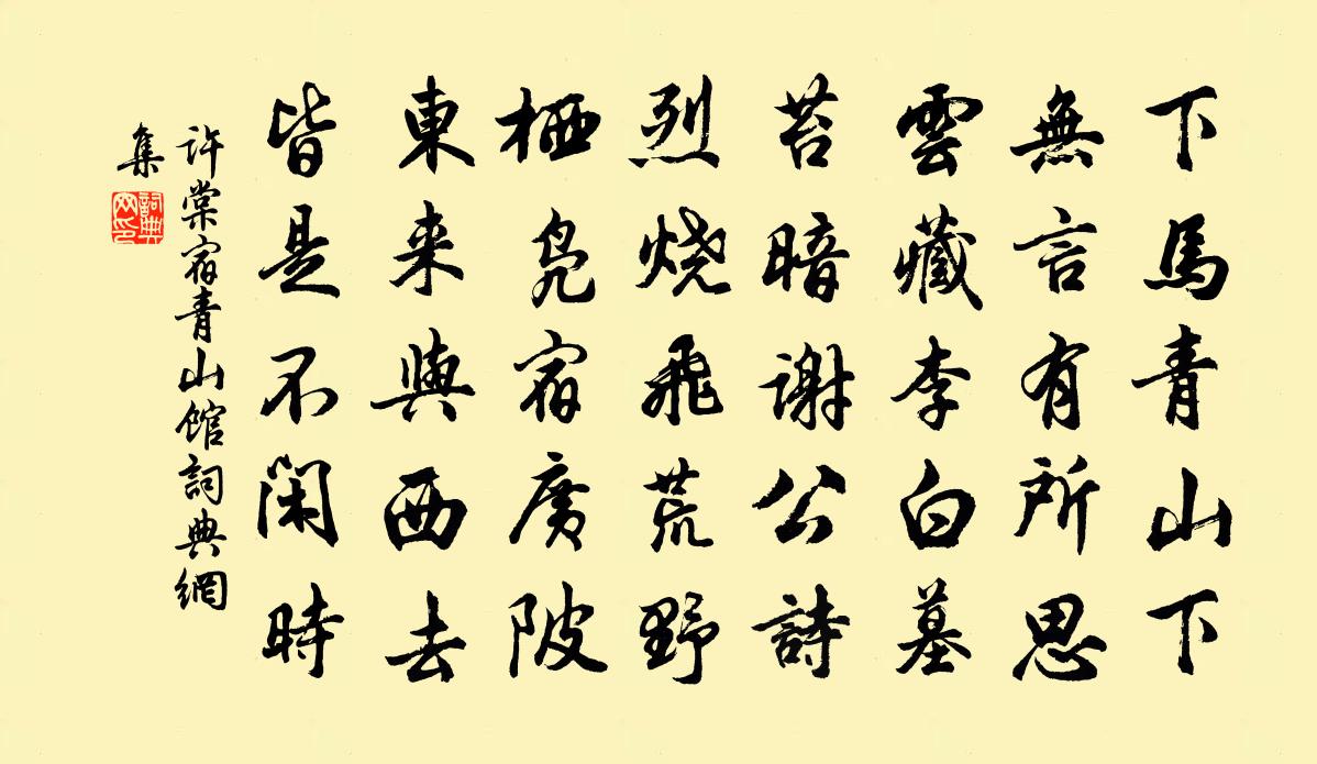 詩詞名句歷史字典書法欣賞書法字典國語詞典說文解字康熙字典古漢語字典標 題 作 者 詩 句 宿青山館作者:許棠 朝代:唐代宿青山館原文下馬青山下,無言有所思。雲藏李白墓,苔暗謝公詩。烈燒飛荒野,棲鳧宿廣陂。東來與西去,皆是不閒時。詩詞問答問:宿青山館的作者是誰?答:許棠問:宿青山館寫於哪個朝代?答:唐代問:宿青山館是什麼體裁?答:五律許棠宿青山館書法欣賞宿青山館書法作品注釋全唐詩:卷603-61詩詞推薦贈毛仙翁李益〔唐代〕玉樹溶溶仙氣深,含光混俗似無心。長愁忽作鶴飛去,一片孤云何處尋。句邵雍〔宋代〕始信畫前原有易,自從刪後更無詩。晚春即事鄭起〔宋代〕輕寒時節牡丹開,葉底青青又風梅。門外數枝楊柳薄,一春鶯燕不曾來。游鼓山真德秀〔宋代〕嚴宸有追詔,趣上太守符。疲民未甦醒,還雇空躊躇。來尋靈源盟,喜與佳客俱。始酌清泠泉,一浣丹墨洿。超然漓之水曾豐〔宋代〕逮固罔功,不逮寧罔罪。誰謂匪詿,又誰謂無悔。離哉離哉,固雲{爻下換心}哉,寧固雲憝哉。離哉離哉,固雲長安旅舍紓情投先達(一作長安抒懷寄知己)劉駕〔唐代〕岐路不在地,馬蹄徒苦辛。上國聞姓名,不如山中人。大宅滿六街,此身入誰門。愁心日散亂,有似空中塵。白露始生之日黎明以職事出郊喻良能〔宋代〕征鞍隨曉色,重露濕衣巾。誰謂懸弧日,翻為執轡辰。野花工笑客,啼鳥故窺人。呼酒澆孤悶,何心作好春。格卑韓偓〔唐代〕格卑嘗恨足牽仍,欲學忘情似不能。入意雲山輸畫匠,動人風月羨琴僧。南朝峻潔推弘景,東晉清狂數季鷹。惆悵枕上聞蛩有感舒岳祥〔宋代〕桑鳥催耕緣底事,草蟲促織竟何成。春風秋月祗垂淚,北斗南箕空得名。有客悲歌持築擊,何時至治以韶鳴。吾儕再次韻陳造〔宋代〕好時好節工惱客,投老只思深閉關。鶴膝痛醫終是病,蛾眉公奪豈容慳。浩歌已減落梅曲,苦思更妨頹醉山。冷語入廣至贛雪霽天朗聊舒耳目曾豐〔宋代〕數自離家今幾程,半風半雨半陰晴。白雲故作關愁色,烏鵲爭為報喜聲。來耗得梅偷傳送,去途惟柳管將迎。囊中和和靖八梅胡銓〔宋代〕暗裹尋香自不迷,照空焉用夜燃臍。欲危疏朵風吹老,太瘦長條雨颭低。孤艷幾時同把盞,野香猶記助看題。唐人潯陽宴別 此後忠州路上作。白居易〔唐代〕鞍馬軍城外,笙歌祖帳前。乘潮發湓口,帶雪別廬山。暮景牽行色,春寒散醉顏。共嗟炎瘴地,盡室得生還。跋張敞畫眉圖劉克莊〔宋代〕列岫新眉淡復濃,黛螺百斛不堪供。回頭卻笑張京兆,只掃閨中兩點峰。己卯歲初葺剡居戴表元〔宋代〕休言聲跡轉沉淪,百折江湖亂後身。窮未賣書留教子,飢寧食粥省求人。坐來齒避樵蘇長,往處蹤迷木石鄰。翻笑聞望之解舟王安石〔宋代〕子來我樂只,子去悲如何。謂言且少留,大舸已凌波。闇黮雖莫測,皇明邁羲娥。修門歸有時,京水非汨羅。賀新郎·夏景蘇軾〔宋代〕乳燕飛華屋。悄無人、桐陰轉午,晚涼新浴。手弄生綃白團扇,扇手一時似玉。漸困倚、孤眠清熟。簾外誰來推繡游長安諸寺聯句長樂坊安國寺紅樓聯句(隱侯體)段成式〔唐代〕重疊碎晴空,餘霞更照紅。蟬蹤近鳷鵲,鳥道接相風。 ——張希復苔靜金輪路,雲輕白日宮。壁詩傳謝客,門榜牧羝曲楊維楨〔元代〕老羝何日乳,歸雁忽能言。不逐虞常死,丁零尚有恩。寄呂巽伯換酒亭葉適〔宋代〕琅琊初址未完牢,猶倚虛名用我曹。自可全將醒前了,何因偏向醉中逃。艱危未肯當時共,誕逸空傳後代高。還有名句推薦上言加餐食,下言長相憶。佚名《飲馬長城窟行》 去年射虎南山秋,夜歸急雪滿貂裘。陸游《三月十七日夜醉中作》 悔既往之失,亦要防將來之非。洪應明《菜根譚·概論》 兵家稱客主異勢,客貴速戰,主貴持重。姚思廉《陳書·列傳·卷二十五》 鄉心新歲切,天畔獨潸然。劉長卿《新年作》 巨屨小屨同賈,人豈為之哉。孟子《孟子·滕文公章句上·第四節》 流星透疏木,走月逆行雲。賈島《宿山寺》 晚風庭院落梅初。淡雲來往月疏疏。李清照《浣溪沙·髻子傷春慵更梳》 集韻增廣,多見多聞。佚名《增廣賢文·上集》 梅花散彩向空山,雪花隨意穿簾幕。王旭《踏莎行·雪中看梅花》