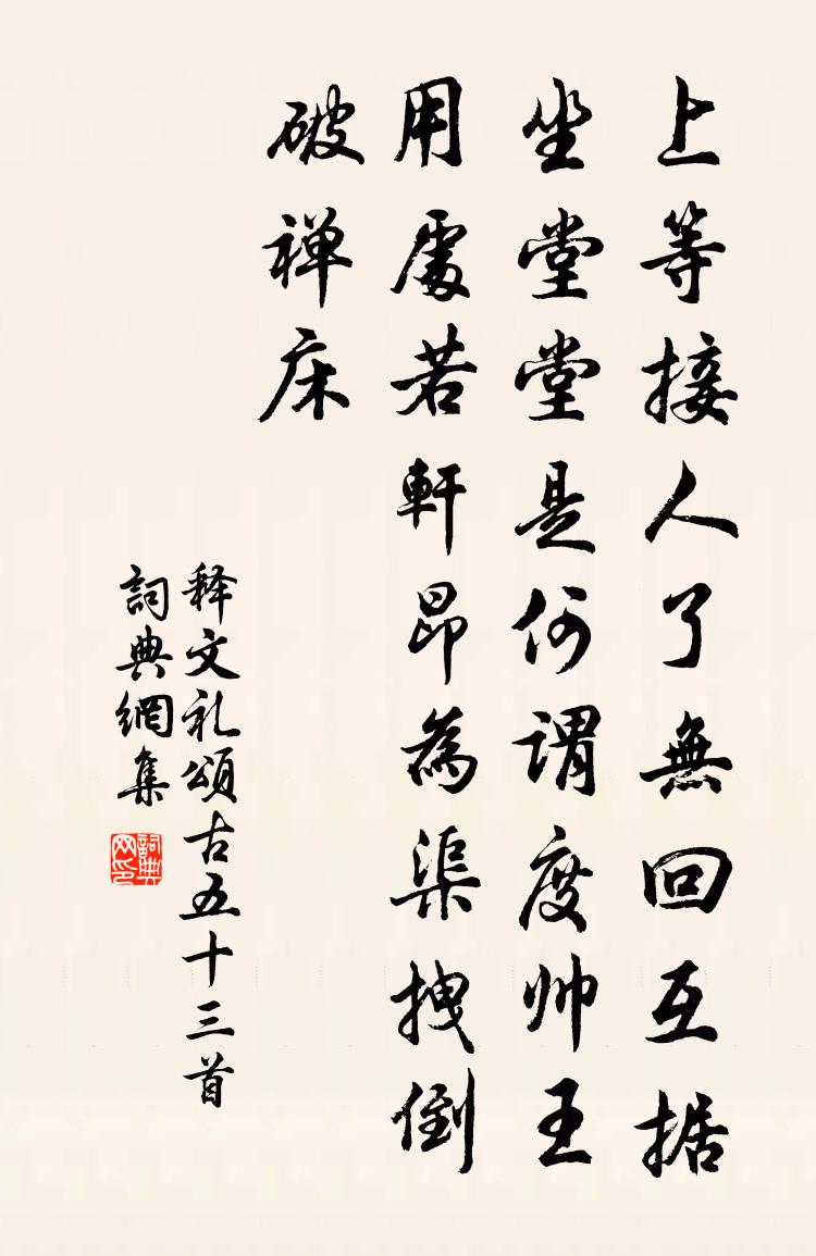 詩詞名句歷史字典書法欣賞書法字典國語詞典說文解字康熙字典古漢語字典標 題 作 者 詩 句 頌古五十三首作者:釋文禮 朝代:宋代頌古五十三首原文上等接人,了無回互。據坐堂堂,是何謂度。帥王用處若軒昂,為渠拽倒破禪床。詩詞問答問:頌古五十三首的作者是誰?答:釋文禮問:頌古五十三首寫於哪個朝代?答:宋代釋文禮頌古五十三首書法欣賞頌古五十三首書法作品詩詞推薦偈頌二百零五首釋正覺〔宋代〕一物長靈,十方普應。騎聲跨色,超眺越聽。浩浩也能縱能橫,如如也能動能靜。參飽叢林個樣人,取飯不問誰家贈醫齒道人宋自適〔宋代〕病欺年去故相加,要害先攻兩輔車。解後神工如掇拾,愧無樽酒對榴花。菩薩蠻劉仙倫〔宋代〕東風去了秦樓畔。一川菸草無人管。芳樹雨初晴。黃鸝三兩聲。海棠花已謝。春事無多也。只有牡丹時。知他歸不滿江紅(謝孟使君)汪莘〔宋代〕荊楚酒歲時,念酒自古、登酒臨風俗。酒休更道、桓家車騎,謝家絲竹。不覺吹將頭上帽,可來共采籬邊菊。嘆如廢宮陶應靁〔宋代〕雨壞宮牆蔓草多,自披荒棘認銅駝。舊家游女知亡國,不唱春風緩緩歌。七年九月,自廣陵召還,復館於浴室東堂。八蘇軾〔宋代〕夢繞吳山卻月廊,白梅盧橘覺猶香。會稽且作須臾意,從此歸田策最良。青玉案(暮春旅懷)劉辰翁〔宋代〕無腸可斷聽花雨。沈沈已是三更許。如此殘紅那得住。一春情緒。半生羈旅。寂寞空山語。霖鈴不是相思阻。四十新竹俞桂〔宋代〕傍牆穿過鄰家竹,愛護新篁數十竿。剪伐莫令童僕輩,老夫日日要來看。送江東集與王謙仲樞使,樞使和至後睡覺一首王藺〔宋代〕池塘春夢草初生,江左詩來得我驚。開秩快觀醒倦眼,挑燈細讀度寒更。追參李杜今無敵,揮斥侯劉獨有聲。一首處州獻盧員外方乾〔唐代〕才下軺車即歲豐,方知盛德與天通。清聲漸出寰瀛外,喜氣全歸教化中。落地遺金終日在,經年滯獄當時空。直緣題終南山僧堂羅鄴〔唐代〕九衢終日見南山,名利何人肯掩關。唯有吾師達真理,坐看霜樹老雲間。送家定國朝奉西歸蘇轍〔宋代〕我懷性同門友,性勢如曉天性星。老去性發垂素,隱居山更青。退翁聯科第,俯仰三十齡。仕官守鄉國,出入奉家居厚弟乞以礙止法官回授公朝特俞所請族子有劉克莊〔宋代〕回貤異渥未之聞,凜凜乾淳生氣存。頻對青藜真濟美,雖埋玉樹尚追尊。奉新鸞誥陳幽壤,距小麟台只近村。太息暢師同玉上人游茅草仇遠〔宋代〕上人家海上,喜從名山游。昔聞三茅君,隱在千峰頭。霜寒草木瘦,歲晚泉石幽。不見梁丘伯,使我心悠悠。鷓鴣天石孝友〔宋代〕收拾眉尖眼尾情。夜來真箇夢傾城。鴛鴦有底情難盡,蝴蝶無端夢易驚。愁一掬,月三更。繡幃應好睡輕盈。知他新暑書事陸游〔宋代〕城中五月汗沾衣,吾愛吾廬喜氣微。珍簟含風來遠餉,輕羅疊雪出鳴機。艾人當戶佳時過,筒黍堆盤舊俗非。漫欲對酒陸游〔宋代〕平生但信緣,作計每不審。舂炊官倉粟,一飽輒甘寢。二年棄微祿,溝壑方檁檁。藜羹闕鹽酪,豆飯雜沙墋。偶然和黃充小雪陳師道〔宋代〕度臘侵春亦未遲,紛紛款款意猶微。沾衣帶潤元無見,著物還消不待曦。剩欲打窗連夜聽,未須迷雁斷行飛。老年南鄉子馮延巳〔唐代〕細雨濕流光,芳草年年與恨長。煙鎖鳳樓無限事,茫茫,鸞鏡鴛衾兩斷腸。魂夢任悠揚,睡起楊花滿繡床。薄倖不北村吳園雨中賞牡丹主人留飲仇遠〔宋代〕不謂村園見此花,嬌紅數朵眩晴霞。可憐國色天香種,竟落田夫野老家。略具杯盤供筍蕨,已拚杖屨污泥沙。莫愁名句推薦雪沫乳花浮午盞,蓼茸蒿筍試春盤。蘇軾《浣溪沙·細雨斜風作曉寒》 吹燈窗更明,月照一天雪。袁枚《十二月十五夜》 秋色雁聲愁幾許,都在斜陽。吳文英《浪淘沙·九日從吳見山覓酒》 強攜酒、小橋宅,怕梨花落盡成秋色。姜夔《淡黃柳·空城曉角》 合軍聚眾, 務在激氣孫臏《孫臏兵法·延氣》 何須急管吹雲暝,高寒灩灩開金餅。高觀國《菩薩蠻·何須急管吹雲暝》 縱被春風吹作雪,絕勝南陌碾成塵。王安石《北陂杏花》 秋蕭索。梧桐落盡西風惡。黃機《憶秦娥·秋蕭索》 飛絮濛濛。垂柳闌乾盡日風。歐陽修《採桑子·群芳過後西湖好》 漢甲連胡兵,沙塵暗雲海。李白《經亂離後天恩流夜郎憶舊遊書懷贈江夏韋太守良宰》