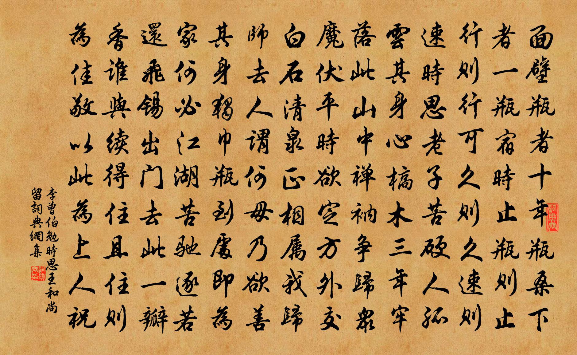 詩詞名句歷史字典書法欣賞書法字典國語詞典說文解字康熙字典古漢語字典標 題 作 者 詩 句 勉時思王和尚留作者:李曾伯 朝代:宋代勉時思王和尚留原文面壁瓶者十年,瓶桑下者一瓶宿。時止瓶則止行則行,可久則久速則速。時思老子苦硬人,孤雲其身心槁木。三年牢落此山中,禪衲爭歸眾魔伏。平時欲定方外交,白石清泉正相屬。我歸師去人謂何,毋乃欲善其身獨。巾瓶到處即為家,何必江湖苦馳逐。若還飛錫出門去,此一瓣香誰與續。得住且住則為佳,敬以此為上人祝。詩詞問答問:勉時思王和尚留的作者是誰?答:李曾伯問:勉時思王和尚留寫於哪個朝代?答:宋代李曾伯勉時思王和尚留書法欣賞勉時思王和尚留書法作品詩詞推薦重次林守韻並闌臞軒二首劉克莊〔宋代〕禁中前欲喚公歸,讀軾文章每嘆奇。玉節不煩熬雪海,金芝元合產銅池。愈郊各洗饑寒語,甫白曾為汗漫期。上盡盆池陳與義〔宋代〕三尺清池窗外開,茨菰葉底戲魚回。雨聲轉入浙江去,雲影還從震澤來。登烏龍山詩閣張伯玉〔宋代〕桐川本無塵,況此幽閣逈。萬木含秋聲,一軒與天淨。前峰翠分滴,後谷語相應。檻下江雲歸,檐前古雪凝。岩僧題黃岡東坡潘氏亦顏齋賀鑄〔宋代〕東坡有田誰料理,黧面蒼毛潘氏子。結茅題榜亦顏齋,農隙把書聊自喜。潘乎潘乎信是顏之徒,終日何所論難真如偶以拙詩數首寄呈裴少尹侍郎蒙以盛制四篇…美而謝之白居易〔唐代〕投君之文甚荒蕪,數篇價直一束芻。報我之章何璀璨,累累四貫驪龍珠。毛詩三百篇後得,文選六十卷中無。一麋商子引語佚名〔先秦〕愚者暗於成事。智者見於未萌。南樓晚望李彌遜〔宋代〕海角長安望爾賒,日邊雲影更橫斜。身閒夢覺俱成蝶,眼病朝昏只見花。可但陶潛能避俗,不應范蠡便浮家。君恩和熊叔雅四詠清湖驟雨劉子翬〔宋代〕快雨不相期,平湖忽蕭颯。坐久日明檐,繁聲靜中滅。北郭貧居孟郊〔唐代〕進乏廣莫力,退為蒙籠居。三年失意歸,四向相識疏。地僻草木壯,荒條扶我廬。夜貧燈燭絕,明月照吾書。欲識送韓太祝歸許昌司馬光〔宋代〕王城名利窟,冠苔郁相交。夫君獨鳳舉,飄然去喧呶。潁水清可濯,箕山高可巢。反顧公相榮,一芥浮堂坳。□□阮郎歸元好問〔金代〕謾郎活計拙於鳩。閒中又過秋。枕書眠了卻登樓。貧來頗自由。書咄咄,賦休休。西窗晚更幽。詩家貧殺也風流。次楊樂道韻六首其二——御溝王安石〔宋代〕渺渺金河漲欲平,數支分綠報清明。常縈輦路漂花去,更引流杯送酒行。靜見金輿穿樹影,清含玉漏過牆聲。衰顏黃檗香爐峰陳藻〔宋代〕黃檗寺前猶突兀,祖師塔外別安排。香爐好是中央小,無數峰巒拱揖來。次前韻再送周正孺蘇軾〔宋代〕東川得望郎,坐與西爭重。高風傾石室,舊學鄙文冢。蜀人安使君,所至野不聳。竹馬迎細侯,大錢送劉寵。遙知夢海山壁間詩不能盡記以其意追補陸游〔宋代〕春殘枕藉落花眠,正是周家定鼎年。睡起不知秦漢事,一尊閒醉華陽川。贈琴照晁說之〔宋代〕會稽城畔不見海,會稽城裡海有聲。此海之聲三尺桐,渺如渤澥含太清。惜哉寂寥三十載,月出愁空不肯明。邂逅清明前一日與客自光孝登般若庵觀鐵塔舊基因韓元吉〔宋代〕青鞵藜杖破層雲,勝日猶能眼界新。窣堵已摧豪士手,狻猊猶現法王身。寺藏松竹疑無地,路接煙霄不到塵。車馬二老堂葛立方〔宋代〕去家才隔水一股,二老堂成三百弓。鴒原暮下沙水暖,雁行夜落霜天空。竹根酌酒不妨醉,花萼斲詩如許工。坐久楊柳鄭會〔宋代〕憶別東湖兩度春,西湖柳眼又新新。想因一樣湖邊柳,一樣春風一樣青。折丹桂(端復受官並序)程大昌〔宋代〕通奉嘗欲為先碩人篆帔,命為詩語,某獻語曰:“詩禮為家慶,貂蟬七葉余。庭闈稱壽處,童稚亦金魚。”通奉喜名句推薦且莫思身外,長近尊前。周邦彥《滿庭芳·夏日溧水無想山作》 薊城通漠北,萬里別吾鄉。李頎《古塞下曲》 驕奢淫逸,所自邪也。左丘明《左傳·隱公·隱公三年》 疏籬下、試覓重陽,醉擘青露菊。吳文英《一寸金·秋感》 守職而不廢,處義而不回。黃石公《素書·正道》 譬之若水火然,善用之則為福,不能用之則為禍呂不韋《呂氏春秋·紀·孟秋紀》 黃埃散漫風蕭索,雲棧縈紆登劍閣。白居易《長恨歌》 五更疏欲斷,一樹碧無情。李商隱《蟬》 孤舟向廣武,一鳥歸成皋。岑參《鞏北秋興寄崔明允》 一物不成,兩物見在。施耐庵《水滸傳·第十二回二》