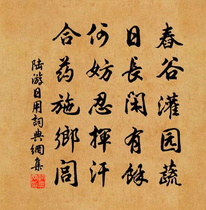詩詞名句歷史字典書法欣賞書法字典國語詞典說文解字康熙字典古漢語字典標 題 作 者 詩 句 日用作者:陸游 朝代:宋代日用原文舂穀灌園蔬,日長閒有餘。何妨忍揮汗,合藥施鄉閭。詩詞問答問:日用的作者是誰?答:陸游問:日用寫於哪個朝代?答:宋代問:陸游的名句有哪些?答:陸游名句大全陸游日用書法欣賞日用書法作品詩詞推薦望蓬萊 醴泉覓錢王哲〔元代〕醴泉好,偏愛養貧兒。為破殫虛華□業,余從捉住傻猿兒。無女又無兒。街兩面,願助小錢兒。同共買成金麥飯,又口占小詩五首李壁〔宋代〕蟬連夜語不勝清,欹枕僧窗蠟炬明。早是宋公懷抱惡,更禁庭樹作離聲。霓裳中序第一(壽王之朝)陳著〔宋代〕華胄銀青氣脈,仙風斑白鬚眉。兒孫玉雪滿庭幃。家慶人間難比。浮世事等雲過,平生心有天知。舉杯相約小春時留贈畏之李商隱〔唐代〕清時無事奏明光,不遣當關報早霜。中禁詞臣尋引領,左川歸客自迴腸。郎君下筆驚鸚鵡,侍女吹笙弄鳳凰。空寄西齋秋感二十首方回〔宋代〕里選廢出井田,廢賢能貢王廢都。亦有廢起農畔,在官為胥徒。河汾著中說,明明析二途。鞭算尚察此,廢吏寧用仁宗皇帝輓詩十首文同〔宋代〕徇速承王后,聰明復辟初。恩波同海浸,刑網比天疏。屢有搜賢詔,曾無諫獵書。惟余封禪事,應恨缺蒲車。題外甥楊克一詩篇末張耒〔宋代〕十年不復上天津,閒卻西都幾度春。里巷夢中迷向背,山河句里見精神。藝成斧鑿真須棄,學富篇竟自不貧。莫倚太常樂章三十首其十五南郊降神奏高安之曲楊億〔宋代〕爰卜吉土,在國之陽。肆類於帝,錫羨無疆。備物致享,嘉生阜昌。純嘏昭答,長發其祥。水龍吟(六月宴雙溪)吳泳〔宋代〕修篁翠葆人家,分明水鑒光中住。就中得要,危亭瞰淥,小橋當路。一榻桃笙,半窗竹簡,清涼如許。縱武陵佳麗瑞鶴仙(憶舊居,呈超然,示兒子及女)楊 * 〔宋代〕依山仍負郭。有松桂扶疏,煙霞渺漠。一年自成落。奈孤蹤還系,蠅頭蝸角。休嗤句弱。賦郊居、何讓沈約。記鄉偈傾一百六十九首釋智朋〔宋代〕收則大地全收,展則大千俱覆。黃面瞿曇,隱身無路。綠陰亭鄧林〔宋代〕千山橫碧一溪清,白鳥飛邊落照明。吏散庭階無一事,綠陰亭上又詩成。夢中作得六句覺後足成張嵲〔宋代〕山中茅屋好,況復竹籬新。一逕往來客,萬山迎送人。葉殷渾欲染,冬暖卻疑春。近得幽棲地,時來岸角巾。飯後自嘲陸游〔宋代〕歲熟家彌困,天寒酒闕傾。僅能炊稻飯,敢望糝藜羹。一榻解腰臥,四廊摩腹行。詩人要疏瘦,此日媿膨脝。同正輔表兄游白水山蘇軾〔宋代〕偉哉造物真豪縱,攫土摶沙為此弄。劈開翠峽走雲雷,截破奔流作潭洞。因隨化人履巨跡,得與仙兄躡飛鞚。曳杖贈道者項斯〔唐代〕晏來知養氣,度日文時稀。到處留丹井,終寒不絮衣。病鄉多惠藥,鬼俗有符威。自說身輕健,今年數夢飛。塞上譚用之〔唐代〕秋風漢北雁飛天,單騎那堪繞賀蘭。磧暗更無岩樹影,地平時有野燒瘢。貂披寒色和衣冷,劍佩胡霜隔匣寒。早晚送邢子強還洛晁說之〔宋代〕行樂洛城為第一,蹔勞使節持還家。橋頭鋪遍中秋月,樓上吹殘九日花。誰聽高談擒虎豹,且容濁酒傲煙霞。從君浪淘沙張炎〔宋代〕香霧濕雲環。蕊佩珊珊。酒醒微步晚波寒。金鼎尚存丹已化,雪冷虛壇。遊冶未知還。鶴怨空山。瀟湘無夢繞叢蘭噫田操四章章六句寄呈王介甫王令〔宋代〕田彼黍矣,幾不螽蝝。我人之耕,而不謀年。唯其不謀年,是用卒食于田。名句推薦唯有相思似春色,江南江北送君歸。王維《送沈子歸江東 / 送沈子福之江東》 千載休談南渡錯,當時自怕中原復。文徵明《滿江紅·拂拭殘碑》 泥上偶然留指爪,鴻飛那復計東西。蘇軾《和子由澠池懷舊》 知臣莫若於君,知子莫若於父。魏徵《隋書·帝紀·卷二》 教婦初來,教兒嬰孩。顏之推《顏氏家訓·教子篇》 斷崖蒼蘚對立久,凍雨為洗前朝悲。黃庭堅《書摩崖碑後》 前事之不忘,後事之師。劉向《戰國策·趙一·張孟談既固趙宗》 不扶自直,不鏤自雕。范曄《後漢書·列傳·周黃徐姜申屠列傳》 風一更,雪一更,聒碎鄉心夢不成,故園無此聲。納蘭性德《長相思·山一程》 人迷洞庭水,雁度瀟湘煙。李白《郢門秋懷》