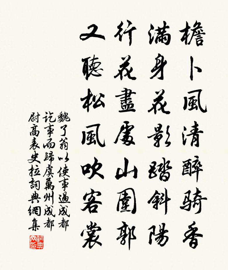 詩詞名句歷史字典書法欣賞書法字典國語詞典說文解字康熙字典古漢語字典標 題 作 者 詩 句 以使事過成都訖事而歸虞萬州成都尉高表史拉作者:魏了翁 朝代:宋代原文檐卜風清醉騎香,滿身花影踏斜陽。行花盡處山圍郭,又聽松風吹客裳。詩詞問答問:《以使事過成都訖事而歸虞萬州成都尉高表史拉》的作者是誰?答:魏了翁問:該詩寫於哪個朝代?答:宋代書法欣賞以使事過成都訖事而歸虞萬州成都尉高表史拉書法作品詩文賞析【原題】:以使事過成都訖事而歸虞萬州成都尉高表史拉訪靈泉宰高表史風雨連明遂謁朱祭酒祠即事賦詩詞推薦送文處厚歸蜀類試范成大〔宋代〕萬里東來萬里歸,正憐寡婦與孤兒。死生契闊心如鐵,風雨飄搖鬢欲絲。早集漢庭陪振鷺,莫留岷嶺戀蹲鴟。故家二郎神(再和)吳潛〔宋代〕近時厭雨,喜午日、放開天日。不用辟兵符,從今去也,管定千祥萬吉。已報甘泉新捷到,況更是、年豐堪必。任禪人寫真求贊釋正覺〔宋代〕一色功回,雷雲凍開。萬機俱罷,風月轉夜。空空谷有神,欣欣木有春,而今何處不分身。休說徐夤〔唐代〕休說人間有陸沈,一樽閒待月明斟。時來不怕滄溟闊,道大卻憂潢潦深。白首釣魚應是分,青雲乾祿已無心。梓桐別陳尉方岳〔宋代〕市橋晴柳拂朱旗,天際九華勞夢思。鸂鶒灘深猶昨日,鸕鶿杓醉復何時。微官梅隱亦風度,寒食梨花更別離。蚤晚清平樂許棐〔宋代〕鳳雙鸞偶。天上人間有。檐玉無聲花影瘦。夜淺春濃時候。別來幾度寒宵。六橋風月迢迢。燈下有誰相伴,一方紅句鄭居中〔宋代〕邱壑未應容謝傳,袞衣行見命周公。次韻程天游敘舊葛立方〔宋代〕太學虀鹽愴語離,半周甲子定何之。霜空過雁我宴坐,雲路看鴻君賦詩。鄙吝政憂陳仲舉,談諧喜值庾元規。東鄰搆竹樓初成趙友直〔宋代〕竹樓新搆喜初成,為檢遺編課子程。山近硯池雲自濕,門無轍跡草偏青。光團霽月盤書案,翠暖香風透畫屏。舊業郭璞墓劉克莊〔宋代〕先生精數學,卜穴未應疏。因捋虎鬚死,還尋魚腹居。如何師鬼谷,卻去友靈胥。此理恁誰詰,人方寶葬書。題玄哲禪師影堂張喬〔唐代〕吾師視化身,一念即遺塵。岩谷藏虛塔,江湖散學人。雲迷禪處石,院掩寫來真。寂寞焚香後,閒階細草生。寫真自贊五首黃庭堅〔宋代〕飲不過一瓢,食不過一簞,田夫亦不改其樂,而夫子不謂之能賢,何也。顏淵當首出萬物,而奉以四海九州,而享送文與可出守陵州蘇軾〔宋代〕壁上墨君不解語,見之尚可消百憂。而況我友似君者,素節凜凜欺霜秋。清詩健筆何足數,逍遙齊物追莊周。奪官答客難東方朔〔兩漢〕客難東方朔曰:“蘇秦、張儀一當萬乘之主,而身都卿相之位,澤及後世。今子大夫修先王之術,慕聖人之義,諷菩薩蠻劉仙倫〔宋代〕東風去了秦樓畔。一川菸草無人管。芳樹雨初晴。黃鸝三兩聲。海棠花已謝。春事無多也。只有牡丹時。知他歸不西江月(燈花)曹希蘊〔宋代〕零落不因春雨,吹噓何假東風。紗窗一點自然紅。費盡工夫怎種。有艷難尋膩粉,無香不惹游蜂。更闌人靜畫堂中為土山行者勸緣劉宰〔宋代〕莫言山勢但陂陁,坐斷東南萬頃波。地勝要人勤酒掃,瓶空無米卻如何。游雪竇杖錫七首錦鏡池陳著〔宋代〕萬仞崖擎碧玉台,中閒一鏡帖天開。四時自與幽花對,一點時妝不照來。賀新郎(贈建康鄭玉脫籍)劉仙倫〔宋代〕鄭玉非娼女。嘆塵緣未了,飄零被春留住。腸斷胭脂坡下路。成甚心情意緒。生怕入、梨園歌舞。寂寞陽台雲雨散機禪人發心丐田釋正覺〔宋代〕歷歷機梭看轉旋,衲僧手眼有千千。將知白雪上方飯,出自黃雲負郭田。溉灌流金溪口月,耕犁卷幕隴頭煙。和泥名句推薦我見青山多嫵媚,料青山見我應如是。辛棄疾《賀新郎·甚矣吾衰矣》 勢有不可得,事有不可成。韓非及後人《韓非子·觀行》 黃河遠上白雲間,一片孤城萬仞山。王之渙《涼州詞二首·其一》 春風只在園西畔。薺菜花繁胡蝶亂。嚴仁《玉樓春·春思》 新葉初冉冉,初蕊新霏霏。謝朓《詠落梅》 為川者決之使導,為民者宣之使言。左丘明《國語·周語·邵公諫厲王弭謗》 此身行作稽山土,猶吊遺蹤一泫然。陸游《沈園二首》 窮不失義,達不離道。孟子《孟子·盡心章句上·第九節》 巧偽不如拙誠顏之推《顏氏家訓·名實篇》 莫辭盞酒十分勸,只恐風花一片飛。程顥《郊行即事》