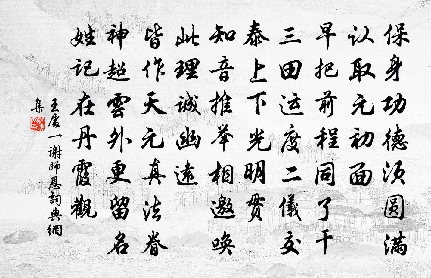 詩詞名句歷史字典書法欣賞書法字典國語詞典說文解字康熙字典古漢語字典標 題 作 者 詩 句 謝師恩作者:王處一 朝代:元代謝師恩原文保身功德須圓滿。認取元初面。早把前程同了乾。三田運度,二儀交泰,上下光明貫。知音推舉相邀喚。此理誠幽遠。皆作天元真法眷。神超雲外,更留名姓,記在丹霞觀。詩詞問答問:謝師恩的作者是誰?答:王處一問:謝師恩寫於哪個朝代?答:元代問:謝師恩是什麼體裁?答:詞王處一謝師恩書法欣賞謝師恩書法作品詩詞推薦寄題天台國清寺齊梁體陸龜蒙〔唐代〕峰帶樓台天外立,明河色近罘罳濕。松間石上定僧寒,半夜楢溪水聲急。菩薩蠻黃人傑〔宋代〕小春撋就雙桃靨。伴他二六堯蓂莢。紅綠若為新。個時生玉人。玉人持酒笑。笑與仙翁道。從此百年中,鶯花幾度蘇東坡西山詩前後和者五十餘篇暇日登覽愴然陳杰〔宋代〕檻外春江如醱醅,檻前松株逐番栽。西門巡得陶氏柳,西嶺並無坡老梅。惟余荒磎入煙霧,曾載轍跡行崔嵬。窪樽孟子夷之陳普〔宋代〕厚葬非徒識所先,分明至愛自心根。憮然一悟奚從發,為有良知尚未昏。升山寺周朴〔唐代〕升山自古道飛來,此是神功不可猜。氣色雖然離禹穴,峯巒猶自接天台。岩邊折樹泉沖落,頂上浮雲日照開。南望答王筠早朝守建陽門開詩江總〔隋代〕金兔猶懸魄。銅龍欲啟扉。三條息行火。百雉照初暉。御溝槐影出。仙掌露光晞。題史院壁陸游〔宋代〕白髮無餘鬒,蒼顏失故丹。旅遊多敗意,大屋每饒寒。出畏霜侵褐,歸乘日暖鞍。若非時得句,何以慰衰殘?登高丘而望遠李白〔唐代〕登高丘而望遠海,六鰲骨已霜,三山流安在?扶桑半摧折,白日沉光彩。銀台金闕如夢中,秦皇漢武空相待。精衛秋日夏口涉漢陽,獻李相公劉長卿〔唐代〕日望衡門處,心知漢水濆。偶乘青雀舫,還在白鷗群。間氣生靈秀,先朝翼戴勛。藏弓身已退,焚藁事難聞。舊業雜詩六首李若水〔宋代〕風流李東山,磊落孔北海。身逐煙雲飛,名與日月在。彼哉世上見,平生抱慚悔。雖雲官爵高,當以羊豕待。念奴嬌京鏜〔宋代〕繡天花錦地,花浣花溪風花物,尤為花奇絕。無限蘭舟相蕩漾,繒彩重重裝結。冀國遺蹤,杜陵陳跡,疑信俱休說句胡銓〔宋代〕中有羈孤濕帽尖。春詞二首 其一)朱淑真〔宋代〕屋嗔柳葉噪春鴉,簾幙風輕燕翅斜。芳草池塘初夢斷,海棠庭院正愁加。幾聲嬌巧黃鶯舌,數朵柔纖小杏花。獨倚雜詠五言八首劉克莊〔宋代〕園令詞章妙,君王悔悟深。能回九重眷,只賣百斤金。題慈恩友人房李洞〔唐代〕賈生耽此寺,勝事入詩多。鶴宿星千樹,僧歸燒一坡。塔棱垂雪水,江色映茶鍋。長久堪棲息,休言憶鏡波。鷓鴣天 化度寺作吳文英〔宋代〕池上紅衣伴倚闌。棲鴉常帶夕陽還。殷雲度雨疏桐落,明月生涼寶扇閒。鄉夢窄,水天寬。小窗愁黛澹秋山。吳鴻金山修磚岸釋普度〔宋代〕長江萬里涌金鰲,屹立中流氣勢豪。直下放教根腳穩,任教八面起風濤。送江陵薛侯入覲序袁宏道〔明代〕當薛侯之初令也,璫而虎者,張甚。郡邑之良,泣而就逮。侯少年甫任事,人皆為侯危。侯笑曰:“不然。此蒙莊冬至王安石〔宋代〕都城開博路,佳節一陽生。喜見兒童色,歡傳市井聲。幽閒亦聚集,珍麗各攜擎。卻憶他年事,關商閉不行。將赴荊南,寄別李劍州杜甫〔唐代〕使君高義驅今古,寥落三年坐劍州。但見文翁能化俗,焉知李廣未封侯。路經灩澦雙蓬鬢,天入滄浪一釣舟。戎馬名句推薦少室眾峰幾峰別,一峰晴見一峰雪。李頎《少室雪晴送王寧》 槐陰別院宜清晝,入座春風秀。美人圖子阿誰留。元好問《虞美人·槐陰別院宜清晝》 雪洗虜塵靜,風約楚雲留張孝祥《水調歌頭·和龐佑父》 垓下美人泣楚歌,定陶美人泣楚舞,真龍亦鼠虎亦鼠。王象春《書項王廟壁》 天下皆知取之為取,而莫知與之為取。范曄《後漢書·列傳·桓譚馮衍列傳上》 以色事他人,能得幾時好。李白《妾薄命》 皚如山上雪,皎若雲間月。卓文君《白頭吟》 待把酒送君,恰又清明後。何夢桂《摸魚兒·記年時人人何處》 士雖有學,而行為本焉。墨子《墨子·02章 修身》 梧桐樹,三更雨,不道離情正苦。溫庭筠《更漏子·玉爐香》