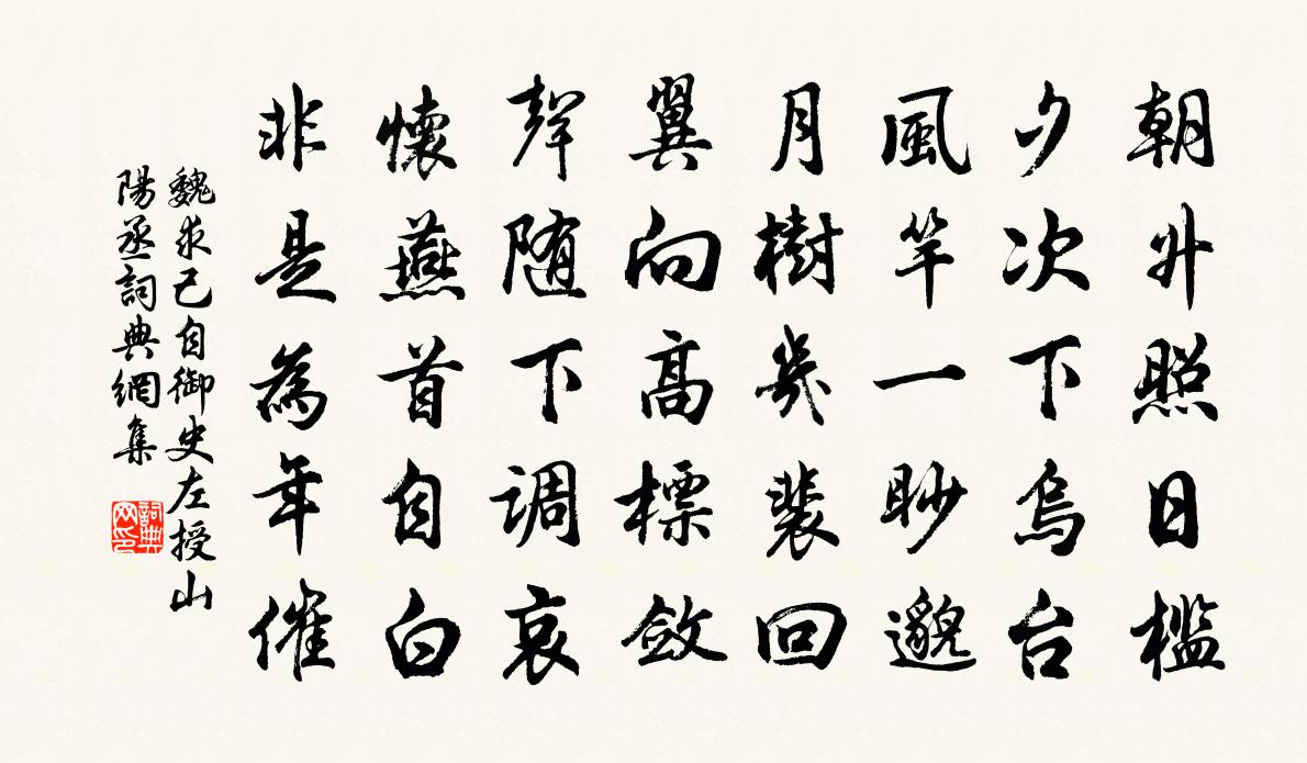 詩詞名句歷史字典書法欣賞書法字典國語詞典說文解字康熙字典古漢語字典標 題 作 者 詩 句 自御史左授山陽丞作者:魏求己 朝代:唐代自御史左授山陽丞原文朝升照日檻,夕次下烏台。風竿一眇邈,月樹幾裴回。翼向高標斂,聲隨下調哀。懷燕首自白,非是為年催。詩詞問答問:自御史左授山陽丞的作者是誰?答:魏求己問:自御史左授山陽丞寫於哪個朝代?答:唐代問:自御史左授山陽丞是什麼體裁?答:五律魏求己自御史左授山陽丞書法欣賞自御史左授山陽丞書法作品注釋全唐詩:卷44_30詩詞推薦望雨郭印〔宋代〕秋杪陽光熾苦焚,了無陰翳徹朝曛。天公有意憐行役,乞與空中一片雲。耕圖二十一首布秧樓璹〔宋代〕舊谷發新穎,梅黃雨生肥。下田初播殖,卻行手奮揮。明朝望平疇,綠鍼刺風漪。審此一寸根,行作合穗期。楊妃牡丹方岳〔宋代〕馬嵬殘恨久銷沈,花捻妝痕尚不禁。當日願為連理木,春風不負合歡心。病維摩減詩情盡,窮孟嘗添酒債深。醉面瓊花董嗣杲〔宋代〕后土花呈絕世祥,瑤姿琪艷著惟揚。一株獨擅無雙譽,六月重開有異香。描作畫圖尊地產,釀成花露敵天漿。朱闌次花翁冬日三詩杜范〔宋代〕料理新陽在此朝,休文但覺頻寬腰。懶將漫刺巡門到,病怕時人舉酒邀。強裹青衫空自累,滿簪白髮不相饒。冥心句周林〔宋代〕殷紅片片點蒼苔。巫山一段雲 漁村落照李齊賢〔元代〕遠岫留殘照,微波映斷霞。竹籬茅舍是漁家。一徑傍林斜。綠岸雙雙鷺,青山點點鴉。時聞笑語隔蘆花。白酒換魚似居簡陳著〔宋代〕老歲雖尋相近寺,危時欲見得交人。平生自有凌雪志,只恐峰高不受鄰。臨江仙李石〔宋代〕八曲闌乾垂手處,燭光花影疏疏。一尊共飲記當初。彩毫濃點,雙帶要人書。日暮不來朱戶隔,碧雲高掛蟾蜍。琴禮部權侍郎閣老史館張秘監閣老有離合酬贈…聊繼此章崔邠〔唐代〕脈脈羨佳期,月夜吟麗詞。諫垣則隨步,東觀方承顧。林雪消艷陽,簡冊漏華光。坐更芝蘭室,千載各芬芳。節苦寄謝三井山禱雨二首陳襄〔宋代〕何年修廟貌,棟宇已摧殘。牲幣三時少,風泉四月寒。野僧多稌穥,古木有杉欒。深欲重修葺,蹉跎又解官。虞美人韓淲〔宋代〕送君報最登朝路。初整曹裝處。又因杯酒見餘情。涼雨靈山閣上、月初晴。醺然領客襟懷底。消得闌乾倚。風流別送李室長慶州寧覲黃庶〔宋代〕我愛孟堅文學飽,持筆去作將軍客。鋪張大漢征北功,手攜直上燕然刻。千載事掛單于眼,至今猶若擒白黑。幾年出郊書懷王炎〔宋代〕扁舟蓑笠寄平生,元是江湖一白丁。偶著青衫持手版,懶占黃色上天庭。正須第事問三尺,未暇對人談六經。啼鳥題毗陵上人院朱慶餘〔唐代〕院深終日靜,落葉覆秋蟲。盥漱新齋後,修行未老中。映松山色遠,隔水磬聲通。此處宜清夜,高吟永與同。通惠泉張嵲〔宋代〕東西幾山隔,石徑不容車。那知厚地底,自然成井渠。甘餘留齒頰,清足鑒眉須。不用瓶罍貯,累累似酒酤。歐陽郡太君輓歌二首梅堯臣〔宋代〕夫人有賢子,往歲謫夷陵。欲使無愁郁,怡然見寢興。外詞陽磊磊,內畏實兢兢。隮壽復終貴,共為時所稱。無骨箬施樞〔宋代〕功成歸去作飛仙,箬下遺丹不浪傳。千載豈皆無遇者,要須種植驗前緣。和林太淵二首劉克莊〔宋代〕聲稱籍甚自髫年,聖處聞之於膝邊。廟瑟久無人續響,國棋誰與子分先。書經秦火訛難讀,缽至曹溪靳不傳。功行武擔山寺蘇頲〔唐代〕武擔獨蒼然,墳山下玉泉。鱉靈時共盡,龍女事同遷。松柏銜哀處,幡花種福田。詎知留鏡石,長與 * 圓。名句推薦桃李風前多嫵媚,楊柳更溫柔。辛棄疾《武陵春·桃李風前多嫵媚》 朕以天下為憂,豈直一 方耶?脫脫《宋史·本紀·卷六》 年少辭家從冠軍,金鞍寶劍去邀勛。王涯《塞下曲二首·其二》 紫萸一枝傳賜,夢誰到、漢家陵。姚雲文《紫萸香慢·近重陽》 況屬高風晚,山山黃葉飛。王勃《山中》 橫槊題詩,登樓作賦,萬事空中雪文天祥《酹江月·和友驛中言別》 江海不擇小助,故能成其富。韓非及後人《韓非子·大體》 香臉半開嬌旖旎。當庭際。玉人浴出新妝洗。李清照《漁家傲·雪裡已知春信至》 出犯繁花露,歸穿弱柳風溫庭筠《清明日》 對茲佳品酬佳節,桂拂清風菊帶霜。曹雪芹《螃蟹詠》