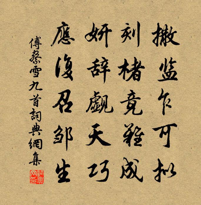詩詞名句歷史字典書法欣賞書法字典國語詞典說文解字康熙字典古漢語字典標 題 作 者 詩 句 雪九首作者:傅察 朝代:宋代雪九首原文撒監乍可擬,刻楮竟難成。妍辭覷天巧,應復召鄒生。詩詞問答問:雪九首的作者是誰?答:傅察問:雪九首寫於哪個朝代?答:宋代傅察雪九首書法欣賞雪九首書法作品詩詞推薦再用豐字韻對雪呈圓機晁說之〔宋代〕樂只康州得婁豐,鼓簫欣喜有池龍。魚由米穴多爭出,泥在函關廣費封。鎮玉無時非北渚,磨圭在處是南容。胡然清平樂毛滂〔宋代〕鏤煙翦霧。革甲E973無層數。苜蓿青深煩雪兔。引到祥華開處。仙人手翳朝陽。清都絳闕相將。來覆東封翠輦滿江紅黃人傑〔宋代〕居士生朝,元來是、湖山勝日。長共薦、霜前籬落,半黃橙桔。酒壓浮蛆新旨釅,香浮瑞獸祥煙密。更小蠻、清唱韋軒游山遇雨王柏〔宋代〕踏碎羊山黃葉堆,天飛細雨相車回。二皇應訝來何晚,不忍聽君話別杯。途中送權三兄弟(一作送權驊)皇甫冉〔唐代〕淮海風濤起,江關憂思長。同悲鵲繞樹,獨作雁隨陽。山晚雲初雪,汀寒月照霜。由來濯纓處,漁父愛滄浪。送山甫赴嶺口倉五言二首劉克莊〔宋代〕跬步難相舍,今為薄宦驅。長年乾父蠱,晚節賴家駒。黃雀餉師渾甫家仲安史堯弼〔宋代〕深秋風露豆苗肥,一粒才貪觸禍機。萬裡頭顱無處覓,刺天那復見群飛。送交代倅車晏十一魯望張伯玉〔宋代〕魯望江南客,風騷獵將壇。高吟得意處,清韻逼人寒。場屋聲華舊,襟靈渤澥寬。閨門盡羔雁,庭野列芝蘭。黽勉贈宋小著四錫〔宋代〕紫皇御天方視事,將擇靈官補仙吏。金波古殿寒星簾,虹節蜺旌觀就試。白皙仙人皆雪衣,衣冠森列蟾蜍墀。寶盤赴刁景純招作將進酒呈同會梅堯臣〔宋代〕日光書如熔金,書湧上滄海書流。一朝復一朝,鑄出萬古愁。大爐石破碎,世事安得休。明月只照夜,時時如屈鉤盱眙旅客路德章〔宋代〕道旁草屋兩三家,見客擂麻旋點茶。漸近中原語音好,不知淮水是天涯。夢中和觴字韻黃庭堅〔宋代〕天教兄弟各異方,不使新年對舉觴。作雲作雨手翻覆,得馬失馬心清涼。何處胡椒八百斛,誰家金釵十二行。一邱雨中出湖上送客楊萬里〔宋代〕細雨輕煙著地昏,湖波真箇解生塵。淨慈靈隱君休覓,失卻諸峰不惱人。陳粹中再約重陽之集即不果赴以詩寄這二首王洋〔宋代〕酒熟招期勝士開,錦溪詞伯是仙才。衰顏野老無酬對,若有新詩卻寄來。答陸澧張九齡〔唐代〕松葉堪為酒,春來釀幾多。不辭山路遠,踏雪也相過。第五十卷頌古三十一首釋如本〔宋代〕家世拄杖,佛祖付囑。溈山寄來,香嚴發哭。父子投機,陽春雪曲。不是知音,大難相續。跋圓覺經釋祖欽〔宋代〕大虛圓滿,妙覺混融。如春化物,和而不同,力不在東風。鑷白王建〔唐代〕總道老來無用處,何須白髮在前生。如今不用偷年少,拔卻三莖又五莖。送阮洗馬之全州徐鉉〔唐代〕望苑回先馬,山城駐使車。塗中值歸雁,頻寄北來書。喜邢校書遠至對雨同賦遠晚飯阮返五韻李益〔唐代〕雀噪空城陰,木衰羈思遠。已蔽青山望,徒悲白雲晚。別離千里風,雨中同一飯。開徑說逢康,臨觴方接阮。旅宦名句推薦試上吳門窺郡郭,清明幾處有新煙。張繼《閭門即事》 適與野情愜,千山高復低梅堯臣《魯山山行》 酒已都醒,如何消夜永!周邦彥《關河令·秋陰時晴漸向暝》 饒人不是痴漢,痴漢不會饒人。佚名《增廣賢文·上集》 見梨花初帶夜月,海棠半含朝雨。万俟詠《三台·清明應制》 權衡損益,斟酌濃淡。芟繁剪穢,弛於負擔。劉勰《文心雕龍·熔裁》 素娥無賴,西去曾不為人留。蘇轍《水調歌頭·徐州中秋》 蛛絲暗鎖紅樓,燕子穿簾處。吳文英《荔枝香近·七夕》 予若洞庭葉,隨波送逐臣。李白《送郄昂謫巴中》 山驛淒涼,燈昏人獨寢。陸游《清商怨·葭萌驛作》