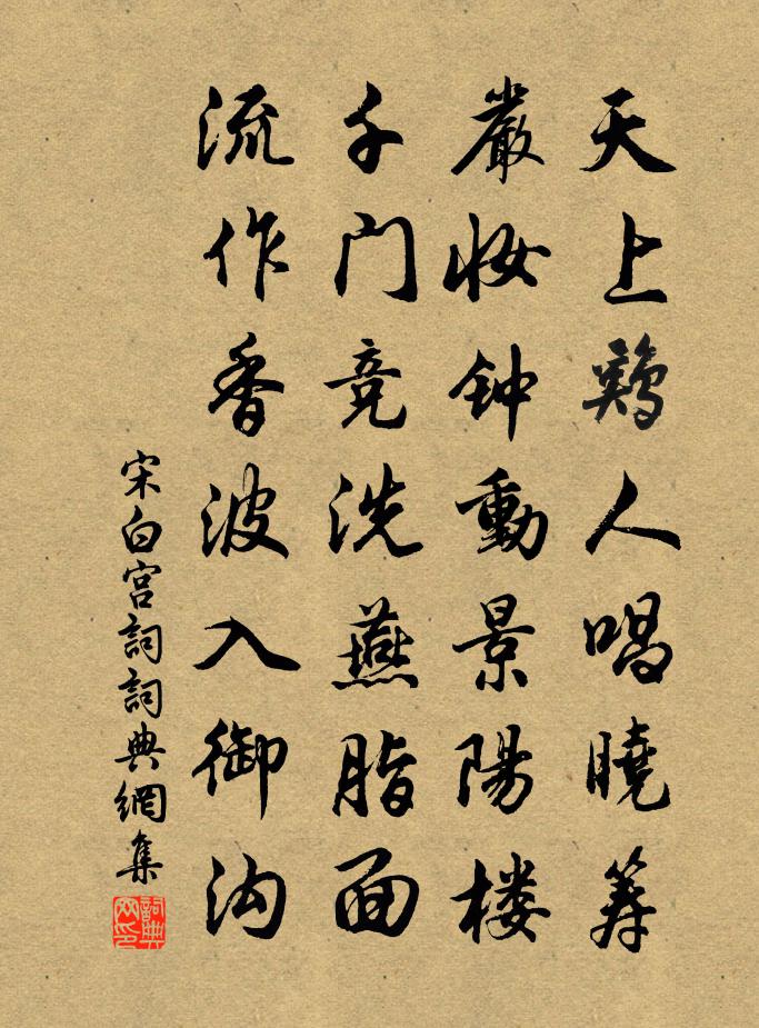 詩詞名句歷史字典書法欣賞書法字典國語詞典說文解字康熙字典古漢語字典標 題 作 者 詩 句 宮詞作者:宋白 朝代:宋代宮詞原文天上雞人唱曉籌,嚴妝鍾動景陽樓。千門競洗燕脂面,流作香波入御溝。詩詞問答問:宮詞的作者是誰?答:宋白問:宮詞寫於哪個朝代?答:宋代宋白宮詞書法欣賞宮詞書法作品詩詞推薦謁岳王墓袁枚〔清代〕江山也要偉人扶,神化丹青即畫圖。賴有岳於雙少保,人間才覺重西湖。柳梢青 右和盛開九思〔元代〕翠苔輕搭。南枝逗暖,乍收漸霎。亂插繁花,快張華宴,繞衣千匝。玉堂無限風流,但只欠、些兒雪壓。任選一枝村居陸游〔宋代〕自笑觸藩羝,人嘲失旦雞。囊慳衣任短,山冷屋便低。宦拙讒銷骨,言狂悔噬臍。自今焚筆研,有手但扶犁。句葉省乾〔宋代〕閒傍蒼苔數落花奉祠城西夜坐苑中即事孔武仲〔宋代〕喬林翳明星,林缺星粲然。長江闊咫尺,銀河為通川。爽氣浮襟裾,中夜不成眠。星轉轂而西,河逶迤以遷。惜此醉落魄(又賞殘梅)吳則禮〔宋代〕梅花褪雪。賞心莫使慵歡悅。大家且恁同攀折。餘蕊殘英,偏稱淡籠月。當初相見花初發。如今花謝人離缺。一年題潮陽石塔寺黃公度〔宋代〕投檄真成出瘴鄉,籃輿漸喜到僧坊。長風解事吹江雨,乞與行人五月涼。尼童何了詵從道一長老六年一忽捨去莫知所之葉適〔宋代〕一師今何去,天目萬丈雲。著我粗袈裟,對住大茅君。槐蘇軾〔宋代〕採擷殊未厭,忽然已成陰。蟬鳴看不見,鶴立赴還深。湖山十詠王希呂〔宋代〕山南山北異陰晴,雨腳垂垂日腳明。落盡桃花春事退,柔桑深處一鳩鳴。棋陳與義〔宋代〕長日無公事,閒圍李遠棋。傍觀真一笑,互勝不移時。幸未逢重霸,何妨著獻之。晴天散飛雹,驚動隔牆兒。和宋永兄春日閒居黃公度〔宋代〕負郭濃春事,高齋辟曉關。晴雲浮越嶠,芳草接荊蠻。祿薄難長飽,才微分久閒。年華兵甲里,吁駭鏡中顏。龔侯玉豹圖方回〔宋代〕龔侯之先楚兩龔,遠孫挺挺有祖風。五鼎食肉不掛意,萬卷讀書曾用功。草字隸字各神妙,古詩律詩俱豪雄。雖有虞美人陳三聘〔宋代〕飛瓊曉壓梅枝重。酒面羊羔凍。誰將縞帶逐車翻。明月秦樓昨夜、不勝寒。何須捲起重簾幕。愁怕春羅薄。玉杯持唐樂府十首崑山劉駕〔唐代〕肯時玉為寶,崑山過不得。今時玉為塵,崑山入中國。白玉尚如塵,誰肯愛金銀。寄李隱者倪瓚〔元代〕南汀新月色,照見水中蘋。便欲乘清影,緣源訪隱淪。君住鈿山湖,綠酒松花春。夢披寒雪去,疑是剡溪濱。九日巴丘楊公台上宴集李群玉〔唐代〕淒淒霜日上高台,水國秋深客思哀。萬疊銀山寒浪起,一行斜字早鴻來。誰家搗練孤城暮,何處題衣遠信回。江漢奉和觀察郎中春暮憶花言懷見寄四韻之什韋莊〔唐代〕天畔峨嵋簇簇青,楚云何處隔重扃?落花帶雪埋芳草,春雨和風濕畫屏。對酒莫辭沖暮角,望鄉誰解倚南亭?惟君春雲裴澄〔唐代〕漠漠復溶溶,乘春任所從。映林初展葉,觸石未成峰。旭日消寒翠,晴煙點淨容。霏微將似滅,深淺又如重。薄彩念奴嬌(己卯中秋和陳丈少卿韻)張元乾〔宋代〕垂虹望極,掃太虛纖翳,明河翻雪。一碧天光波萬頃,湧出廣寒宮闕。好事浮家,不辭百里,俱載如花頰。琴高雙名句推薦鈍學累功,不妨精熟顏之推《顏氏家訓·文章篇》 殘酒憶荊高,燕趙悲歌事未消。陳維崧《南鄉子·邢州道上作》 莫辭秉燭通霄坐,明日相思隔隴煙。王守仁《諸門人送至龍里道中二首》 文死諫,武死戰。曹雪芹《紅樓夢·第三十六回》 善惡同,則功臣倦。黃石公《三略·上略》 記年時、舊宿淒涼,暮煙秋雨野橋寒。吳文英《霜花腴·重陽前一日泛石湖》 折花逢驛使,寄與隴頭人。陸凱《贈范曄詩》 夫淺知之所爭者,末矣。列子及其弟子《列子·說符》 勸君莫惜金縷衣,勸君惜取少年時。杜秋娘《金縷衣》 陪都歌舞迎佳節,遙祝延安景物華。 * 《元旦口占用柳亞子懷人韻》
