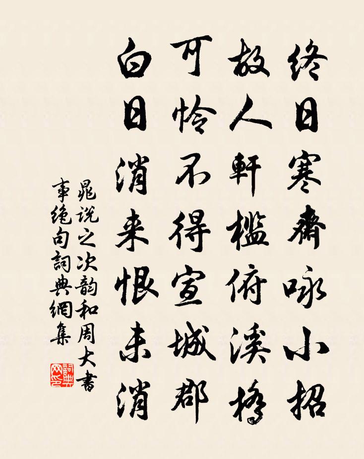 詩詞名句歷史字典書法欣賞書法字典國語詞典說文解字康熙字典古漢語字典標 題 作 者 詩 句 次韻和周大書事絕句作者:晁說之 朝代:宋代次韻和周大書事絕句原文終日寒齋詠小招,故人軒檻俯溪橋。可憐不得宣城郡,白日消來恨未消。詩詞問答問:次韻和周大書事絕句的作者是誰?答:晁說之問:次韻和周大書事絕句寫於哪個朝代?答:宋代晁說之次韻和周大書事絕句書法欣賞次韻和周大書事絕句書法作品詩詞推薦寒夜吟陸游〔宋代〕仕宦孰不願美官,無如兩膊聳聳寒。可憐誤信紙上語,至死功名心未闌。骯髒得倚門,矍櫟猶據鞍,何如百年中,閏月晦日強至〔宋代〕乾坤一傳舍,日月兩征輪。邂逅逢餘閏,連綿送晚春。巢邊迎燕熟,枝上數花頻。漸暖茅檐日,吾將理葛巾。南鄉子佚名〔宋代〕把酒祝江梅。春到南枝早早開。人在隴頭凝望久,徘徊。驛使如今尚未來。寄語莫相催。直待東風細剪裁。只恐未天竺訪明上座戴復古〔宋代〕顧影良堪笑,胡為八尺長。蒼顏抗塵土,餓喙說興亡。竹雨先秋爽,松風生夜涼。愛尋湖上寺,留宿贊公房。宿嚴維宅送包佶(一作皇甫冉詩)劉長卿〔唐代〕江湖同避地,分首自依依。盡室今為客,驚秋空念歸。歲儲無別墅,寒服羨鄰機。草色村橋晚,蟬聲江樹稀。夜深御閣端午帖子夏竦〔宋代〕太官角黍迎嘉節,上聖齋居襲美祥。金闕鑒觀真緒遠,永延鴻慶庇多方。和葉宰韻題無咎齋白玉蟾〔宋代〕蝸角蠅頭既可憎,如何又問利和名。學他太古先天妙,舍取中庸一點誠。乾坤所謂日月祖,坎離乃是天地精。工夫水調歌頭·徐州中秋蘇轍〔宋代〕離別一何久,七度過中秋。去年東武今夕,明月不勝愁。豈意彭城山下,同泛清河古汴,船上載涼州。鼓吹助清賞食薺陸游〔宋代〕日日思歸飽蕨薇,春來薺美忽忘歸。傳夸真欲嫌茶苦,自笑何時得瓠肥?留題修覺山絕勝亭王之望〔宋代〕十寺幽岩萬木稠,蜀川一覽盡西州。依微遠樹低平野,散漫清江吐亂洲。老眼乍明疑峴首,歸心忽動憶槎頭。當年倫開府席上賦得詠美人名解愁盧綸〔唐代〕不敢苦相留,明知不自由。顰眉乍欲語,斂笑又低頭。舞態兼些醉,歌聲似帶羞。今朝總見也,只不解人愁。御製太皇太后輓詞四首范祖禹〔宋代〕任姒基王跡,塗莘首化風。德超千古上,治定九年中。日月無私照,乾坤不宰功。寧神登太室,永佑宋無窮。聞歌竹枝蔣吉〔唐代〕巡堤聽唱竹枝詞,正是月高風靜時。獨向東南人不會,弟兄俱在楚江湄。三山寺戲堂頭僧二首曾豐〔宋代〕晝熱催三伏,宵涼報五更。鐘鳴塵外響,犬吠世間聲。強聒蛙鳴雨,譸張鳥噪晴。黎明重睡熟,栩栩夢魂清。秋夜對月寄鳳翔范書記李頻〔唐代〕月過秋霖後,光應夜夜清。一回相憶起,幾度獨吟行。河漢東西直,山川遠近明。寸心遙往處,新有雁來聲。荷花四絕日吳龍翰〔宋代〕醉臉潮紅嬌欲眠,玉幢移影蓋嬋娟。一奩晴色開明鏡,暖熨金爐起碧煙。夜宿華藏寺張鎡〔宋代〕蒼檜陰陰未掩門,閒來吹鬢一飛蚊。香騰廣殿游雲合,燈繞長廊列宿分。般若心華方照耀,毗耶寶自何繽紛。世緣唐文權郡見前作和韻見教乃賦計三首答之程公許〔宋代〕魯國久仙去,詩偕芙蓉秋。淵淵韻金石,往往余岩丘。象賢來題輿,同聲應鳴璆。清渭發源遠,濁涇難混流。寄呂宗卿方岳〔宋代〕昔我林皋麋鹿姿,雲胡今我復來思。舟行嚴瀨多逢雨,山識吾宗少有詩。風月厭談當世事,乾坤獨與古人期。西湖元祐祀九宮貴神二首佚名〔宋代〕天上貴神,推移九宮。厥位靡常,降康則同。來集於壇,顧歆恪恭。歌以送之,飈靜旋穹。名句推薦小雨濕黃昏。重午佳辰獨掩門。李之儀《南鄉子·端午》 握手一長嘆,淚為生別滋蘇武《留別妻》 空山不見人,但聞人語響。王維《鹿柴》 願為西南風,長逝入君懷。曹植《七哀詩》 人之敵,非奸亦奸;人之友,其奸亦忠。來俊臣《羅織經·察奸卷第八》 世業事黃老,妙年孤隱淪宋之問《始安秋日》 君見惡,則群臣匿端;君見好,則群臣誣能。韓非及後人《韓非子·二柄》 江南江北愁思,分付酒螺紅方岳《水調歌頭·平山堂用東坡韻》 何處可為別,長安青綺門。李白《送裴十八圖南歸嵩山二首》 遨歡任落風前帽,促飲爭吹酒上花。宋祁《九日置酒》