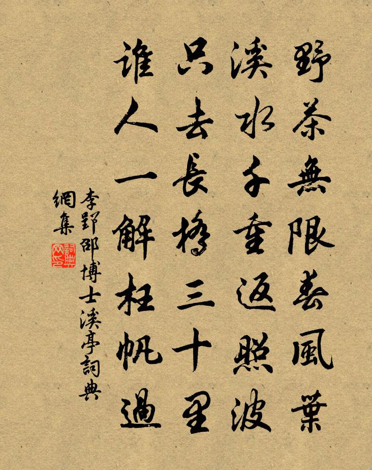 詩詞名句歷史字典書法欣賞書法字典國語詞典說文解字康熙字典古漢語字典標 題 作 者 詩 句 邵博士溪亭作者:李郢 朝代:唐代邵博士溪亭原文野茶無限春風葉,溪水千重返照波。只去長橋三十里,誰人一解枉帆過。詩詞問答問:邵博士溪亭的作者是誰?答:李郢問:邵博士溪亭寫於哪個朝代?答:唐代問:邵博士溪亭是什麼體裁?答:七絕李郢邵博士溪亭書法欣賞邵博士溪亭書法作品注釋全唐詩:卷590-57詩詞推薦不善吟邵雍〔宋代〕不良之人,稟氣非正。蛇蠍其情,豺狼其性。至良之人,稟氣清明。金玉其性,芝蘭其情。全州觀風樓陳峴〔宋代〕江源發蠻荒,來與湘灌遇。交流趨城隅,清映日東注。群山半楚越,馳驟若競赴。譙門百步南,樓堞此雄踞。觀風同薛侍御登黎陽縣樓眺黃河楊巨源〔唐代〕倚檻恣流目,高城臨大川。九回紆白浪,一半在青天。氣肅晴空外,光翻曉日邊。開襟值佳景,懷抱更悠然。景靈宮樂章皇帝降殿乾安之曲周麟之〔宋代〕我秩元祀,上推鴻源。展來有侐,祲威肅然。升墄既降,秉心益虔。荷天之休,於千萬年。別衛山齋陳深〔宋代〕何處花桃花源,花超然欲高花舉。永懷塵外游,遐契煙中侶。時從清夜闌,默探元化祖。尋幽得佳勝,將期結茅宇禱雨報恩到翟園四首楊萬里〔宋代〕霧氣初迎日腳開,春光偏傍柳邊回。寒暄訊息何人會?十拂今朝出袖來。玉堂春晏殊〔宋代〕帝城春暖。御柳暗遮空苑。海燕雙雙,拂揚簾櫳。女伴相攜、共繞林間路,折得櫻桃插髻紅。昨夜臨明微雨,新英浣溪沙 賀趙文卿新娶,文卿昆仲第六,所娶劉敏中〔元代〕共說蓮花似六郎。後來魏紫冠群芳。多情恨不一時香。也甚春風閒著意,許教國色嫁橫塘。海枯石爛兩鴛鴦。偶成雜意四首衛博〔宋代〕長松栽萬年,必在千仞巔。卑哉蓬蒿間,斥鷃無高鶱。如何一杯水,活此橫海鱣。誰能激滄溟,為子摶青天。鄧慎思學士輓詞張耒〔宋代〕青衫獻賦逢知己,白首耽書還誤身。名著道山傳故事,政行兩郡泣遺民。文成典午群疑泮,詩和少陵佳句新。嘆息花石詩十一章鄧肅〔宋代〕蔽江載石巧玲瓏,雨過嶙峋萬玉峰。艫尾相銜貢天子,坐移蓬島到深宮。丙子丁丑年避難南山之西坑今春投北山兩雪竇陳著〔宋代〕西坑曾避難,今又一西坑。十有四年夢,兩番多事驚。天乎存老息,地亦定前名。何動不關命,怡然心氣平。夏日陸游〔宋代〕赫赫炎威日正中,冰紈笛簟欲無功。一心愿伴沙頭鷺,百計難呼木杪風。縴手削瓜刀似水,小甖分酒盞如空。洗心送明甫赴銅鉛場六言七首劉克莊〔宋代〕出程行店絕少,官捨去家匪遙。吾聞粉□□□,□□紅巾已梟。尹館作此覓酒召李順之飲陳東〔宋代〕今日天色惡,酒壺恰已空。何來進童子,挈榼問主翁。主翁正對客,兀坐書堂中。諸生功課畢,鼓瑟歌醉翁。愛酒南劍州伏虎岩請師開山請贊釋慧開〔宋代〕個樣村僧,也甚奇怪。身如椰子,膽似天大。蟒蛇窟里安禪,猛虎穴中劄寨。無端於微塵國里,轉 * ,聲 * 殘花(一作於鄴詩)韋莊〔唐代〕和煙和露雪離披,金蕊紅須尚滿枝。答許景亮賀鑄〔宋代〕東嘉海上孕瓌怪,之子人英晦當代。發之辭章聊一噫,雷鼓霜鍾警聾聵。投吾夜光敢不拜,相期過高幸少殺。君家學射山相傳蜀後主劉禪習射於此因以得名有感何耕〔宋代〕修明國政保關山,豈在馳驅縱送間。空使流人登劍閣,向風長喟笑慵孱。秋興和沖卿王安石〔宋代〕雲浮朝慘澹,風起夜颼颼。欲作冰霜地,先回草樹秋。征人倚笛怨,思婦向砧愁。為問隨陽雁,哀鳴豈有求。名句推薦強欲登高去,無人送酒來。岑參《行軍九日思長安故園》 織婦何太忙,蠶經三臥行欲老。元稹《織婦詞》 天涯靜處無征戰,兵氣銷為日月光。常建《塞下曲四首·其一》 山際見來煙,竹中窺落日。吳均《山中雜詩》 我非生而知之者,好古,敏以求之者也。孔子弟子《論語·述而篇》 王母歡闌瓊宴罷,仙人淚滿金盤側。文天祥《滿江紅·代王夫人作》 反水不收,後悔無及。范曄《後漢書·本紀·光武帝紀上》 語言多矯飾,則人品心術,盡屬可疑。王永彬《圍爐夜話·第四十則》 高節志凌雲,不敢當滕六。環山樵《薛寶釵·雪竹》 夫孝,天之經也,地之義也,民之行也。孔子及其弟子《孝經·三才》