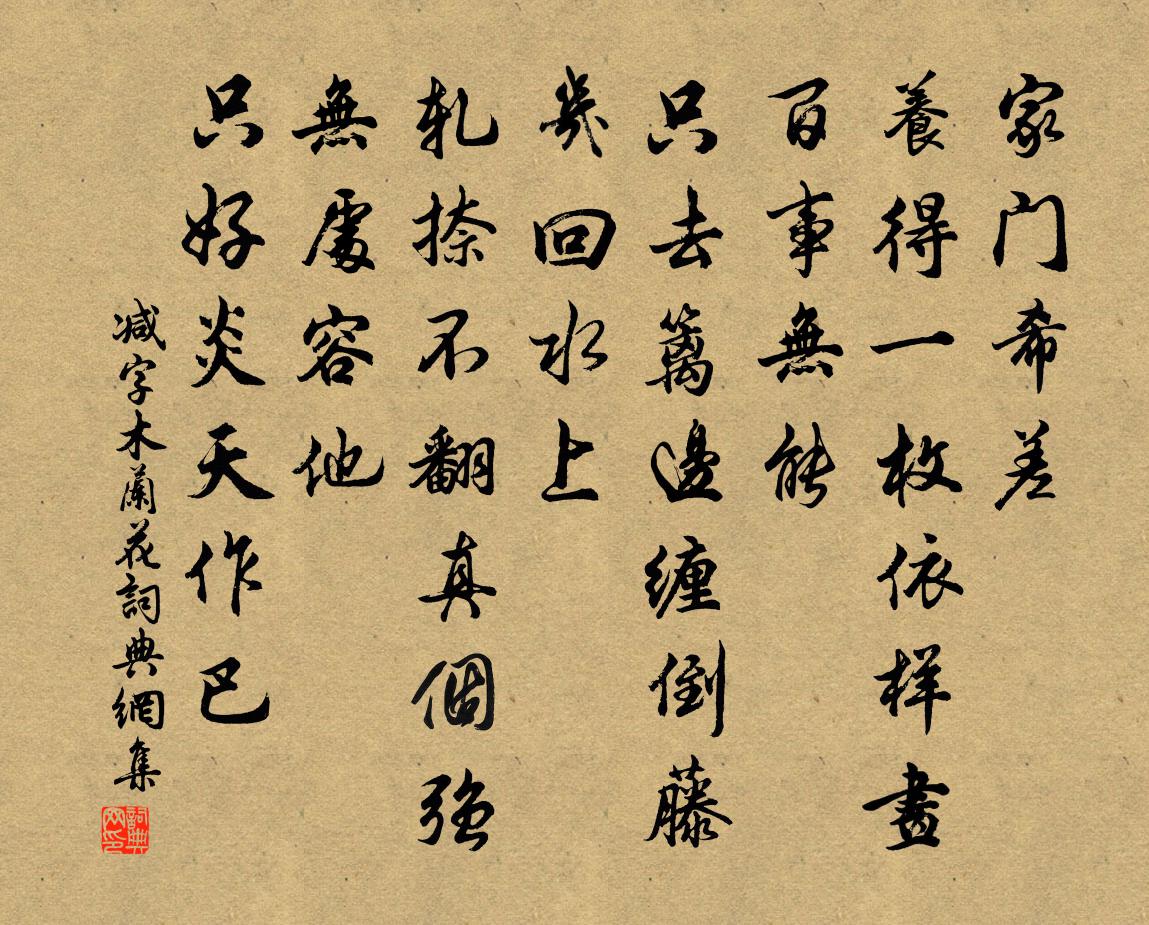 詩詞名句歷史字典書法欣賞書法字典國語詞典說文解字康熙字典古漢語字典標 題 作 者 詩 句 減字木蘭花作者:佚名 朝代:宋代減字木蘭花原文家門希差。養得一枚依樣畫。百事無能。只去籬邊纏倒藤。幾回水上。軋捺不翻真箇強。無處容他。只好炎天作巴。詩詞問答問:減字木蘭花的作者是誰?答:佚名問:減字木蘭花寫於哪個朝代?答:宋代問:減字木蘭花是什麼體裁?答:詞問:佚名的名句有哪些?答:佚名名句大全佚名減字木蘭花書法欣賞減字木蘭花書法作品詩詞推薦憶江南弟孟郊〔唐代〕白首眼垂血,望爾唯夢中。筋力強起時,魂魄猶在東。眼光寄明星,起來東望空。望空不見人,江海波無窮。衰老薦冰盧鈞〔唐代〕薦冰朝日後,辟廟曉光清。不改晶熒質,能彰雨露情。且無霜共潔,豈與水均明。在捧搖寒色,當呈表素誠。凝姿春暮方岳〔宋代〕人生會有百年極,春事略無三日晴。豈惟坐隔海棠醉,亦未曾逐楊花行。綠樹陰陰遽如許。黃鳥飛飛寂無語。先生蘇台曲楊維楨〔元代〕吳王張高宴,台下閱犀兵。高台三百里,不見越王城。和清明上冢韻王夢應〔宋代〕酒壺花擔發雙明,陌上攜扶笑語聲。桑葉影稠春欲暗,楝花寒退雨初晴。宮官記夢曾傳燭,□客無詩定罰觥。老影逢賈老鄭獬〔宋代〕買得虛名東路歸,自憐鷗鳥本忘機。吾師不用苦迎送,亦是當時一布衣。遊仙詞三十三首王鎡〔宋代〕紫雲繚繞玉城開,張許真人入奏台。大帝正答雷雨事,寶函捧出又回來。和十二兄五首晃沖之〔宋代〕我家溱洧間,春水色如酒。嵩少在吾旁,日夕意亦厚。田園雖不廣,幽興隨事有。藥畦灌陳根,芋區采駢首。春郊荊州新秋病起雜題一十五首病起見王化齊己〔唐代〕病起見王化,融融古帝鄉。曉煙凝氣紫,晚色作雲黃。四野歌豐稔,千門唱樂康。老身仍未死,猶詠好風光。聞笛陸游〔宋代〕雪飛數片又成晴,透瓦清霜伴月明。一曲忽聞高士笛,臨窗和以讀書聲。佛池口遇風雨蘇轍〔宋代〕長江五月多風暴,欲行先看風日好。此風忽作東南來,陰雲如涌撥不開。驚雷往還轉車轂,狂波低昂起坑谷。中流秦王飲酒李賀〔唐代〕秦王騎虎游八極,劍光照空天自碧。羲和敲日玻璃聲,劫灰飛盡古今平。龍頭瀉酒邀酒星,金槽琵琶夜棖棖。洞庭次韻子瞻潁州留別二首蘇轍〔宋代〕放舟清淮上,盪潏洗心胸。所遇日轉勝,恨我不得同。江淮忽中斷,陂埭何重重。紫蟹三寸筐,白鳧五尺童。赤鯉春日陳與義〔宋代〕憶看梅雪縞中庭,轉眼桃梢無數青。萬事一身雙鬢髮,竹床欹臥數窗欞。訴衷情(因見早梅作)丘崈〔宋代〕十分風味似詩人。有些子太清生。只應最嫌俗子,消瘦卻盈盈。風乍靜,雪初晴。月微明。泊然疏淡,莫是無情,山口阻風李流謙〔宋代〕舟行常有性命憂,江風一動令人愁。盤渦倒帆日方午,又作賈胡終日留。淮山隔江看細小,淡掃修收晚尤好。岷峨送丁子章將漕湖南三首楊萬里〔宋代〕半世行天下,同心寡友生。故人今又去,此意向誰傾。白髮三更語,青燈一點明,看渠還玉署。老我正歸耕。寄興化黃主簿杞賀鑄〔宋代〕何準第五不足稱,黃童無雙非自名。卑棲鸞鳳安初仕,葆練龍虎希長生。明月高吟紫芝曲,紅塵先老白雲兄。莫辭莫溪驛王安石〔宋代〕缺月昏昏漏未央,一燈明滅照秋床。病身最覺風露早,歸夢不知山水長。坐感歲時歌慷慨,起看天地色淒涼。鳴蟬瑣窗寒張炎〔宋代〕絕響矣。余悼之玉笥山,所謂長歌之哀,過於痛哭。斷碧分山,空簾剩月,故人天外。香留酒殢。蝴蝶一生花里。名句推薦想當年,金戈鐵馬,氣吞萬里如虎。辛棄疾《永遇樂·京口北固亭懷古》 對瀟瀟暮雨灑江天,一番洗清秋。柳永《八聲甘州·對瀟瀟暮雨灑江天》 沅有芷兮澧有蘭,思公子兮未敢言。屈原《九歌·湘夫人》 北斗七星高,哥舒夜帶刀。西鄙人《哥舒歌》 單于北望拂雲堆,殺馬登壇祭幾回。王之渙《涼州詞二首》 歲夜高堂列明燭,美酒一杯聲一曲。李頎《聽安萬善吹觱篥歌》 千載琵琶作胡語,分明怨恨曲中論。杜甫《詠懷古蹟五首·其三》 秋色從西來,蒼然滿關中。岑參《與高適薛據同登慈恩寺浮圖》 無人知此意,歌罷滿簾風。陳與義《臨江仙·高詠楚詞酬午日》 關山多雨雪,風水損毛衣。李遠《詠雁》