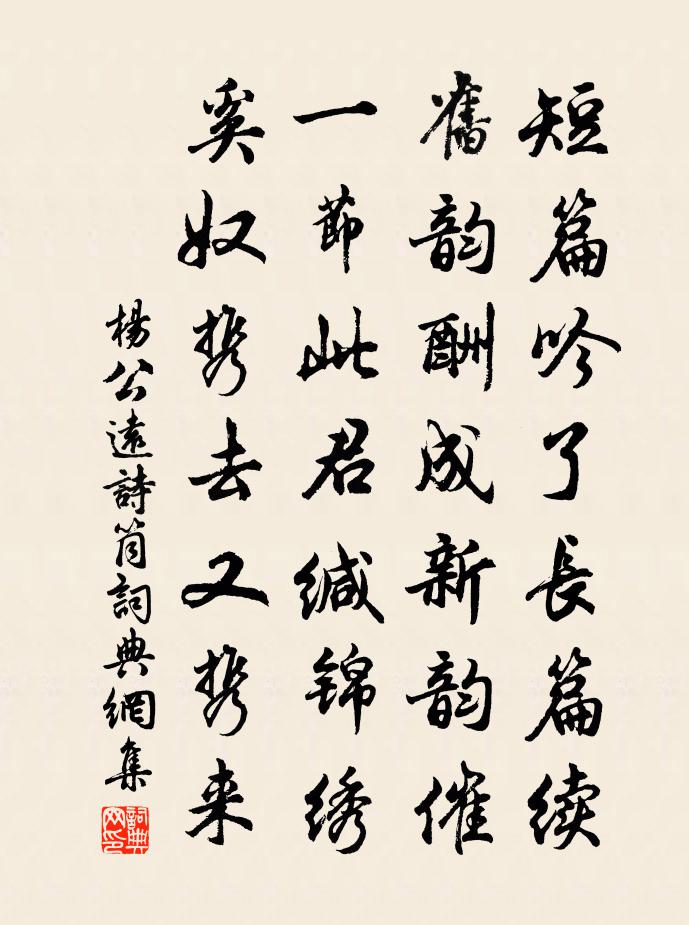 詩詞名句歷史字典書法欣賞書法字典國語詞典說文解字康熙字典古漢語字典標 題 作 者 詩 句 詩筒作者:楊公遠 朝代:宋代詩筒原文短篇吟了長篇續,舊韻酬成新韻催。一節此君緘錦繡,奚奴攜去又攜來。詩詞問答問:詩筒的作者是誰?答:楊公遠問:詩筒寫於哪個朝代?答:宋代楊公遠詩筒書法欣賞詩筒書法作品詩詞推薦詩匠楊公遠〔宋代〕吳剛運惟修月,輪扁揮斤妙斲輪。好句何須勞斧鑿,無痕無跡自天真。漢宮春康與之〔宋代〕雲海沈沈,峭寒收建章。雪殘鳷鵲。華燈照夜,萬井禁城行樂。春隨鬢影,映參差、柳絲梅萼。丹禁杳,鰲峰對聳題李太白墓梅之煥〔元代〕採石江邊一堆土,李白之名高千古。來來往往一首詩,魯班門前弄大斧。簡正字南仲周文璞〔宋代〕白髮梁鴻隨暮猿,不辭引領望兄門。久無清夢相追逐,今喜遺經為討論。數葉赤楓鳴客路,一畦黃薤憶家園。著書相和歌辭。蜀道難張文琮〔唐代〕梁山鎮地險,積石阻雲端。深谷下寥廓,層岩上郁盤。飛梁架絕嶺,棧道接危巒。攬轡獨長息,方知斯路難。過山受獎王諶〔宋代〕此地知誰隱,當門列翠屏。栽花多是藥,題壁半書經。栗鼠咀紅果,山禽墮翠翎。峰頭宜眺望,只欠小茅亭。王勃故事宋祁〔宋代〕九月九日都督大宴滕王閣,宿命其婿作序以夸客,因出紙筆遍請客,莫敢當,至勃,泛然不辭。都督怒,起更衣,贊豐乾釋法薰〔宋代〕走松門,尋寒拾。虎斑易見,人斑難識。識不識,惡聲惡跡成狼藉。偈頌四十一首釋慧暉〔宋代〕花月今朝朔旭前,桂輪普轉滿天邊。枝花馥郁清香在,烏鵲從來同夜蟾。奉答雅均途中見寄二首強至〔宋代〕貧固誠吾分,廉斯亦士常。漫多愚執守,愧少子文章。雖幸相逢近,猶嗟此別長。何時卻南轡,重把論詩觴。句佚名〔宋代〕社近記穿黃增子,雨前趲摘紫槍旗。簡王元宗趙蕃〔宋代〕相望兩招提,林深路不迷。微軀敢高臥,借屋且幽棲。問訊聊題句,經過阻杖藜。良由日日雨,山徑亦成泥。和王仲儀詠癭二十韻梅堯臣〔宋代〕汝水出山險,汝民多病癭。或如雞精滿,或若猿嗛並。女慚高掩襟,男大闊裁領。飲水擬注壺,吐詞侔有鯁。樗里寄中山隱講師張憲〔元代〕問訊山中隱,中山第幾重?風廊巡夜虎,雲缽聽經龍。流水千溪月,寒岩一樹松。無因淨渣滓,來共上堂鍾。白廬山歸城賦四首董嗣杲〔宋代〕才去還回似不情,蕭然兩耳亂泉聲。衣巾染得江嵐透,誰道山人骨亦清。秋懷十首陳師道〔宋代〕潭潭明光殿,稽首西方僊。平生修何行,步有黃金蓮。我豈昔好徑,報以履下穿。洗足坐道場,卒卒此何緣。秋雨嘆游九言〔宋代〕戊午七月陰氣寒,重雲低濕天漫漫。高檐流瀉下檐溢,旅人愁絕居人冤。市井滂沱豈足計,老農涕泣猶辛酸。兩年次羅梅谷詩畫總觀楊公遠〔宋代〕梅谷梅應占作魁,不論時節遣花開。傳真舊說華光老,詩到林逋俱壓倒。華光去後誰逼真,補之筆底生陽春。月香跋李少裴修禊序樓鑰〔宋代〕蘭亭修禊就和中,群賢高會俱雍容。右軍作序亦寓耳,藁草乃致傳無窮。自言疑若有神助,他日屢書終不同。歷代減字木蘭花韋驤〔宋代〕人生可意。祗說功名貪富貴。遇景開懷。且盡生前有限杯。韶華幾許。鵜鴂聲殘無覓處。莫自因循。一片段預告飛減卻名句推薦昔日橫波目,今成流淚泉。李白《長相思三首·其二》 無言獨上西樓,月如鉤。寂寞梧桐深院鎖清秋。李煜《相見歡·無言獨上西樓》 微微風簇浪,散作滿河星。查慎行《舟夜書所見》 草木行列,煙消日出。蘇轍《黃州快哉亭記》 禍之所由生也,生自纖纖也。荀子《荀子·大略》 非我而當者,吾師也;是我而當者,吾友也。荀子《荀子·修身》 玉骨那愁瘴霧,冰姿自有仙風。蘇軾《西江月·梅花》 銀箭金壺漏水多,起看秋月墜江波。李白《烏棲曲》 屋漏在上,知者在下。王充《論衡·卷十一·答佞篇》 教民禮順,莫善於悌。孔子及其弟子《孝經·廣要道》