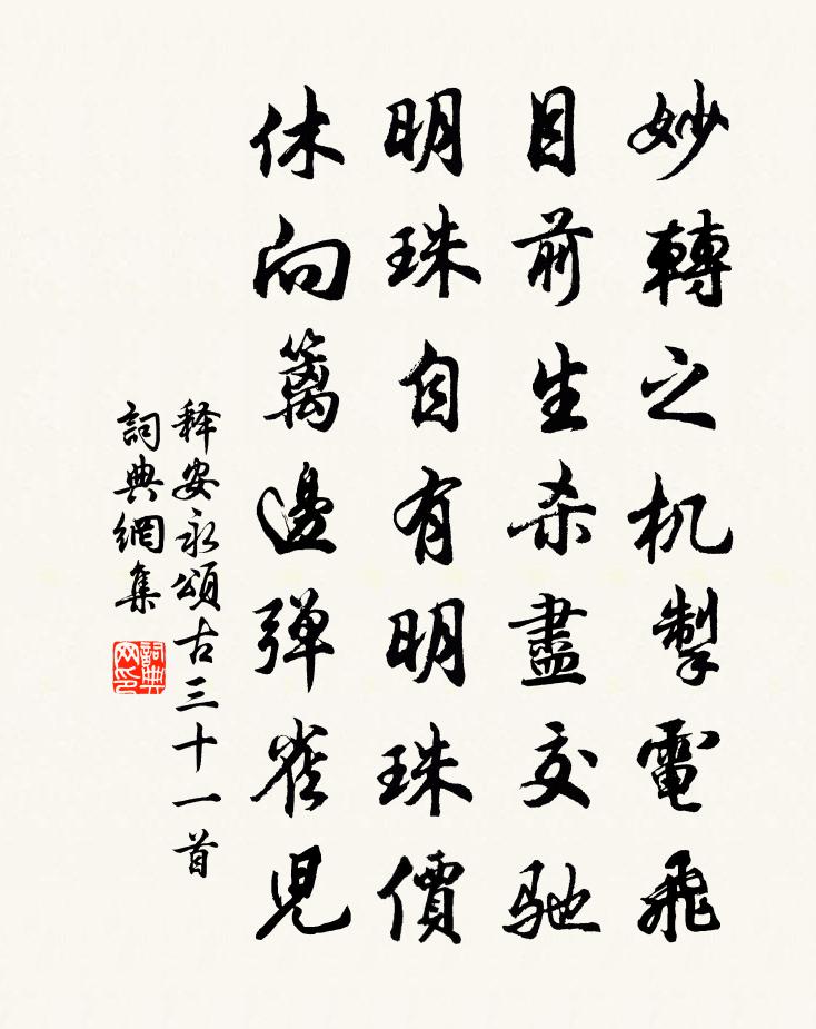 詩詞名句歷史字典書法欣賞書法字典國語詞典說文解字康熙字典古漢語字典標 題 作 者 詩 句 頌古三十一首作者:釋安永 朝代:宋代頌古三十一首原文妙轉之機掣電飛,目前生殺盡交馳。明珠自有明珠價,休向籬邊彈雀兒。詩詞問答問:頌古三十一首的作者是誰?答:釋安永問:頌古三十一首寫於哪個朝代?答:宋代釋安永頌古三十一首書法欣賞頌古三十一首書法作品詩詞推薦過吳江徐僑〔宋代〕北風獵獵送吾船,夜過吳江炯不眠。月色微明天覆水,倚看銀浪欲無邊。和董判官寺居作陳師道〔宋代〕共作東州客,同棲古寺深。論交非有舊,不見解相尋。冷過清明節,悲生故國心。此身隨所寄,未足問升沉。和子厚弟春日見寄三首王之道〔宋代〕睡起晴窗正憶渠,老兵聲喏到前除。新詩價重連城璧,便覺貧家富不虛。九月曾豐〔宋代〕九月庚庚,金風{外風內黃}{外風內黃}。菊之有之,強名金精。九月庚庚,玉露泠泠。菊之有之,強名玉英。楊梅徐似道〔宋代〕火齊無光荔實圓,未覺先說齒流涎。喚回天竺三年夢,參透披雲一味禪。蘄口道中三首王令〔宋代〕稍稍江上雨,聲入窗壁寒。悄悄舟中人,曲肘自枕眠。安臥不成寐,起坐浩長嘆。離家日逾百,行路忽已千。昔與送趙一叔江西漕赴召代成父作二首趙蕃〔宋代〕憶昨公持使節西,迎公曾渡石田溪。今公復因召節至,送公亦渡石田水。公今西來又東去,送迎車馬紛無數。我雖集周公處連句詩庾信〔南北朝〕市朝一朝變。蘭艾本同焚。故人相借問。平生如所聞。試院九日次王茂材丞公韻兼呈翁沂伯廣文喻良能〔宋代〕秋杪仍新霽,天涯憶故鄉。少陵三坐客,太白兩重陽。深院日復日,寒花黃未黃。昔年吹帽飲,今日讀書床。襄陽樂蘇軾〔宋代〕使君未來襄陽愁,提戈入市裹氈裘。自從氈裘南渡沔,襄陽無事多春遊。襄陽春遊樂何許。峴山之陽漢江浦。使君綿州官池贈別同賦灣字盧照鄰〔唐代〕輶軒遵上國,仙佩下靈關。尊酒方無地,聯綣喜暫攀。離言欲贈策,高辨正連環。野徑浮雲斷,荒池春草斑。殘花宿灌頭華岳〔宋代〕淡魚才煮鹹魚熟。白酒新篘紅酒香。假樂佚名〔先秦〕假樂君子,顯顯令德,宜民宜人。受祿於天,保右命之,自天申之。千祿百福,子孫千億。穆穆皇皇,宜君宜王。閉居五詠其一杜門蘇轍〔宋代〕可憐杜門久,不覺杜門非。床銳日日銷,髀肉年年肥。眼暗書罷讀,肺病酒亦稀。經年客不至,不冠仍不衣。視聽得壽仁、壽俊二子中塗家書三首楊萬里〔宋代〕我昔如汝長,壯志在四方。集賢給筆札,秉燭促夜裝。平明出門去,振衣不傍徨。先君泫然泣,感我令我傷。先君晚步江上陸游〔宋代〕萬里橋邊帶夕陽,隔江漁市似清湘。山林獨往吾何恨,車馬交流渠自忙。高柳陰中扶拄杖,平沙穩處據胡床。故人黎明府見示令叔顯謨開國墓誌求詩為賦三首戴復古〔宋代〕寄家苕霅上,萬里故鄉愁。未入金門奏,還為玉局游。孤忠徒耿耿,一病竟休休。為國惜人物,悽然老淚流。送呂寺丞韓維〔宋代〕古有從軍樂,人今衣彩行。春風騏驥健,朝日鳳凰鳴。樹遠秦中道,花繁塞下城。篇章聞舊俗,當為放遺聲。題儀真常平倉壁劉宰〔宋代〕苦被微官縛此身,汗衣亭午亞紅塵。維舟醉臥垂楊下,輸與江湖自在人。南堂新甃花壇二首蘇轍〔宋代〕亂竹侵紅藥,病花羞晚春。移根近談笑,得土長精神。榮悴非由爾,芬芳止為人。庭西井泉好,汲灌每躬親。名句推薦鬧花深處層樓,畫簾半卷東風軟。陳亮《水龍吟·春恨》 空將漢月出宮門,憶君清淚如鉛水。李賀《金銅仙人辭漢歌》 一去無訊息,那能惜馬蹄。薛道衡《昔昔鹽》 梨花最晚又凋零,何事歸期無定準。歐陽修《玉樓春·去時梅萼初凝粉》 宦情羈思共淒淒,春半如秋意轉迷柳宗元《柳州二月榕葉落盡偶題》 竭澤而漁,豈不獲得?而明年無魚;焚藪而田,豈不獲得?而明年無獸。呂不韋《呂氏春秋·覽·孝行覽》 江海之所以能為百穀王者,以其善下之,故能為百穀王。老子《老子·德經·第六十六章》 酒闌歌罷玉尊空,青缸暗明滅。李清照《好事近·風定落花深》 黃衫飛白馬,日日青樓下。陳克《菩薩蠻·赤闌橋盡香街直》 一夜東風,枕邊吹散愁多少。曾允元《點絳唇·一夜東風》