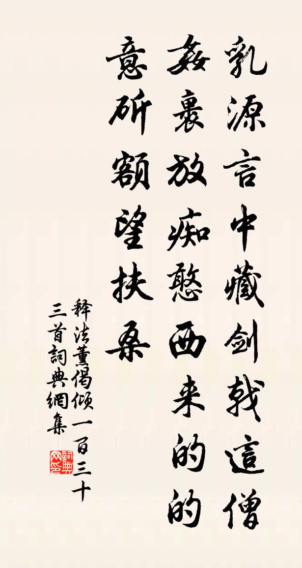 詩詞名句歷史字典書法欣賞書法字典國語詞典說文解字康熙字典古漢語字典標 題 作 者 詩 句 偈傾一百三十三首作者:釋法薰 朝代:宋代偈傾一百三十三首原文乳源言中藏劍戟,這僧奸裹放痴憨。西來的的意,斫額望扶桑。詩詞問答問:偈傾一百三十三首的作者是誰?答:釋法薰問:偈傾一百三十三首寫於哪個朝代?答:宋代釋法薰偈傾一百三十三首書法欣賞偈傾一百三十三首書法作品詩詞推薦偈頌一百二十三首釋普度〔宋代〕說禪說道易,成佛作祖難,突出門前大案山。成佛作祖易,說禪說道難,南海波斯念八還。也不難,也不易,衲僧長城於濆〔唐代〕秦皇豈無德,蒙氏非不武。豈將版築功,萬里遮胡虜。團沙世所難,作壘明知苦。死者倍堪傷,殭屍猶抱杵。十年山中雜興 其六王冕〔元代〕漂泊殊無定,歸來得暫安。不嫌知己少,似覺傍人難。梅屋春風細,松窗夜月寒。交遊成契闊,重檢舊書看。邵武趙使君挽章二首曹彥約〔宋代〕近代金枝里,何人桂籍傳。衣孫三世盛,文武兩科全。日月開宏業,山川哭盛年。天高無可問,有德在民編。偶見仇遠〔宋代〕詩囊劍術走風塵,要買桑麻二頃春。可笑田連阡陌者,元非識字讀書人。瑞鶴仙曾覿〔宋代〕陡寒生翠幕。凍雲垂,繽紛飛雪初落。縈風度池閣。裊餘妍,時趁舞腰纖弱。江天漠漠。認殘梅、吹散畫角。正貂明德皇太后輓歌詞五首楊億〔宋代〕外族長安盛,尊名永樂崇。初陵淒草露,舊殿閴椒風。鞏樹迷凶仗,周原掩壽宮。聖君悲望處,淚雨泣重瞳。書懷李頻〔唐代〕宦途從不問,身事覺無差。華發初生女,滄洲未有家。卻閒思洞穴,終老曠桑麻。別訪棲禪侶,相期語劫沙。西湖獨步沈說〔宋代〕平湖開霽色,寒碧照空心。小立背橋影,緩行隨柳陰。向年勞遠夢,到日記曾吟。荷盪成茭地,蕭蕭秋意深。清平樂(代宰執勸趙丞相酒)史浩〔宋代〕槐庭元老。四海真師表。曲為故人敦久要。隔巷不嫌時到。虛堂已入涼颸。一觥為壽何辭。看即關河恢復,千秋永賦房玄齡李世民〔唐代〕太液仙舟迥,西園隱上才。未曉徵車度,雞鳴關早開。張丞見和次韻答之陳造〔宋代〕我本山林人,娛老有日用。時須禽一戲,暇乃笛三弄。言償作縣責,顧敢寶所重。催科未妨拙,防速牙角訟。三月十日流杯亭李商隱〔唐代〕身屬中軍少得歸,木蘭花盡失春期。偷隨柳絮到城外,行過水西聞子規。春貼子詞皇帝閣六首司馬光〔宋代〕漠然天造與時新,根著浮沁一氣均。萬物不須彫刻巧。正如恭已布深仁。頌古四十五首釋慧遠〔宋代〕門外雨滴聲,家和萬事成。歸來無一物,令人憶鏡清。宿直里店二首劉宰〔宋代〕扁舟泛泛逐驚湍,朔吹飈飈作曉寒。艤棹遠來投野店,應門幸喜得儒冠。送制機豐德馨赴堂召二首李曾伯〔宋代〕奇章昔送牧之行,舊事今親見廣陵。一叟棲棲嗟孑立,諸賢袞袞慶偕升。事來推與參前著,公去吾其失右肱。我俟對棋與道源至草堂寺王安石〔宋代〕北風吹人不可出,清坐且可與君棋。明朝投局日未晚,從此亦復不吟詩。憂華岳〔宋代〕憂吾所謂果何憂,憂國憂家卒未休。坐法馬遷方去漢,釋囚箕子未歸周。西風萬籟聲聲恨,夜雨疏桐點點愁。有客海棠塢趙蕃〔宋代〕嘗喔坡老詩,未識柯山塢。想像亦好園,規摹自渠取。名句推薦雨中山果落,燈下草蟲鳴。王維《秋夜獨坐 / 冬夜書懷》 葉潤林塘密,衣乾枕席清。杜甫《水檻遣心二首》 攜扙來追柳外涼,畫橋南畔倚胡床。秦觀《納涼》 無論作何等人,總不可有勢利氣王永彬《圍爐夜話·第三五則》 倉無備粟,不可以待凶飢。墨子《墨子·05章 七患》 涼葉蕭蕭散雨聲,虛堂淅淅掩霜清。元好問《秋懷》 得十良馬,不若得一伯樂;得十良劍,不若得一歐冶;得地千里,不若得一聖人。呂不韋《呂氏春秋·論·不苟論》 玉輪碾平芳草,半面惱紅妝。陳子龍《訴衷情·春遊》 世界微塵里,吾寧愛與憎。李商隱《北青蘿》 入世冷挑紅雪去,離塵香割紫雲來。曹雪芹《訪妙玉乞紅梅》