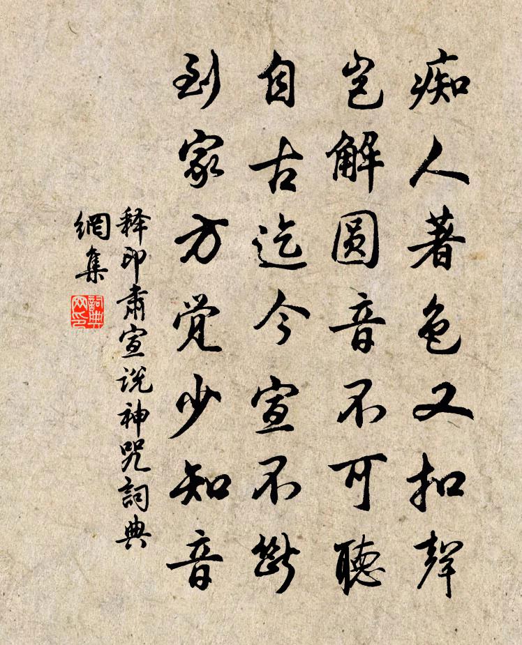 詩詞名句歷史字典書法欣賞書法字典國語詞典說文解字康熙字典古漢語字典標 題 作 者 詩 句 宣說神咒作者:釋印肅 朝代:宋代宣說神咒原文痴人著色又扣聲,豈解圓音不可聽。自古迄今宣不斷,到家方覺少知音。詩詞問答問:宣說神咒的作者是誰?答:釋印肅問:宣說神咒寫於哪個朝代?答:宋代釋印肅宣說神咒書法欣賞宣說神咒書法作品詩詞推薦周祀圜丘歌 皇夏庾信〔南北朝〕七里是仰。八陛有憑。就陽之位。如日之升。思虔肅肅。致敬繩繩。祝史陳信。玄象斯格。惟類之典。惟靈之澤。魚蝦相望張耒〔宋代〕悲歡回首兩茫然,憶別龍門又半年。應是舊時歌舞處,和風開凍一層天。隔浦蓮近拍陳允平〔宋代〕鉛霜初褪鳳葆。碧旆侵雲窈。萬綠傷春遠,林幽樂、多禽鳥。斜陽堤畔草。游魚鬧。暗水流萍沼。翠鈿小。涼亭醉大雪三絕句蘇轍〔宋代〕玄冥留雪付勾芒,桃李雖憂麥未傷。膏澤較遲三十日,問天此意亦茫茫。送福建李大夫薛能〔唐代〕洛州良牧帥甌閩,曾是西垣作諫臣。紅旆已勝前尹正,尺書猶帶舊絲綸。秋來海有幽都雁,船到城添外國人。行過壽應茶馬李曾伯〔宋代〕太微一宿燭魚鳧,已奏平反課轉輸。綠碾雨前舒鳳爪,青鎌雪外長龍顱。班崇東壁圖書府,惠暢西夷道德塗。佇佐驀山溪 退食感懷王寂〔元代〕山城塊坐,空*朋儕影。撾鼓放衙休,悄無人、日長門靜。折腰五斗,所得不償勞,松暗老,菊都荒,誰為開三徑送宛句趙少府張九齡〔唐代〕解巾行作吏,尊酒謝離居。修竹含清景,華池澹碧虛。地將幽興愜,人與舊遊疏。林下紛相送,多逢長者車。胡宗偉罷官改秩,舉將不及格,往謁金陵丹陽范成大〔宋代〕凍雲埋山天冥濛,北風無情雪塞空。道傍人稀鳥飛絕,問君東遊何匆匆?君言薄官淡無味,免俗未能聊復爾。我評題曹坑鋪李公明〔宋代〕明星落深水,晚電起孤雲。去去風前棹,迢迢竹外村。山回依草驛,岸落出蘆根。親月照人冷,今宵清夢魂。再和項安世〔宋代〕聖處耘耔日淺,俗間葑汙年深。蚤歲襟期何許,如今翻愧初心。送柳才僉判蔡州文同〔宋代〕翩翩河東孫,豪邁有祖德。二十補楚掾,能用口破賊。歸來入京寺,不借推挽力。驕夸固其宜,了不見顏色。題輿欣欣亭李大異〔宋代〕雨露汪洋四海春,嶺南嶺北多歸人。朝中賢士罕過此,莫惜青錢呼白鱗。淳佑七年丁未十一月朔蔡久軒自江東提刑歸抵李伯玉〔宋代〕清時琴屏臣奸琴,琴瑟大更化。四佞斥昕朝,一札頒丙夜。明庭集孔鸞,清廟薦瓊斚。堂堂西山孫,藉藉少室價。春秋戰國門郭開周曇〔唐代〕秦襲邯鄲歲月深,何人沾贈郭開金。廉頗還國李牧在,安得趙王為爾擒。偈六十九首釋道寧〔宋代〕出家佛子,物外高流。挈錫攜缸,訪尋知識。須是踏著自己穩實田地,方解茆庵石室折腳鐺兒。煮粥煎茶,接待往漁父詞(並序·其一)趙構〔宋代〕紹興元年七月十日,余至會稽,因覽黃庭堅所書張志和漁父詞十五首,戲同其韻,賜辛永宗。一湖春水夜來生。幾范蜀公輓詩李廌〔宋代〕荊舒昔未懲,抗疏誓身爭。衛鞅雖難屈,桑羊屢請烹。危言知不用,脫屣謝浮榮。豈戀三台近,全無萬世清。和虛齋勸農十詩鄭清之〔宋代〕曉夢吟成望帝歸,征鞍未許柳絲知。笑聽鄮嶺春禽哢,去博延英午漏遲。次韻程機宜感懷曹勛〔宋代〕敵疆未尋盟,天王日嘗膽。邊聲入河嶽,孤臣增百感。名句推薦庭花蒙蒙水泠泠,小兒啼索樹上鶯。貫休《春晚書山家屋壁二首》 盡人事以聽天命。李汝珍《鏡花緣·第六回》 香非在蕊,香非在萼,骨中香徹。晁補之《鹽角兒·亳社觀梅》 名無固實,約之以命實,約定俗成,謂之實名。荀子《荀子·正名》 未知生,焉知死?孔子弟子《論語·先進篇》 井灶有遺處,桑竹殘朽株。陶淵明《歸園田居·其四》 一事真,百事真。馮夢龍《醒世恆言·卷十六》 吾所以有大患者,為吾有身,及吾無身,吾有何患?老子《老子·道經·第十三章》 遨歡任落風前帽,促飲爭吹酒上花。宋祁《九日置酒》 十年種木,一年種穀,都付兒童。元好問《人月圓·重岡已隔紅塵斷》