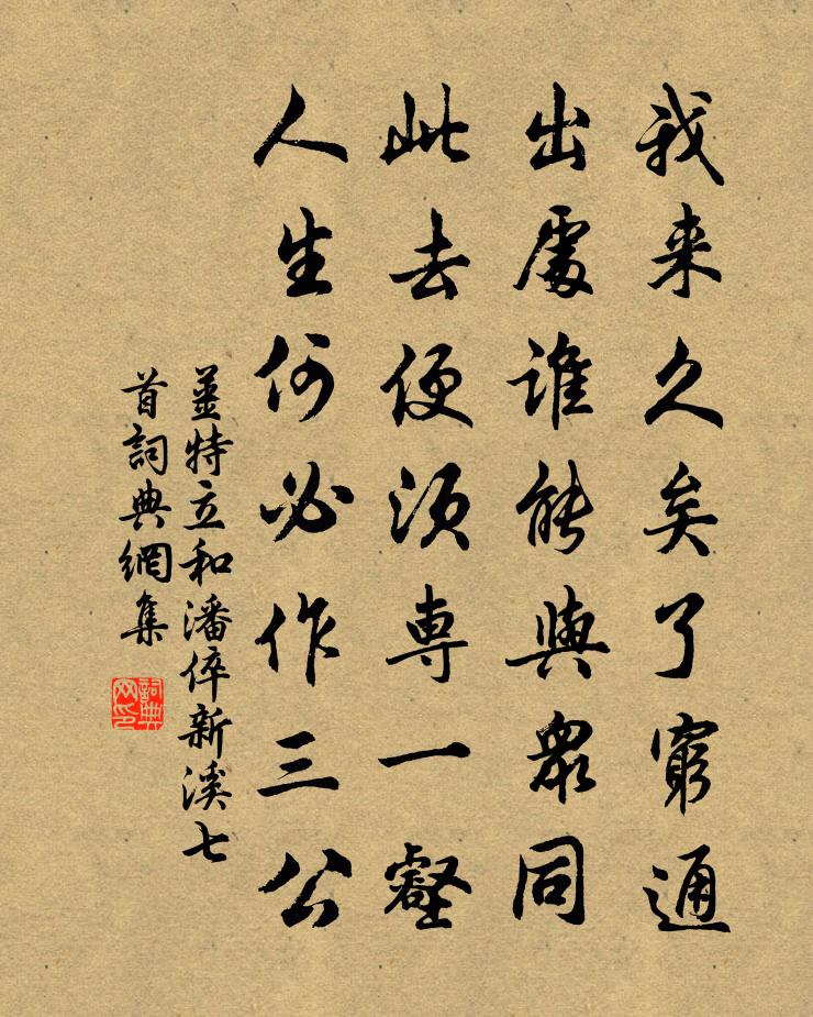 詩詞名句歷史字典書法欣賞書法字典國語詞典說文解字康熙字典古漢語字典標 題 作 者 詩 句 和潘倅新溪七首作者:姜特立 朝代:宋代和潘倅新溪七首原文我來久矣了窮通,出處誰能與眾同。此去便須專一壑,人生何必作三公。詩詞問答問:和潘倅新溪七首的作者是誰?答:姜特立問:和潘倅新溪七首寫於哪個朝代?答:宋代姜特立和潘倅新溪七首書法欣賞和潘倅新溪七首書法作品詩詞推薦次韻虞退夫除夕七絕句魏了翁〔宋代〕蜀人誰不望西還,何事天公獨我慳。兩度來逢單瘀歲,腥風血雨滿人間。送崔先生東歸洪咨夔〔宋代〕嘉定甲戌冬,掃門古楊州。一見握手歡,飛黃厄鹽輈。士憂不聞道,勿以窮故憂。為聖為賢人,所貴天爵修。萬卷待物吟邵雍〔宋代〕待物莫如誠,誠真天下行。物情無遠近,天道自分明。義理須宜顧,才能不用矜。世間閒緣飾,到了是虛名。晚春胡仲弓〔宋代〕萬紅千紫已摧殘,留得荼醾一架看。燕子不知人意懶,飛來簾里訴春寒。望歸吟元好問〔金代〕塞雲帶一抹平如帶截,塞草帶離離臥榆葉。長城窟深戰骨寒,萬古牛羊飲冤血。少年錦帶佩吳鉤,獨騎匹馬覓帶侯過蘭亭有感王冕〔元代〕東晉風流安在哉?煙嵐漠漠山崔嵬。衰蘭無苗土花盛,長松落雪孤猿哀。滿地斜陽似無主,昏風不獨黃鸝語。當時讀杜牧集乾隆〔清代〕茂學本工文,清辭每出群。雖稱有奇節,未覺副高聞。錦字常懸壁,朱樓喜夢雲。所輸老杜者,一飯不忘君。寄邊上從事黃滔〔唐代〕斜日下孤城,長吟出點兵。羽書和客卷,邊思雜詩情。朔雪定鴻翼,西風嚴角聲。吟余多獨坐,沙月對樓生。奉寄雲安安撫寶文少卿林黃中林亦之〔宋代〕泥封款款下青冥,卻許麾幢換使軿。夔子城頭開幕府,杜陵詩卷作圖經。十年去國未還國,萬里長亭更短亭。可信思歸八絕胡寅〔宋代〕昨日春風花滿山,回頭秋葉錦斑斑。終年竅綠慚憂寄,何事遲留久未還。徐丈大雅有詩贈子暢尉曹用韻呈子暢兼柬徐丈趙蕃〔宋代〕謝子姿野鶴,聳然常自昂。貪留故人飯,忘踏板橋霜。舉世謬為敬,從吾醒亦狂。交遊有徐庶,頭白尚東牆。同喻景山游月湖陳宓〔宋代〕兼旬不到月湖來,無數荷花雨里開。燕是舊知頻繞棟,蟬如有意共銜杯。公庭兀坐雖無暇,佳友同攜得幾回。冒雨和陶始作鎮軍參軍經曲阿韻哭陳能之吳芾〔宋代〕陳公行古道,出處盡堪書。俯仰端無負,初終總一如。粵從為劇邑,平步上亨衢。正色主風憲,彈劾靡親疏。故雖再寄元真宮讀書強至〔宋代〕讀書曾寄此軒頭,官路歸來十二秋。文酒故人無一在,蓬蒿荒徑有餘愁。差池歲月辜金印,憔悴乾坤復布裘。卻掃送楊驥秀才歸鄱陽王安石〔宋代〕客舍風塵弊彩衣,悲吟重見雁南飛。荊山和氏方三獻,太學何生且一歸。曠野已寒諳獨宿,長年多難惜分違。巾箱覺華山居三首仲並〔宋代〕舊雨無人到,非緣今不來。蔬盤春後足,經卷粥前開。燕語緣人去,禽聲逐夢回。勤披頻得句,隨量日持杯。送楊舒州衛博〔宋代〕我昔懷軍書,西行盡淮泗。是時敵方張,長江飲渴騎。憨將何一律,兩地一朝棄。川原厭膏血,關山接烽燧。巋然陸務觀寄著色山水屏韓元吉〔宋代〕我居面山俯潺湲,憑軒臥牖皆見山。山光影入懷袖,秀色爽氣非人寰。故人憐我新結屋,猶恐看山未能足。丹青寫寄仲彝縣尉葛紹體〔宋代〕別後平安未有書,秋風客里定何如。西湖縱是芙蓉好,不似山家橙橘初。琴枕釋師範〔宋代〕巧出焦桐樣,淳含太古音。多因和夢聽,只作夜蟲吟。名句推薦雖然不如延年妹,亦是當時絕世人。李白《中山孺子妾歌》 人無剛骨,安身不牢。施耐庵《水滸傳·第二十四回》 如貧得寶,如暗得燈,如飢得食,如旱得雲。馮夢龍《警世通言·卷九》 孤鴻號外野,翔鳥鳴北林。阮籍《詠懷八十二首·其一》 視其所以,觀其所由,察其所安,人焉廋哉?人焉廋哉?孔子弟子《論語·為政篇》 中夜四五嘆,常為大國憂。李白《經亂離後天恩流夜郎憶舊遊書懷贈江夏韋太守良宰》 十分不耐煩,乃為人大病王永彬《圍爐夜話·第五四則》 燕子巢方就,盆池小,新荷蔽。杜安世《鶴沖天·清明天氣》 曾苦傷春不忍聽,鳳城何處有花枝李商隱《流鶯》 淮南秋雨夜,高齋聞雁來。韋應物《聞雁》