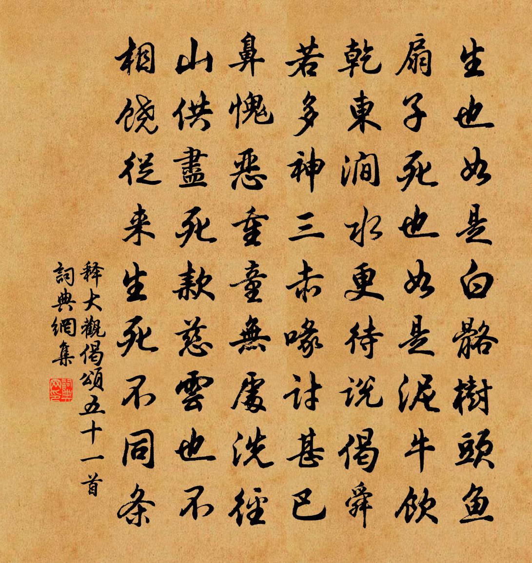 詩詞名句歷史字典書法欣賞書法字典國語詞典說文解字康熙字典古漢語字典標 題 作 者 詩 句 偈頌五十一首作者:釋大觀 朝代:宋代偈頌五十一首原文生也如是,白骼樹頭魚扇子。死也如是,泥牛飲乾東澗水。更待說偈,舜若多神三赤喙。討甚巴鼻,愧惡重童無處洗。徑山供盡死款,慈雲也不相饒,從來生死不同條。詩詞問答問:偈頌五十一首的作者是誰?答:釋大觀問:偈頌五十一首寫於哪個朝代?答:宋代釋大觀偈頌五十一首書法欣賞偈頌五十一首書法作品詩詞推薦青城洞陽大人張繼先〔宋代〕青城老洞翁,名籍丹台上。日日誦黃庭,感得祥雲降。鞦韆二首李覯〔宋代〕華郭春光欲暮時,采繩爭蹴夜忘歸。佳人不道羅紈重,擬共楊花苦鬥飛。掛金索王玠〔元代〕一更端坐,下手調元*。混沌無言,絕念存真意。呼吸綿綿,配合居中位。撥轉些兒,黍米藏天地。讀張籍古樂府白居易〔唐代〕張君何為者?業文三十春。尤工樂府詩,舉代少其倫。為詩意如何?六義互鋪陳。風雅比興外,未嘗著空文。讀君無事宋伯仁〔宋代〕日日溪頭看好山,塵囂無一可相關。梅花未必能如我,花謝花開未得閒。感春郭印〔宋代〕春光不覺老,兀坐掩深扉。寇盜時聞說,山林未忍歸。心驚幽鳥語,眼眩雜花飛。何日乾坤靜,餘生得所依。寒松賦李紳〔唐代〕 松之生也,於岩之側。流俗不顧,匠人未識。無地勢以炫容,有天機而作色。徒觀其貞枝肅矗,直乾芊眠,倚杜門宋庠〔宋代〕苫宇切郊寰,荊扉度歲關。賓綦秋蘚合,童唱暮薪還。石上舂粱苦,牆東避世難。扊扅酋可爨,誰訪陋居顏。和余處恭贈方士閻都乾楊萬里〔宋代〕河出崑崙江出岷,風吹不斷浪花春。但看此水源無竭,底用玄談谷有神。老健便為仙放杖,斧斤秪在鞋生塵。東家送吳給事自許昌移淮西梅堯臣〔宋代〕直道昔參輔,獨將天下憂。忠言悟明主,退請拜諸侯。坐合政方舉,移藩心所求。蔡人迎且喜,許俗愛難留。夾路田家嘆趙蕃〔宋代〕春欲耕時天不雨,小雪不能濡旱土。辛勤僅得遍鉏耰,浸種可憐溝脈縷。忽然一雨催插秧,東阡西陌青相望。謂茲挽潼帥許侍郎成子三首程公許〔宋代〕天地英靈氣,風雲感會期。龍頭推蜀產,骨鯁自天知。雨露榮在妝,江湖滯一麾。甲兵何日洗,遠慮憶蓍龜。題魯山溫泉晃沖之〔宋代〕平生耳熟聞驪山,夢寐不到臨潼關。當年太液金井碧,溫泉宛在關山間。憶昔君來必十月,騎玉花驄帶風雪。太真定風波(次楊茶使七夕韻)京鏜〔宋代〕何必穿針上彩樓。剖瓜插竹訴窮愁。聞道天孫相會處,銀漢無津,不待泛蘭舟。動是隔年尋素約,何似,每逢清夢柴門晚步張嵲〔宋代〕柴門一延竚,暮色集四山。雨歇林藹變,歲陰嵐氣寒。峰高看月上,巢昏遲烏還。游眺暫自適,裴回反長嘆。幽思祭侃古樵塔釋善珍〔宋代〕嘉定之間,公壯我少。意氣盡同,豈但同調。眾夸蠅聲,而出蚓竅。一唱十和,撫掌稱妙。公獨雄渾,間見奇峭。秋懷二首張嵲〔宋代〕浙河十月菊猶斑,客御貂裘未覺寒。遲暮更知為客惡,羈窮猶自借書看。朔風幾夜驅鴻雁,苦雨驚時損蕙蘭。安得玉樓春陳允平〔宋代〕東風躍馬長安道。一樹櫻桃花謝了。別來千里夢頻歸,醉里五更愁不到。江南兩岸無名草。雨遍莓苔生嫩葆。玉樓劉秀才宅對弈歐陽修〔宋代〕烏巷招邀謝墅中,紫囊香佩更臨風。塵驚野火遙知獵,目送雲羅但聽鴻。六著比犀鳴博勝,百嬌柘矢捧壺空。解衣巫山高鄒登龍〔宋代〕巫山龍嵷巫峽曲,一十二峰淺凝綠。老猿化石懸巔崖,矗矗陵雲掃壇竹。九靈少女列仙從,佩玉鳴鑾乘彩鳳。飛魂名句推薦昔在零陵厭,神器若無依。何遜《行經孫氏陵》 大廈將顛,非一木所支也。王通《中說·卷三·事君篇》 君子無入而不自得焉。子思《中庸·第十四章》 西陸蟬聲唱,南冠客思深。駱賓王《詠蟬 / 在獄詠蟬》 生長富貴叢中的,嗜欲如猛火、權勢似烈焰。洪應明《菜根譚·概論》 靈山多秀色,空水共氤氳。張九齡《湖口望廬山瀑布泉 / 湖口望廬山瀑布水》 凡庸之性,後夫多寵前夫之孤,後妻必虐前妻之子。顏之推《顏氏家訓·後娶篇》 盡道隋亡為此河,至今千里賴通波。皮日休《汴河懷古二首》 造物無言卻有情,每於寒盡覺春生。張維屏《新雷》 長江悲已滯,萬里念將歸。王勃《山中》