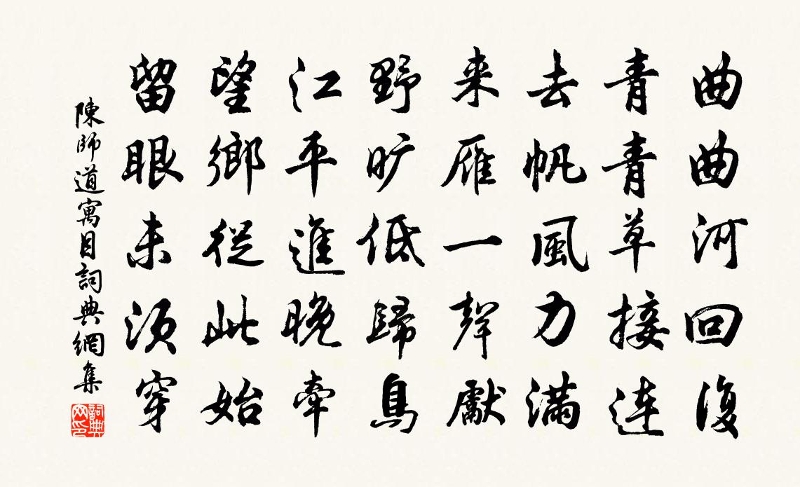 詩詞名句歷史字典書法欣賞書法字典國語詞典說文解字康熙字典古漢語字典標 題 作 者 詩 句 寓目作者:陳師道 朝代:宋代寓目原文曲曲河回復,青青草接連。去帆風力滿,來雁一聲先。野曠低歸鳥,江平進晚牽。望鄉從此始,留眼未須穿。詩詞問答問:寓目的作者是誰?答:陳師道問:寓目寫於哪個朝代?答:宋代問:陳師道的名句有哪些?答:陳師道名句大全陳師道寓目書法欣賞寓目書法作品詩詞推薦次韻餘子侯游石泵黃公度〔宋代〕竹杖椶鞋意自便,蘚牆莎徑色相鮮。平疇漲麥雲連海,絕壁蟠松蓋倚天。竟日虎岩延眺矚,何時蟹井費攀緣。歸來十一月二十三日趙蕃〔宋代〕正爾元無事,胡然不自聊。髯衰紛若雪,梅早綴如椒。太白傾殘榼,方爐爇柿樵。宦才成此味,隱莫待渠招。南海館中王珪〔唐代〕嶺外經年逐斷蓬,孤吟廢館幾宵中。燈回秋壁耿鄉夢,雨送夜潮飄海風。靖節久拋三徑樂,子云坐漢十金空。何時李提刑李參政再和招鶴詩再用韻以謝魏了翁〔宋代〕錦江相去幾何哉,未見窗前落雪皚。聲氣同時無間斷,有時夜半掠江來。恭和聞喜宴賜毛自知以下御製魏了翁〔宋代〕昭代賓賢禮意誠,鎬京設席藹儒纓。龍飛十二周星紀,鵬運三千擊水程。對花黃庶〔宋代〕詩昔甫白在,造化困刀尺。我生幾年後,浪自鐫頑石。對花雖把筆,好句恨莫得。耒陽與採石,孤墳沒荊棘。幾欲書黁公詩後(並敘)蘇軾〔宋代〕過加祿鎮南二十五里大許店,休焉於逆旅祁宗祥家。見壁上有幅紙題詩云:滿院秋光濃欲滴,老僧倚杖青松側。只偈頌一百二十三首釋崇岳〔宋代〕今朝結制,叢林體例。長期短期,似兀如痴。離四句,絕百非,大家相聚吃莖虀。解珮環(尋梅不見)彭元遜〔宋代〕江空不渡,恨蘼蕪杜若,零落無數。遠道荒寒,婉娩流年,望望美人遲暮。風煙雨雪陰晴晚,更何須,春風千樹。親耕籍田七首佚名〔宋代〕群公灰相,奉事齊莊。率時農天,舉耜載揚。播厥百台,以佑我皇。多黍多稌,丕應農祥。生朝二首楊公遠〔宋代〕七年客里度初生,詩骨依然只鶴形。梅亦清臞須卻白,吾將潦倒鬢還青。愧無德可書銀管,幸有酒堪儲玉瓶。一點寄秋懷趙蕃〔宋代〕我不識裘父,聞之空有年。曾題五字寄,僅以尺書旋。諸才沒已久,故家誰復賢。猶欣得吾子,句法早親傳。青玉案黃公度〔宋代〕鄰雞不管離懷苦,又還是、催人去。回首高城音信阻。霜橋月館,水村煙市,總是思君處。裛殘別袖燕支雨,謾留雲徐夤〔唐代〕漠漠沈沈向夕暉,蒼梧巫峽兩相依。天心白日休空蔽,海上故山應自歸。似蓋好臨千乘載,如羅堪剪六銖衣。為霖環碧寒甚移宿客邸劉克莊〔宋代〕香歇朝衣懶更熏,夢殘宮漏遠難聞。漫郎不稱青綾被,退士惟堪白布裙。戲謝張端衡惠牡丹並湯鵝劉宰〔宋代〕右軍渾脫從花王,老子開盤喜欲狂。擬插一枝無稱面,浪餐鵝炙愧劉郎。木蘭花慢 送季治書張伯淳〔元代〕羨高標雅量,窗八面,更玲瓏。每風日佳時,湖山清處,袍錦從容。不把雲霄自隔,向尊前、看我嘯吟中。人世流夜和陳道士韻仇遠〔宋代〕石銚溪芽活火烹,旋燒敗葉帶枯藤。路遙難遞中{氵霝}水,且試梅花澗底冰。洞仙歌朱彝尊〔清代〕三竿日出,愛調妝人近。鳧藻熏爐正香潤。看櫻桃小注,桂葉輕描。圖畫裡只少耳邊朱暈。金簪二寸短,留結殷勤紹興祀高禖十首佚名〔宋代〕[圜鍾為宮]聿分春氣,施主在時。禖宮筆啟,精意以祠。禮備告備,神其格思。厥靈有赫,錫我繁釐。名句推薦無人解,樹轉午陰涼舒頔《小重山·端午》 百川東到海,何時復西歸?佚名《長歌行》 名無固實,約之以命實,約定俗成,謂之實名。荀子《荀子·正名》 高或入於虛,華或入於浮,而虛浮之士,究難指為高華。王永彬《圍爐夜話·第一一O則》 閒鷺棲常早,秋花落更遲。錢起《谷口書齋寄楊補闕》 亂碧萋萋,雨後江天曉。梅堯臣《蘇幕遮·草》 東風吹雨過青山,卻望千門草色閒。盧綸《長安春望》 相思只在夢魂中。今宵月,偏照小樓東。何大圭《小重山·綠樹鶯啼春正濃》 燕子飛時,綠水人家繞。枝上柳綿吹又少。蘇軾《蝶戀花·春景》 今宵酒醒何處?楊柳岸,曉風殘月。柳永《雨霖鈴·寒蟬淒切》