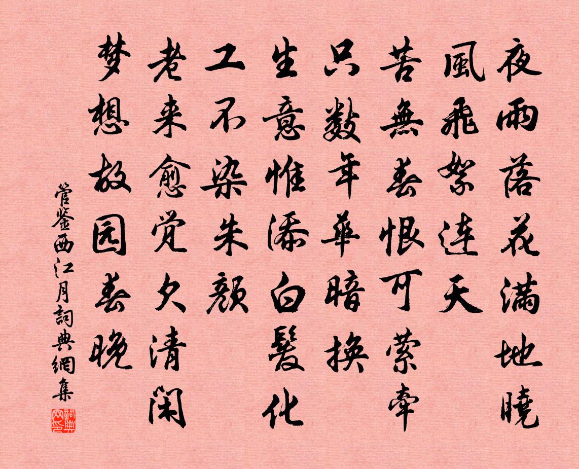 詩詞名句歷史字典書法欣賞書法字典國語詞典說文解字康熙字典古漢語字典標 題 作 者 詩 句 西江月作者:管鑒 朝代:宋代西江月原文夜雨落花滿地,曉風飛絮連天。苦無春恨可縈牽。只數年華暗換。生意惟添白髮,化工不染朱顏。老來愈覺欠清閒。夢想故園春晚。詩詞問答問:西江月的作者是誰?答:管鑒問:西江月寫於哪個朝代?答:宋代問:西江月是什麼體裁?答:詞管鑒西江月書法欣賞西江月書法作品詩詞推薦宮詞十首張樞〔宋代〕翠枝斜插滴金花,特髻低蟠貼水荷。應奉人多宣喚少,海棠花下看飛梭。唐世有刺郡江表者時宰囑以新淦出筆……岳珂〔宋代〕世間示必無皋夔,九疑虞舜不可追。武皇銳意開絕漠,推鋒乃亦有衛霍。嗟哉格物本一理,僱人所用何如耳。筆工末秋到家潘圖〔唐代〕歸來無所利,骨肉亦不喜。黃犬卻有情,當門臥搖尾。秋興陸游〔宋代〕淹速從來但信緣,襟懷無日不超然。喚船渡口因閒立,待飯僧床得蹔眠。送張山甫武功簿梅堯臣〔宋代〕洛陽舊交有七人,五人已為泉下塵。各家生兒為門戶,唯子弟兄先立身。我與信都侯獨在,喜見及祿知天仁。昨日懷歸呈同官曹勛〔宋代〕老去光陰易變遷,佳時常在淚痕邊。一寒休待綈袍惠,二頃須資負郭田。邀客預留醅下酒,憑欄閒數渡頭船。此身和雲心除夕韻胡仲弓〔宋代〕歲除明日是,心事落梅邊。節物催雙鬢,情懷欠少年。桃符依帖寫,竹爆應聲圓。椒頌無人獻,酴酥亦自煎。河間文天祥〔宋代〕江南車蓋走燕山,老子旁觀袖手閒。見說新詩題甲子,桃源元只在人間。送張南史(效何記室體)皇甫冉〔唐代〕馬卿工詞賦,位下年將暮。謝客愛雲山,家貧身不閒。風波杳未極,幾處逢相識。富貴人皆變,誰能念貧賤。岸有張持荷以詩見約同沈無隱賞梅因得絕句奉謝喻良能〔宋代〕結齋風味如和靖,況有凌風百尺台。雪霽春新多辦酒,兩翁乘興欲尋梅。潮溝馬之純〔宋代〕潮溝溝外盡深泥,泥上潮生溝卻低。直向北行連運瀆,折從東去入青溪。空中不斷檣烏過,岸上相望瓦翼齊。好是山行陸游〔宋代〕七十衰翁短鬢斑,藥瓢藤杖伴清閒。平生惡路羊腸阪,晚歲羸軀飯顆山。一寸塔余青靄外,數聲鐘下翠微間。往來和歷陽守張仲智觀梅五首王之道〔宋代〕誰似樊侯哲且明,解將勳業佐中興。自憐汩沒毛錐子,空對東風詠使能。湖上村家司馬光〔宋代〕萬頃寒煙外,茅茨枕碧流。楓林巢乳鶴,沙漵亂鳴鷗。漠漠菰蒲晚,蒼蒼蘆荻秋。欲過南浦去,籬下出漁舟。紙窗方回〔宋代〕梅水仙花插古銅,紙窗通日不通風。天香何假龍涎爇,地暖無勞獸炭烘。寄贈葛朴翁徐照〔宋代〕頭上一方巾,西湖住宅新。古今稱句法,島賀是僧身。買馬因沫口,將錢或施貧。有軒名數竹,還復屬何人。喜六二弟生子劉克莊〔宋代〕邵子生男四十五,弟今方邵過三年。莫隨夷甫舉遺逸,且教伯溫成大賢。洛下耆英為汝喜,河南聞見待渠傳。會當范資政早饌帖贊岳珂〔宋代〕元佑多世臣。公之德,由忠文。岷有阜,江有源。傳是帖,存名門。過縉雲胡君作茶古松下叢蘭中方岳〔宋代〕十丈蒼皮帶雪僵,山雲歸晚泊書床。不緣曾讀離騷熟,蘭亦欺人未肯香。卜運算元康與之〔宋代〕潮生浦口雲,潮落津頭樹。潮本無心落又生,人自來還去。今古短長亭,送往迎來處。老盡東西南北人,亭下潮如名句推薦普天皆滅焰,匝地盡藏煙。沈佺期《寒食》 江豚吹浪立,沙鳥得魚閒。薛時雨《臨江仙·大風雨過馬當山》 柳帶搖風漢水濱,平蕪兩岸爭勻。牛希濟《臨江仙·柳帶搖風漢水濱》 窮猿投林,豈暇擇木!房玄齡《晉書·列傳·第六十二章》 何當金絡腦,快走踏清秋。李賀《馬詩二十三首》 夫禮之初,始諸飲食戴聖《禮記·禮運》 知人者智,自知者明。勝人者有力,自勝者強。知足者富。強行者有志。老子《老子·道經·第三十三章》 但存方寸地,留與子孫耕。馮夢龍《喻世明言·卷二十二》 慈母手中線,遊子身上衣。孟郊《遊子吟 / 迎母漂上作》 愁因薄暮起,興是清秋發。孟浩然《秋登蘭山寄張五》