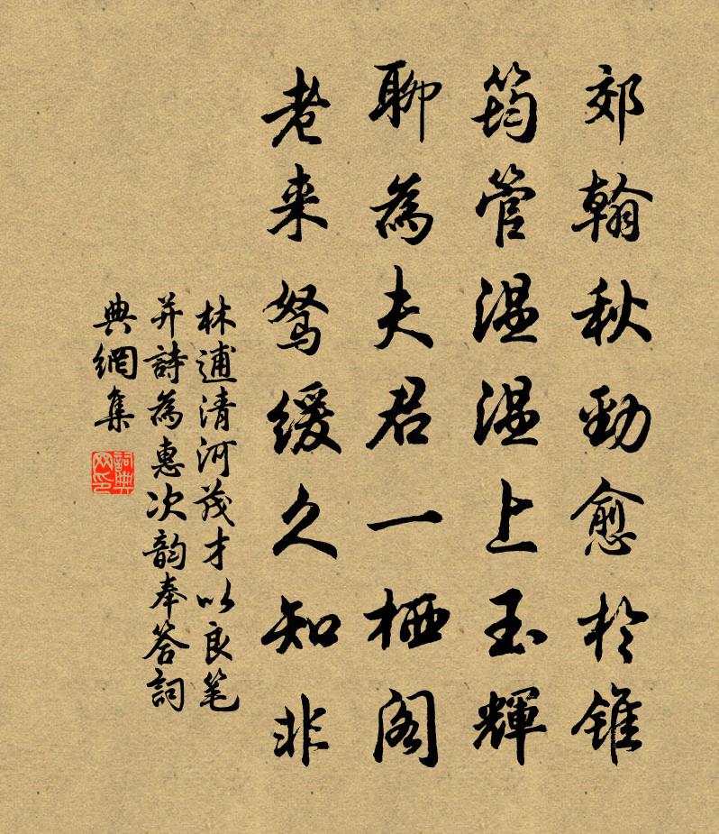 詩詞名句歷史字典書法欣賞書法字典國語詞典說文解字康熙字典古漢語字典標 題 作 者 詩 句 清河茂才以良筆並詩為惠次韻奉答作者:林逋 朝代:宋代原文郊翰秋勁愈於錐,筠管溫溫上玉輝。聊為夫君一棲閣,老來駑緩久知非。詩詞問答問:《清河茂才以良筆並詩為惠次韻奉答》的作者是誰?答:林逋問:該詩寫於哪個朝代?答:宋代書法欣賞清河茂才以良筆並詩為惠次韻奉答書法作品詩詞推薦過故洛城許棠〔唐代〕七百數還窮,城池一旦空。夕陽唯照草,危堞不勝風。岸斷河聲別,田荒野色同。去來皆過客,何處問遺宮。室吟邵雍〔宋代〕一室可容身,四時長有春。何嘗無美酒,未始絕佳賓。洞裡賞花者,天邊泛月人。相逢應有語,笑我太因循。竹夫人郭印〔宋代〕林下風流在,收歸枕簟傍。冰肌元本淨,玉骨自然涼。最是虛心好,由來正節剛。炎天長作伴,晝夜不能忘。謁金門(春情)趙善扛〔宋代〕新雨霽。開遍滿園桃李。波暖池塘風細細。一雙花鴨戲。喚起春融睡美。扶醉宿妝慵理。移步避入花影里。繡裙低西村醉歸陸游〔宋代〕俠氣崢嶸蓋九州,一生常恥為身謀。酒寧剩欠尋常債,劍不虛施細碎讎。歧路凋零白羽箭,風霜破弊黑貂裘。陽狂比得貍一枚所過輒馥然有香時時翳蘭叢下而引毛滂〔宋代〕春山得貍軀脅細,蒼頭抱攜香著袂。叢蘭密處曲庇身,狐鼠何疑相睥睨。定非青丘阿紫家,恐是中台餐柏裔。太真長思仙 本名長相思 贈平山劉志常、神山劉王丹桂〔元代〕平山劉。神山劉。更易俗流作道流。人情誓莫留。悟驊騮。悟驊騮。燦燦神珠得自由。光明常逗遛。奉和御製讀後魏書夏竦〔宋代〕高祖寬仁高,哀矜信有餘。嚴刑幾盡措,黎庶獲安居。舊法躬刊定,繁文再劃除。既平財謁路,清白勵簪裾。歸嵩山作王維〔唐代〕清川帶長薄,車馬去閒閒。流水如有意,暮禽相與還。荒城臨古渡,落日滿秋山。迢遞嵩高下,歸來且閉關。昭國閒居白居易〔唐代〕貧閒日高起,門巷晝寂寂。時暑放朝參,天陰少人客。槐花滿田地,僅絕人行跡。獨在一床眠,清涼風雨夕。勿嫌綺羅香陳著〔宋代〕裊入風腔,清含露脈,聲在絲絲煙碧。破暑吹涼,天付弄嬌雙腋。似戀戀、舞翠纖腰,斷還續、忍相離拆。最歡時聽蛙方君作八老詩效顰各賦一首內三題餘四十劉克莊〔宋代〕劉叟衣裝絳老年,市中賣藥且隨緣。馳名最久經三世,閱病雖多未十全。龜手有方俄貴矣,烏髭無訣觸皤然。臥聞失調名佚名〔宋代〕頻歌覆手拋將過,兩行人待看回籌。仙都山胡份〔宋代〕鳥道盤空上,松根抱石生。羽人分兩舍,雞犬自聞聲。初三日晚題趙蕃〔宋代〕浮雲晚陸離,巨浪朝澎湃。櫓搖雖甚亟,岸遠不可屆。巴丘兩日中,湖路千里外。月上照遙山,修眉雨新畫。秋晚陸游〔宋代〕身世呻吟裹,園廬寂寞中。家貧憂酒券,才盡畏詩筒。陂水瀦猶滿,山苗獲欲空。兒孫更力作,勿媿禹遣風。冬日雷雨段油〔宋代〕劈面同雲布,雨共雪無數。雷又似打鼓,風又似提鋸。雹子遍四郊,電光照四處。晚了定似晴,天地撰不去。石蓮花司空曙〔唐代〕今逢石上生,本自波中有。紅艷秋風裡,誰憐眾芳後。會仙岩陶弼〔宋代〕寂寂長冥洞,涓涓漱玉泉。鳳笙聞夜半,鶴雙認雲邊。煮茗尋安老,披莎訪稚川。於中得訊息,何用買山錢。省中當直書懷呈諸同舍楊億〔宋代〕太微西掖鳳池邊,阿閣凌空瓦起煙。彩筆時批尺一詔,直廬深在九重天。早朝螭陛爐香近,書寢難人漏唱傳。祇恐名句推薦秉忠貞之誠,守退讓之實。陳壽《三國志·魏書·荀彧攸賈詡傳》 知屋漏者在宇下,知政失者在草野。王充《論衡·卷二十八·書解篇》 常恐秋節至,焜黃華葉衰。佚名《長歌行》 衰世好信鬼,愚人好求福。王充《論衡·卷二十五·解除篇》 可惜流年,憂愁風雨,樹猶如此!辛棄疾《水龍吟·登建康賞心亭》 荷葉五寸荷花嬌,貼波不礙畫船搖;石濤《荷花》 細雨魚兒出,微風燕子斜。杜甫《水檻遣心二首》 見人善,即思齊。縱去遠,以漸躋。李毓秀《弟子規·信》 凍臉有痕皆是血,酸心無恨亦成灰。曹雪芹《詠紅梅花得“梅”字》 我見君來,頓覺吾廬,溪山美哉。辛棄疾《沁園春·和吳尉子似》
